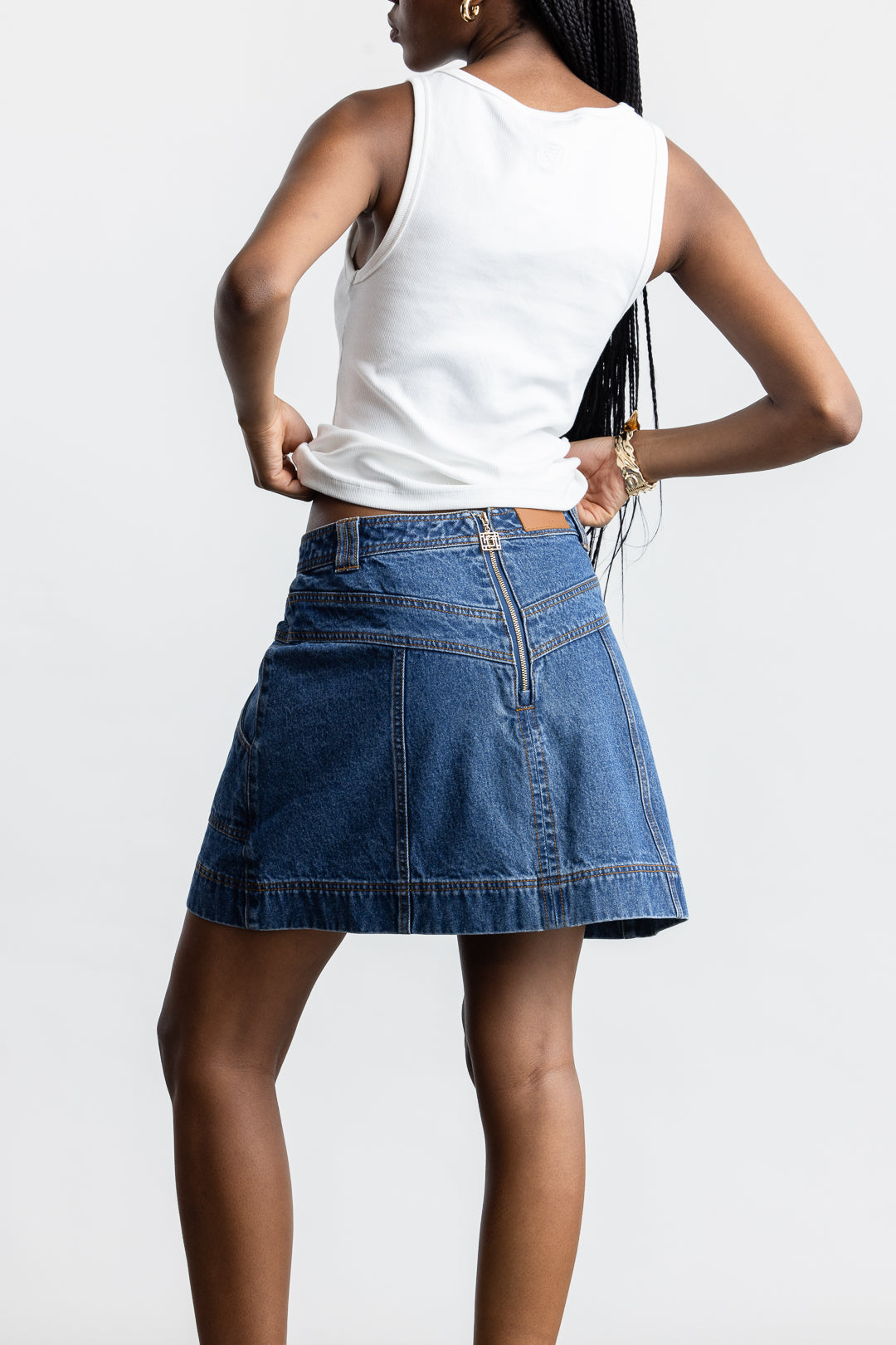 Iconic structure, reimagined for modern styling — the Masego Denim Skirt delivers timeless A-line shaping with a directional twist. Crafted in authentic mid-wash denim, it features a high-rise fit and sculpted panel seams that contour and flatter.