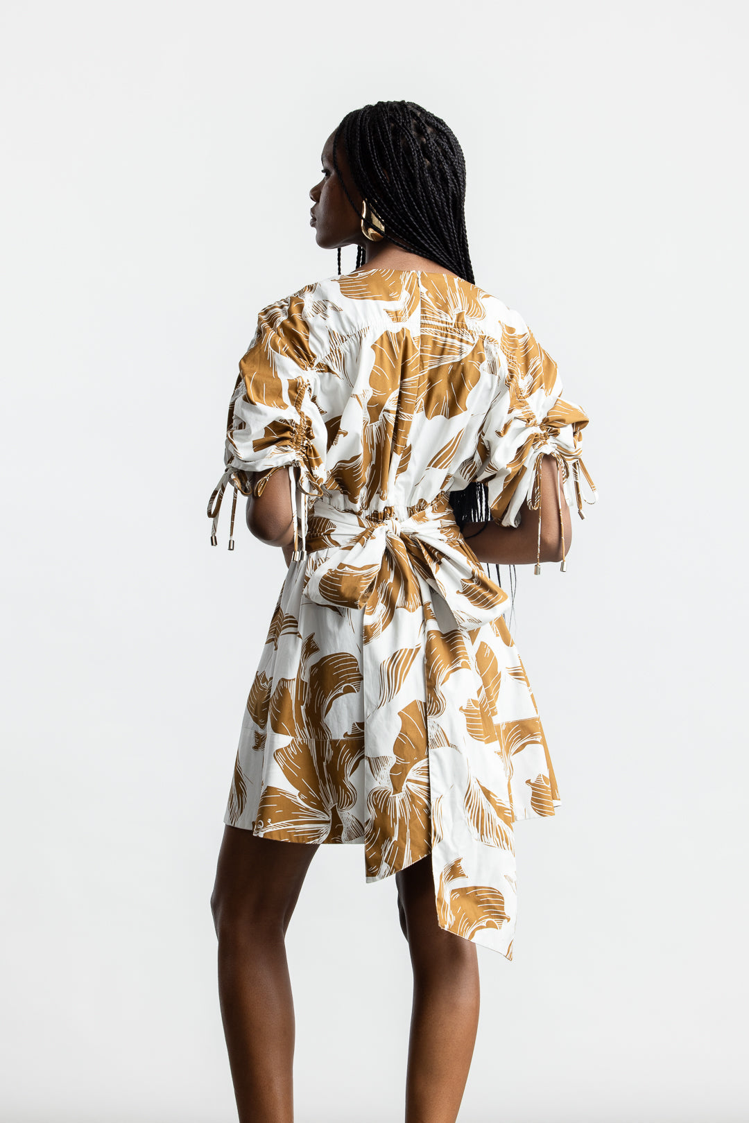 This wrap mini dress blends feminine charm with easy wearability. Designed with a flattering V-neckline and a softly structured bodice, it cinches at the waist with a self-tie belt that creates a custom fit. The short, voluminous sleeves feature adjustable drawstring ties for added shape and detail, while the flared skirt moves effortlessly with each step. Perfect for warm-weather outings, it pairs beautifully with sandals for daytime or can be elevated with heels and statement jewellery for a more polished occasion look.