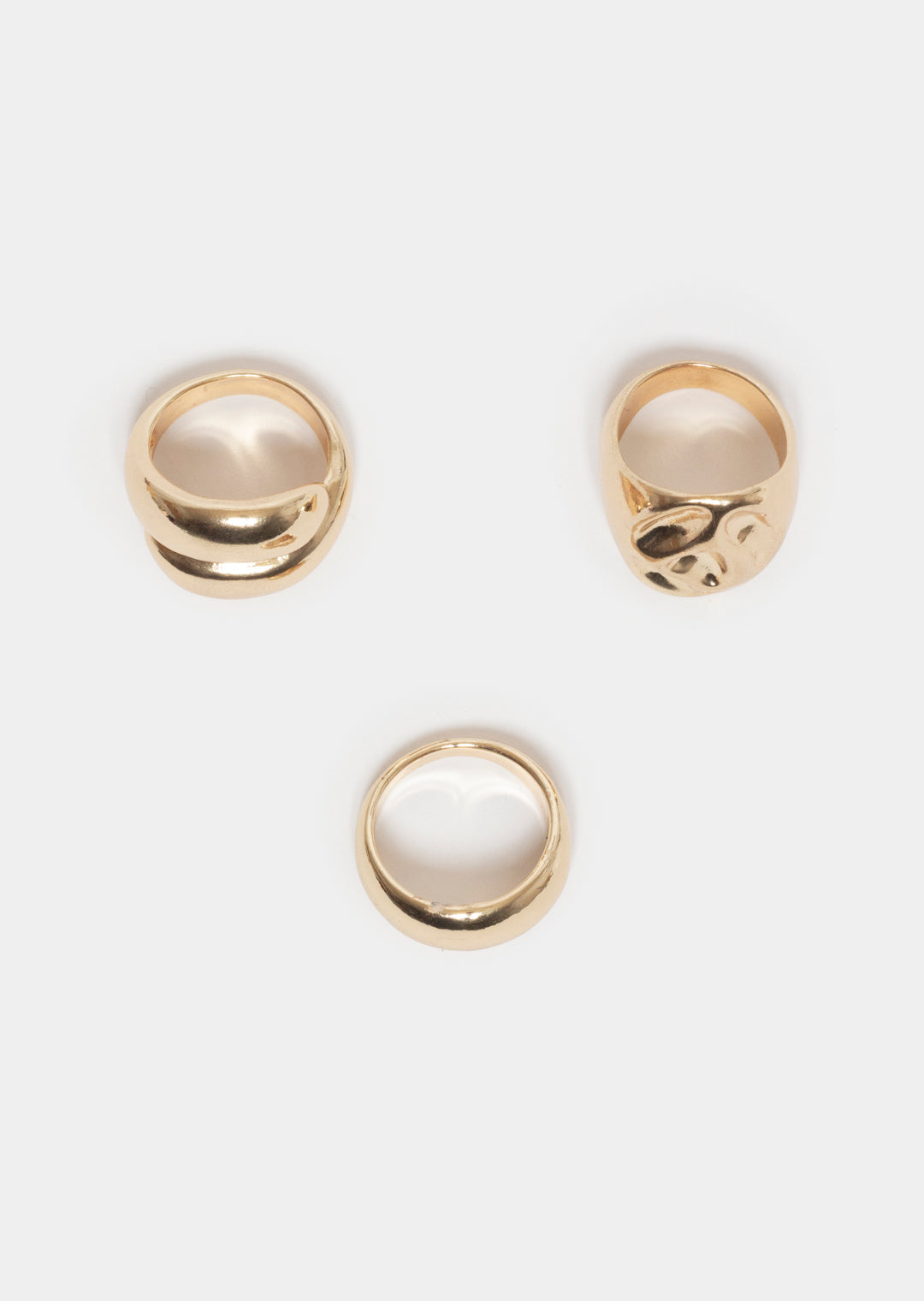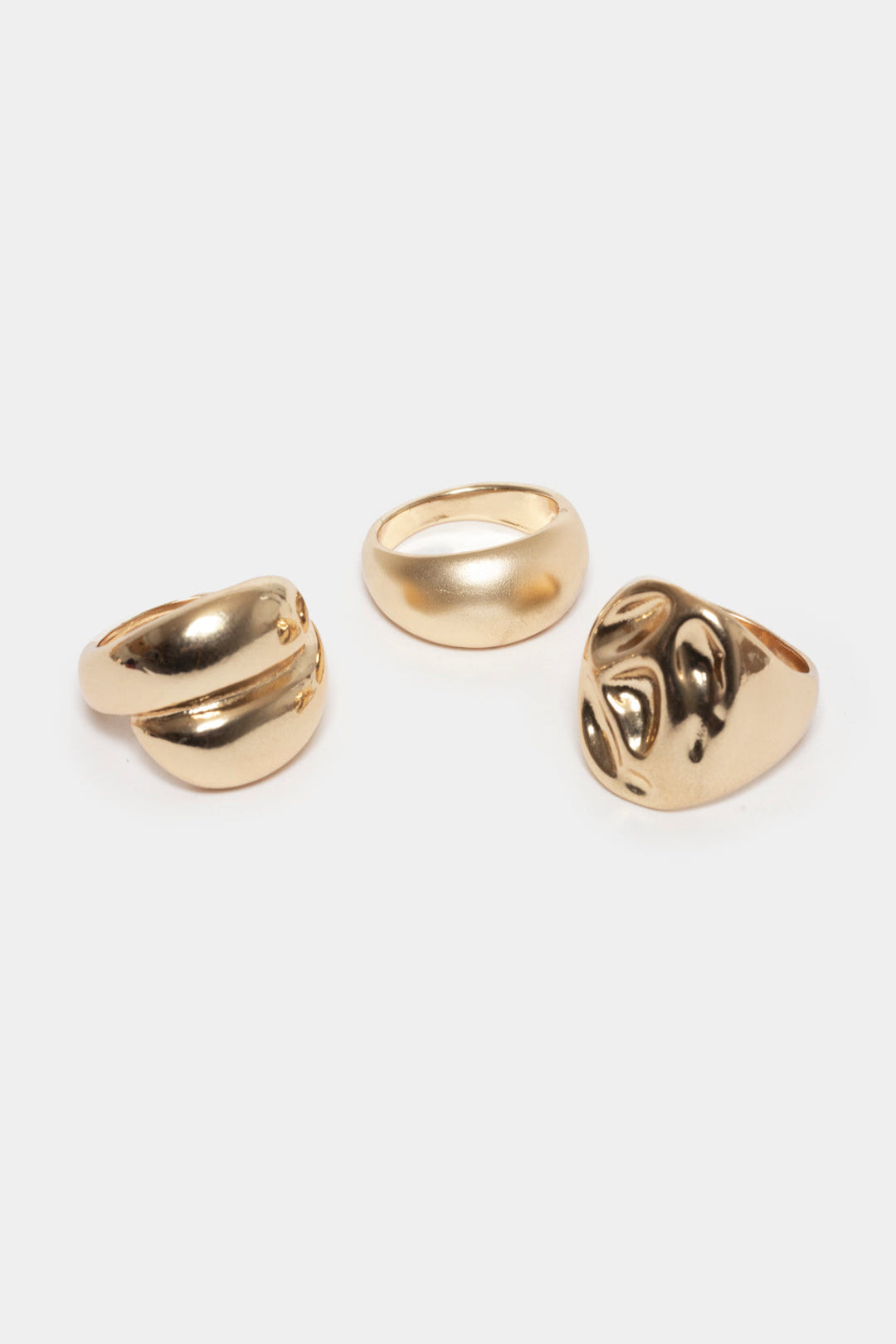 Elevate your style with this set of three chunky gold rings, each featuring unique abstract designs for an artistic touch. These statement pieces can be worn individually for subtle flair or stacked together for maximum impact.