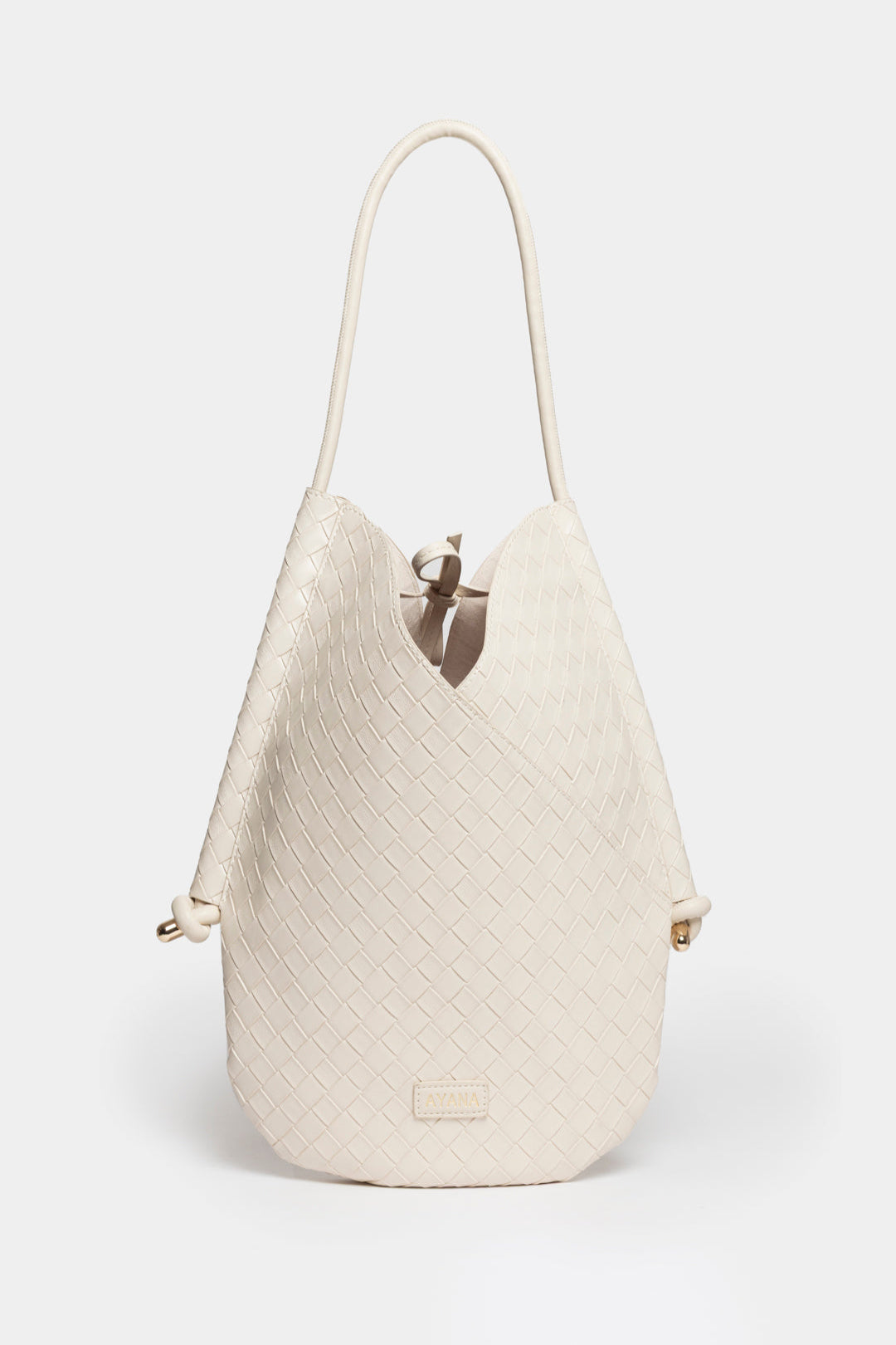 Effortlessly chic, our ‘Sue Soul Sister’ bag showcases a woven material texture that exudes natural elegance. Its standout feature is the pull-through handle, enhanced with gold hardware edging for a touch of sophistication. The overlapping design detail adds a modern and unique element, while the subtle gold branding ensures understated style.