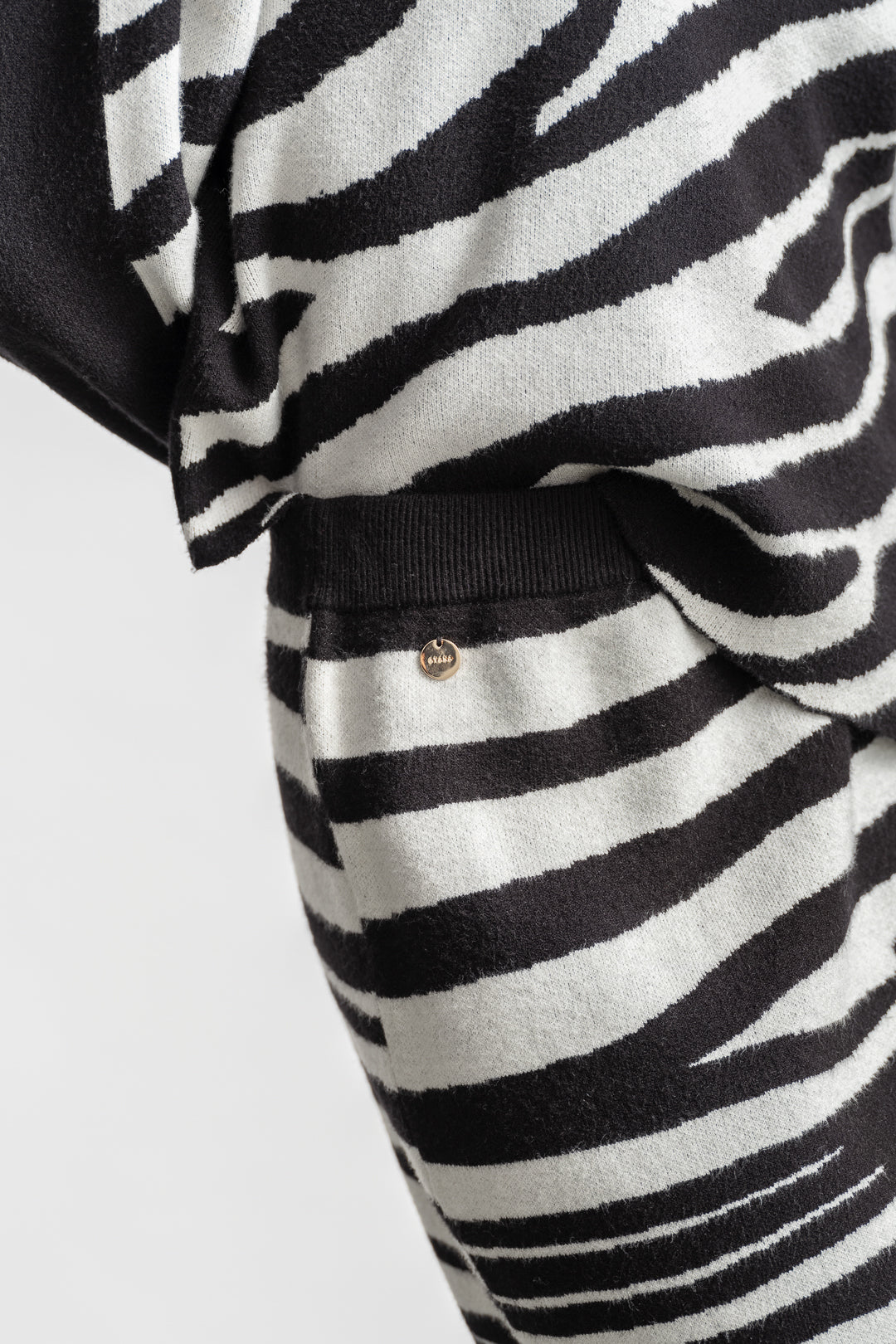 ‘Faiqah’, our maxi knitwear skirt is a bold yet elegant statement piece. The black and white zebra stripe adds a striking contrast, while the branded ingot offers a touch of refined sophistication. Crafted from stretchy knitwear, the skirt provides a flattering and forgiving fit, ensuring comfort throughout the day. Designed as part of a set, it pairs perfectly with the matching asymmetrical jumper, creating a chic, coordinated look that is both stylish and versatile.