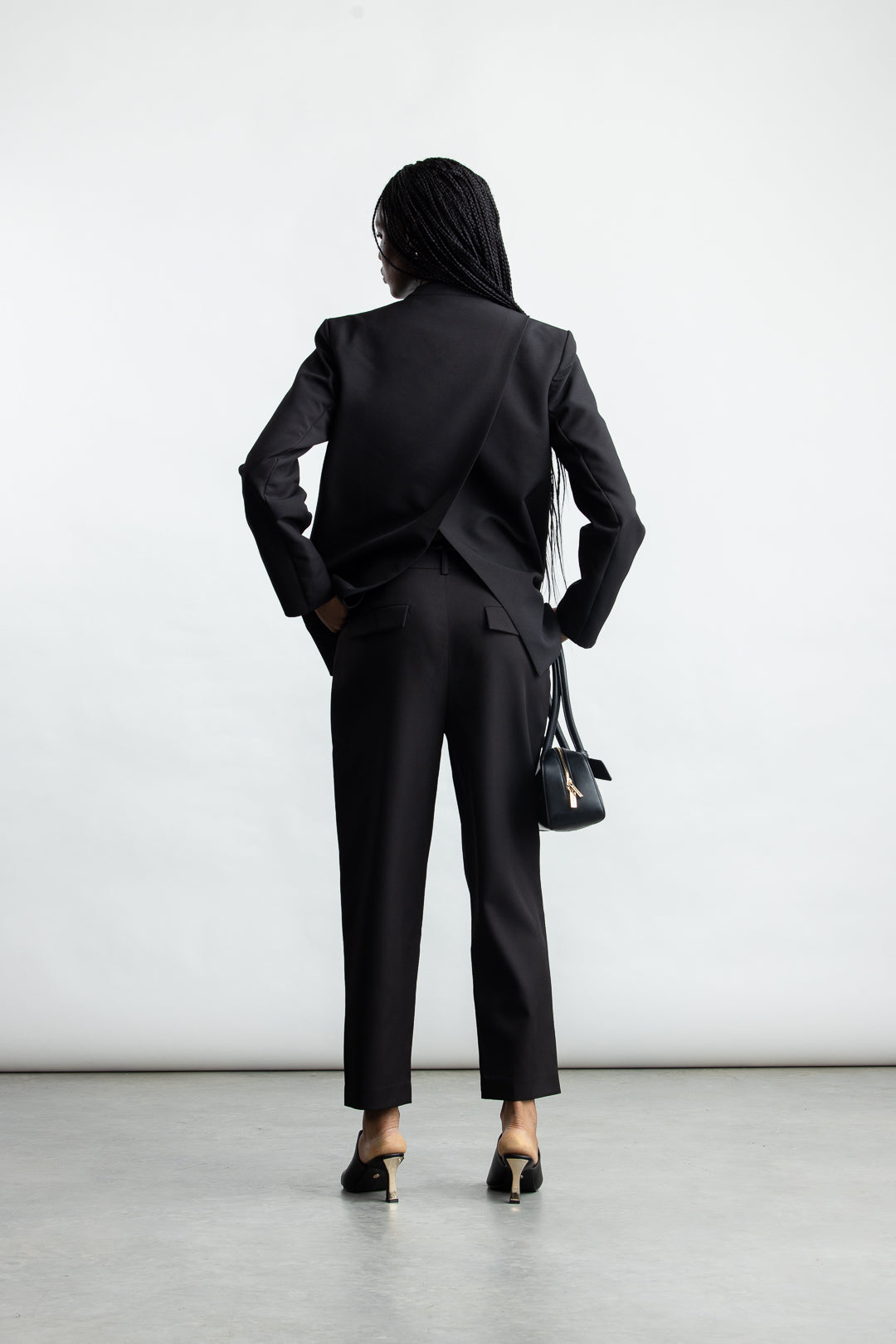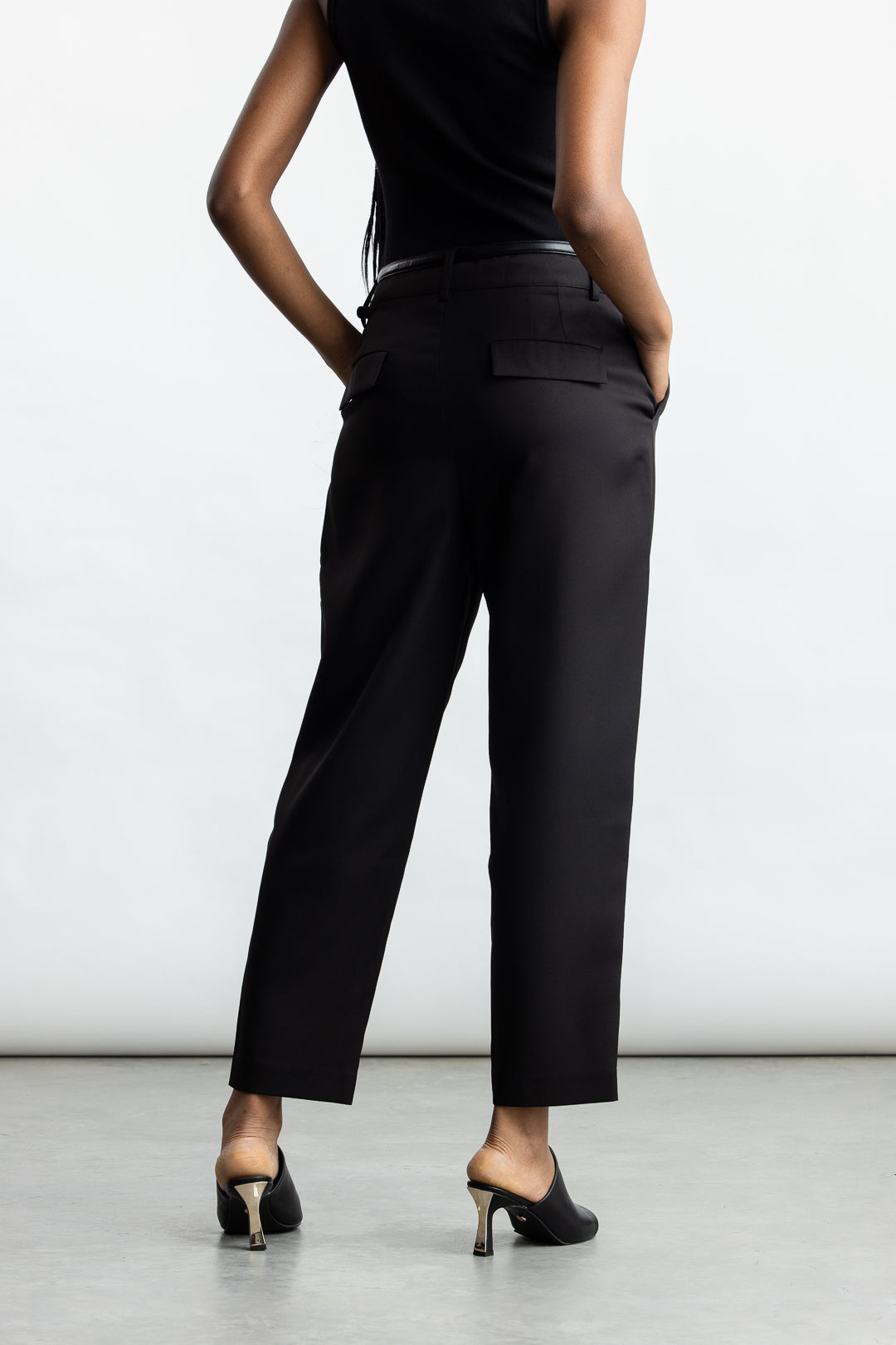 These tapered-leg formal pants blend sharp structure with subtle detail. Front pleats and slanted side pockets sculpt a refined silhouette, while hook-and-bar fasteners at fly ensure a clean finish. Enhanced with mock welt back pockets it maintains polish while a thin PU belt with a bold silver buckle adds a contemporary edge to this timeless classic.