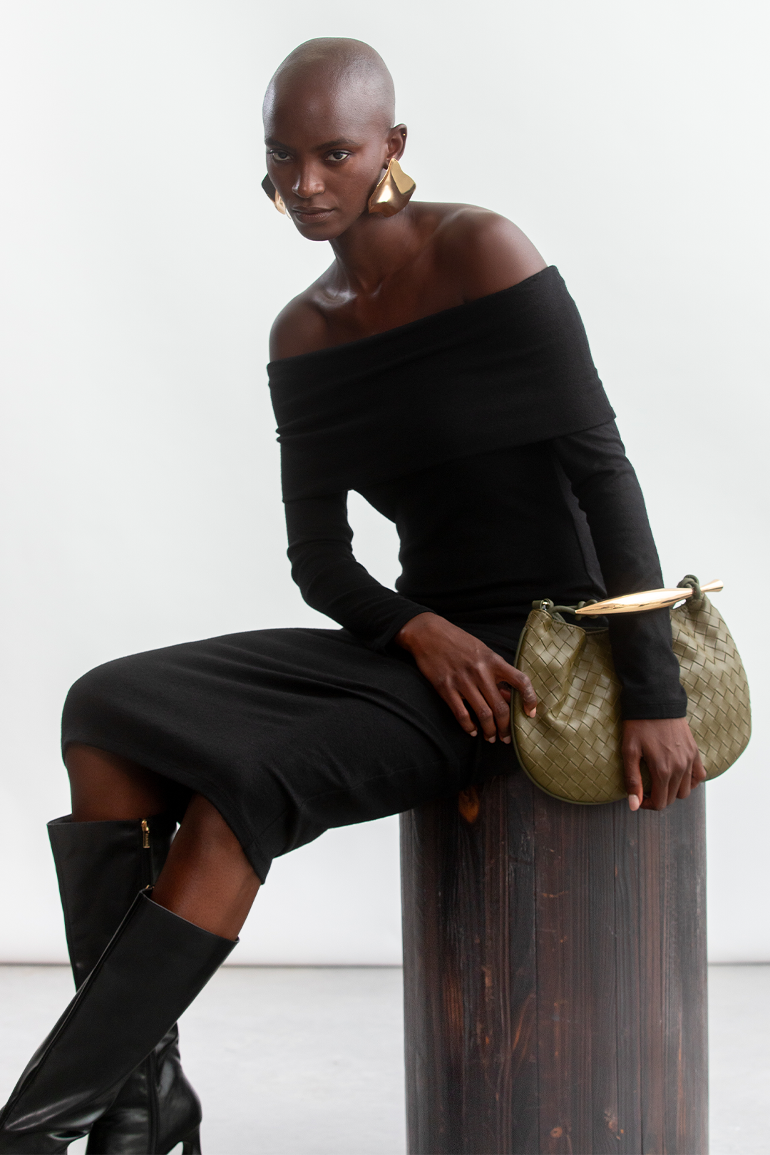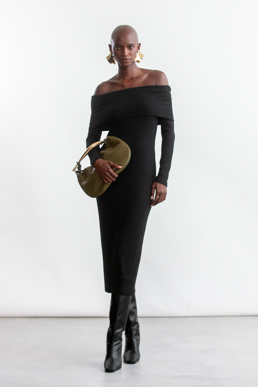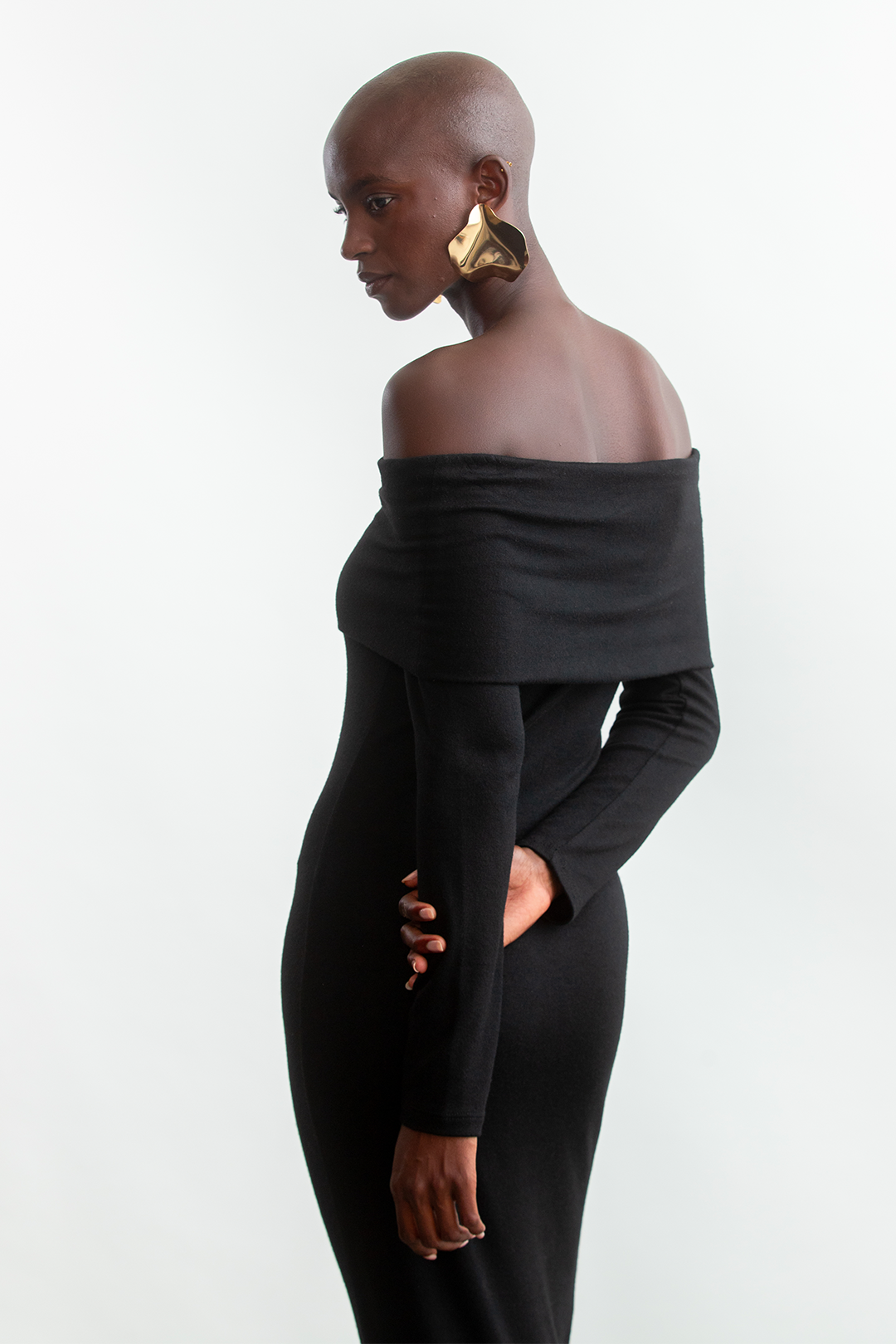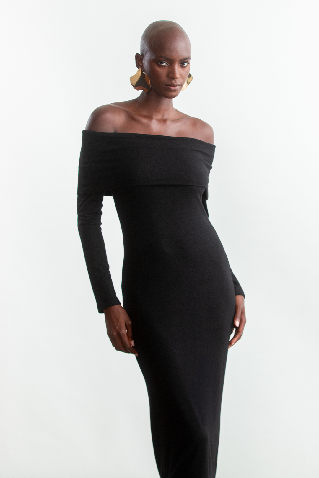 This long-sleeve, off-the-shoulder maxi knit dress is a striking, body-hugging design crafted in a cut-and-sew fabrication. The off-the-shoulder neckline adds a touch of elegance and allure, while the sleek, fitted silhouette contours the body beautifully. Perfect for making a statement, this dress combines modern sophistication with a bold, confident style