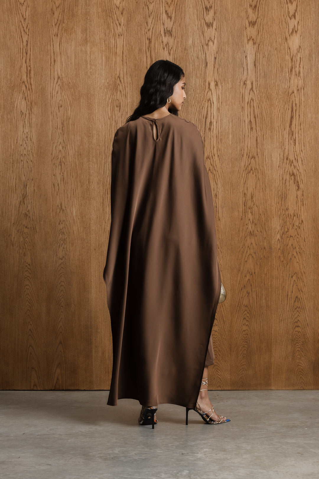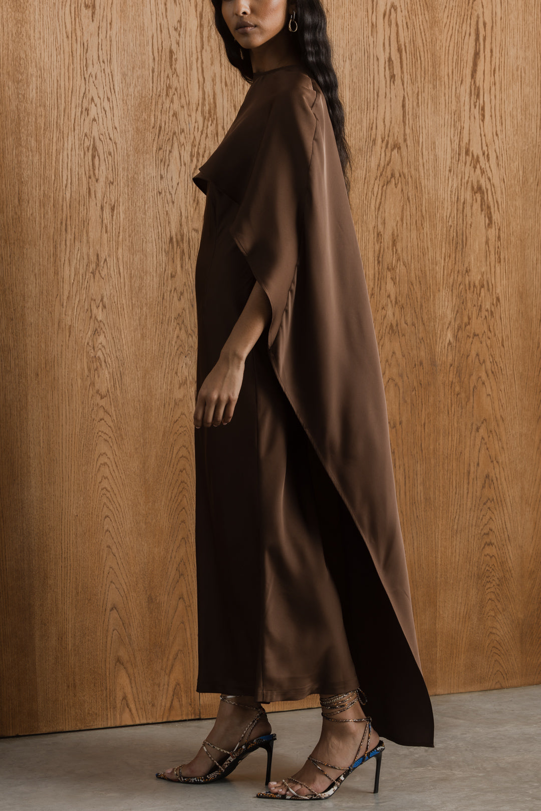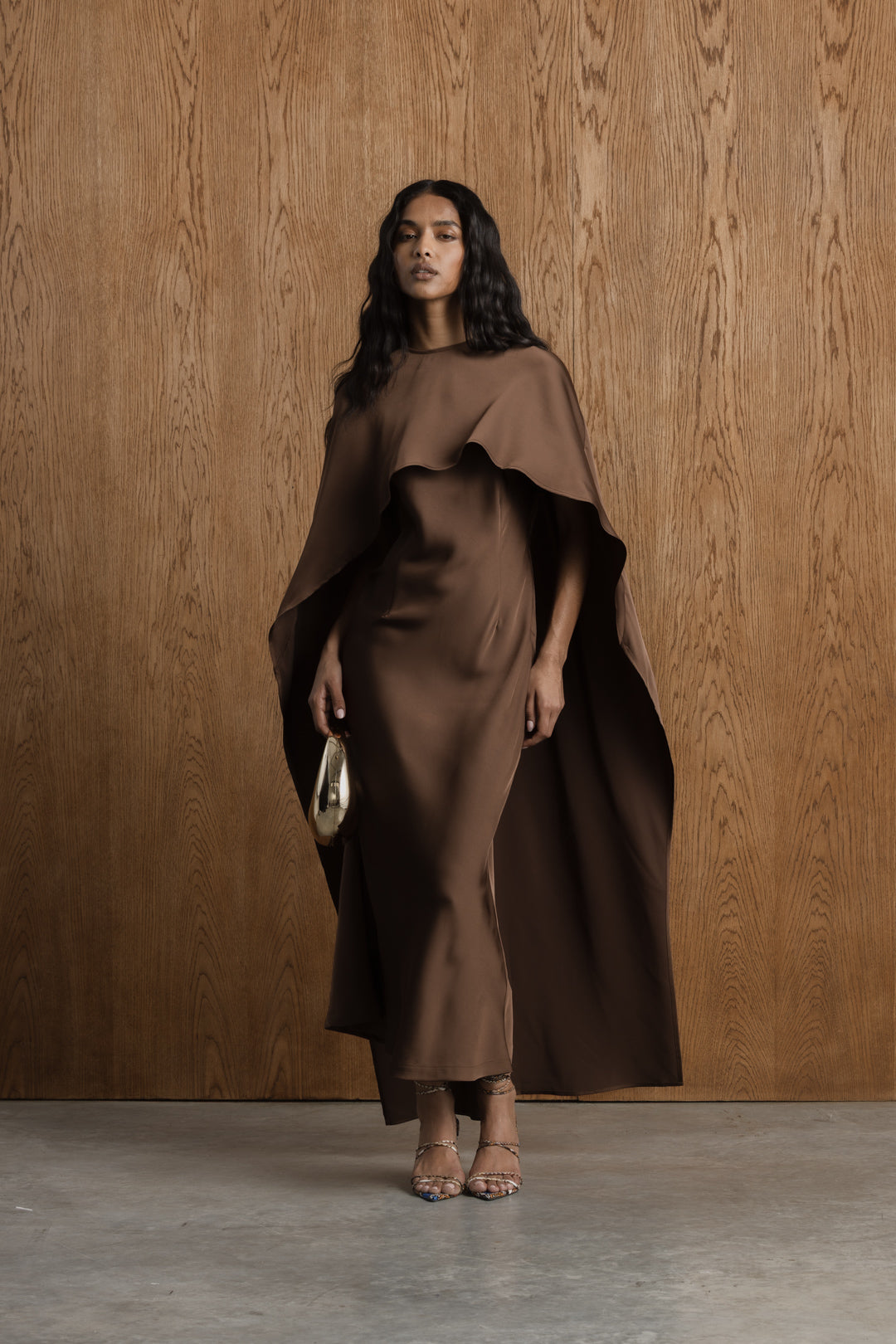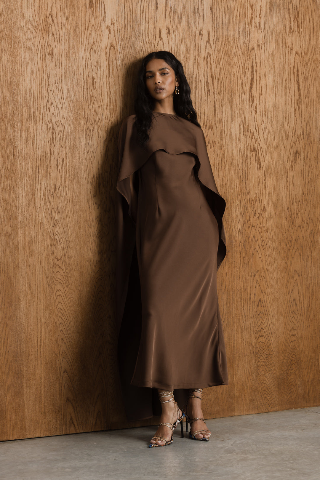This satin midi dress offers a refined balance of elegance and versatility. Designed with a sleek, sleeveless bodycon silhouette, the dress skims the body for a clean, flattering fit. A removable cape overlay adds soft movement and a sense of occasion, draping effortlessly over the shoulders for a layered look. Crafted in a smooth satin fabrication, this style transitions seamlessly from understated to elevated, making it ideal for both formal events and special occasions.