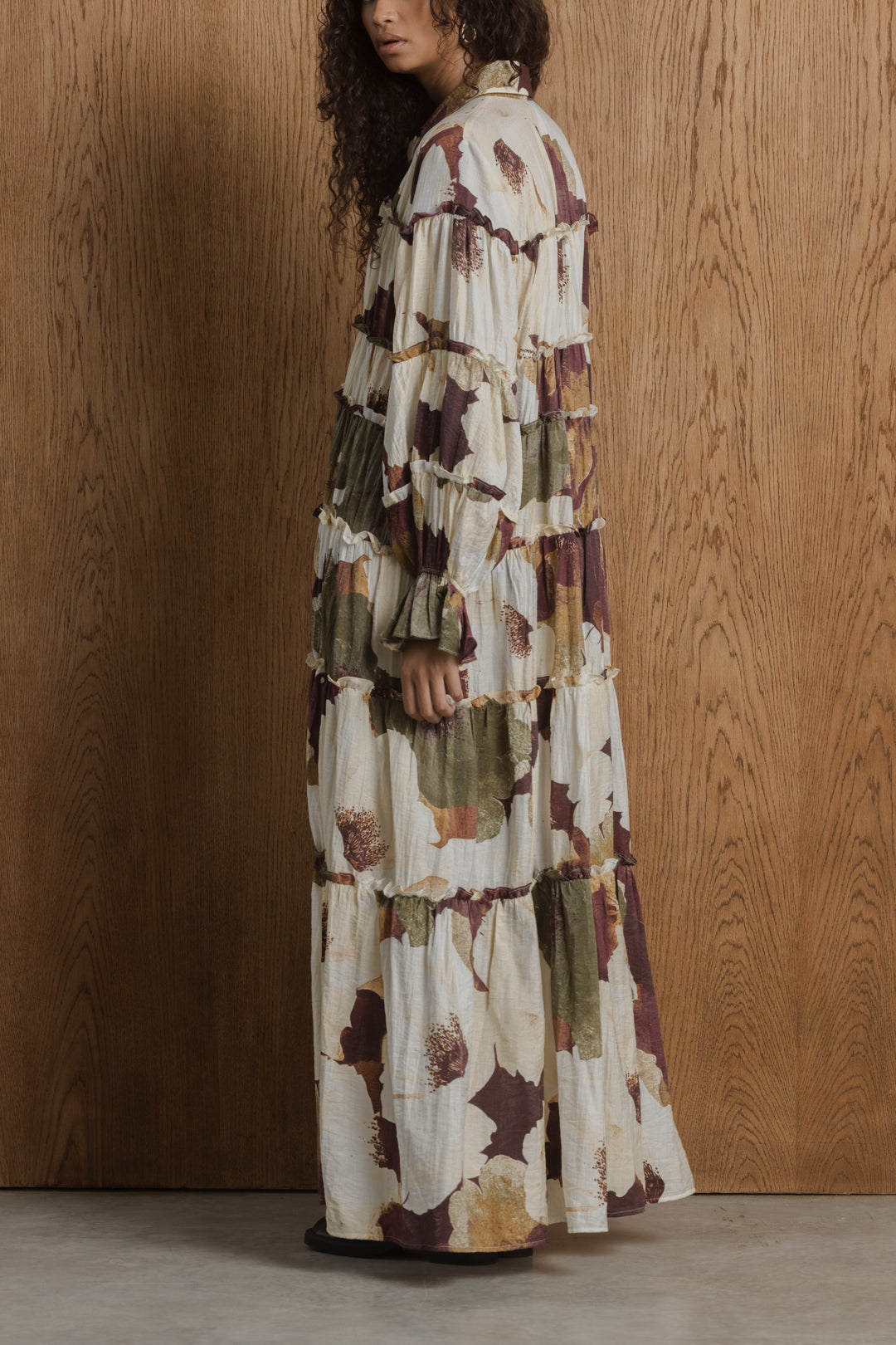 This maxi dress is made from a lightweight woven fabric with a soft, breathable feel. Designed in a relaxed, loose-fitting silhouette, it features a classic shirt collar and a partial button placket at the front. The body is constructed with multiple gathered tiers, creating volume and movement throughout.