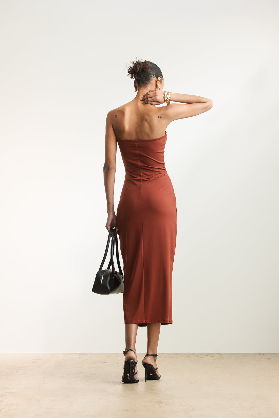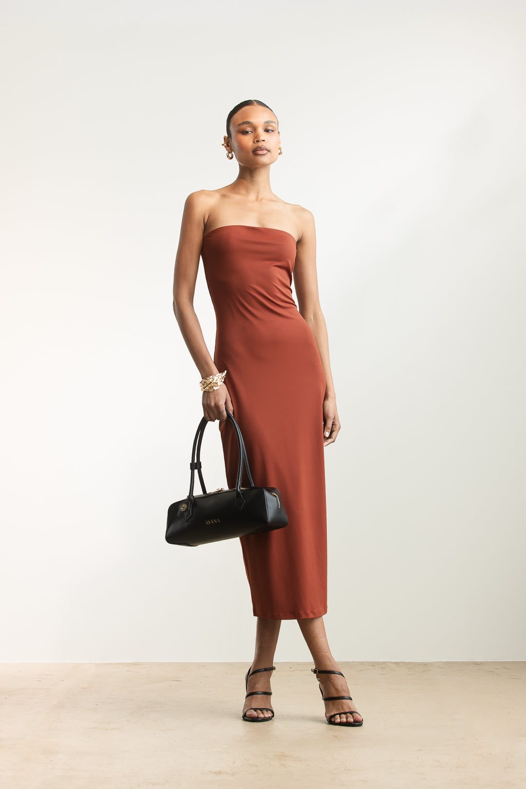 Sleek and sophisticated, this boobtube dress is crafted from polyamide for a smooth, body-contouring fit. The strapless neckline highlights the shoulders and décolletage, while the streamlined silhouette creates an elegant, elongated shape. Falling to a chic midi length, it balances comfort and allure, making it perfect for evening occasions, cocktail parties, or special events. Style it with statement earrings and strappy heels for a modern, refined look.