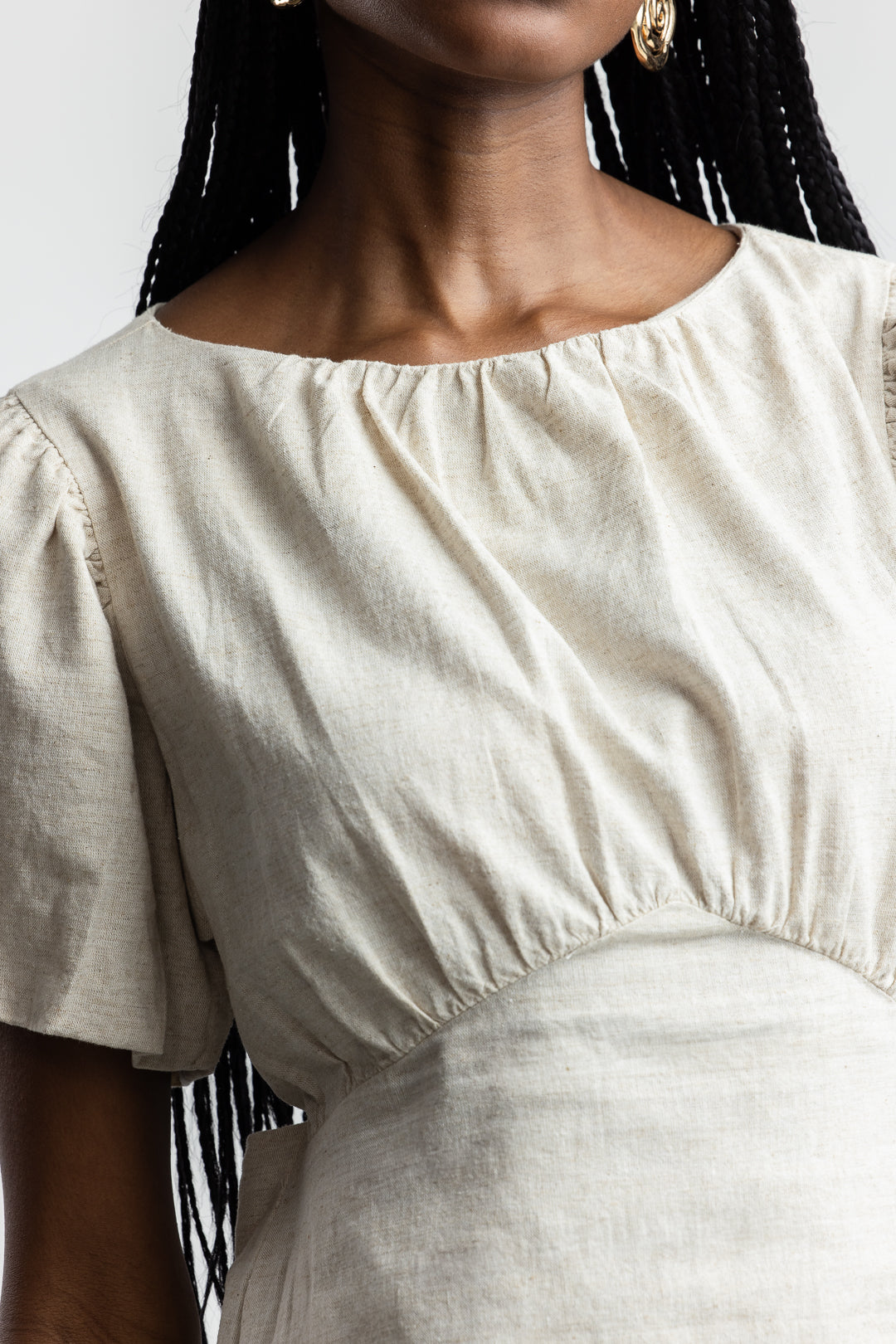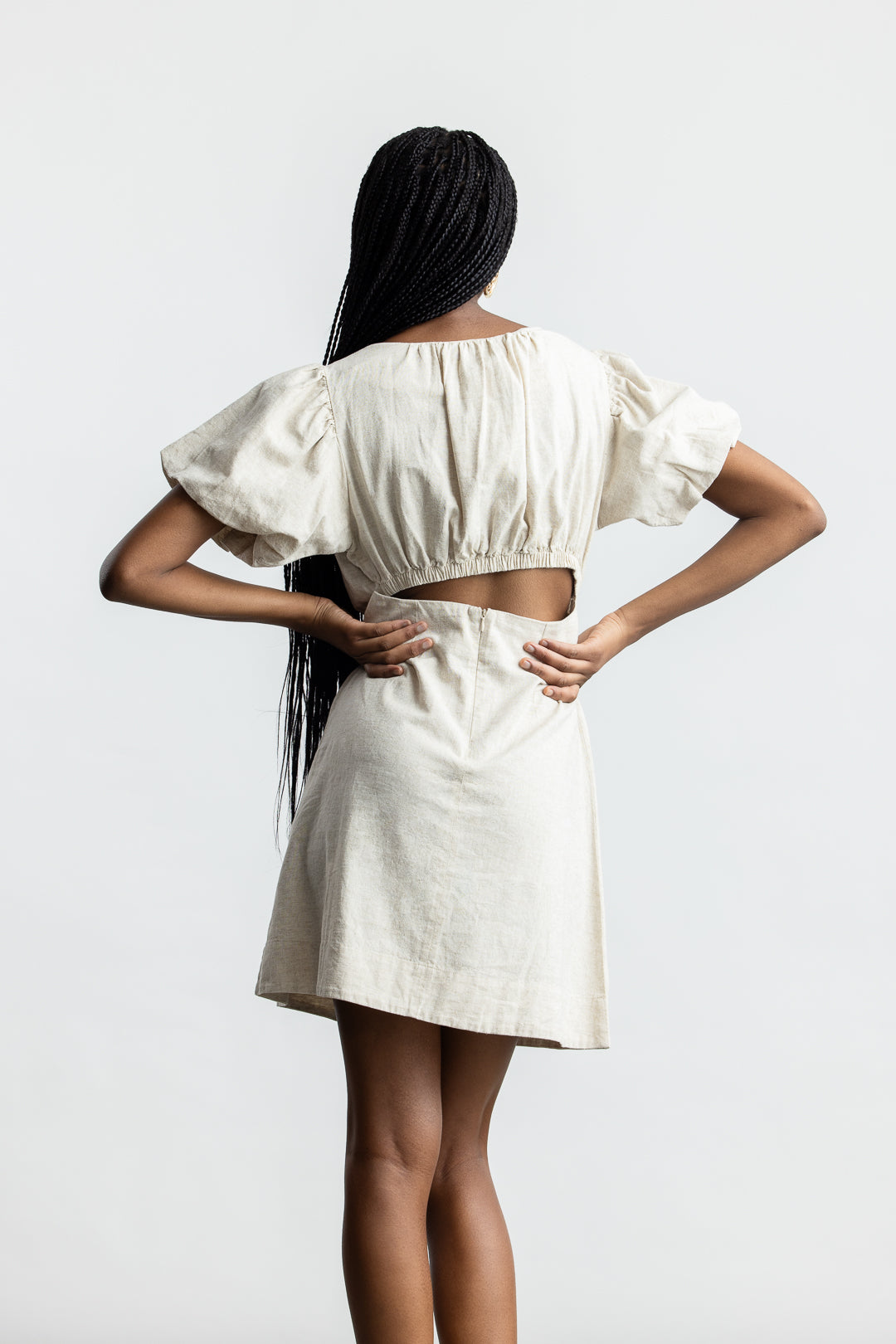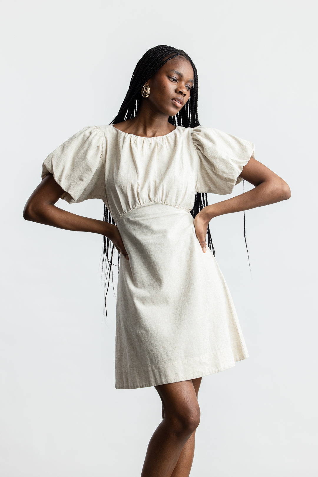 This dress is a statement in romantic charm and soft structure. It features voluminous puff sleeves and a gathered bodice that adds texture and dimension to the neckline. The empire seam curves gently under the bust, creating a flattering shape before falling into a relaxed A-line silhouette. A standout feature is the dramatic open-back design, framed by delicate gathers and finished with a wide elasticated band for comfort and support. This silhouette blends femininity with a hint of drama - perfect for date nights, garden parties, or summer evenings out.