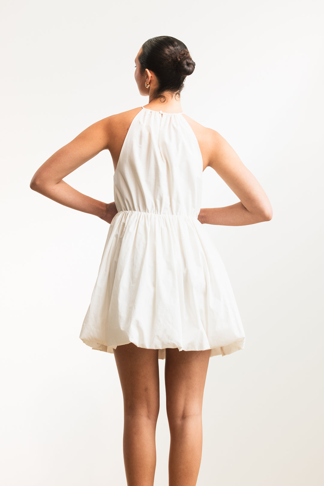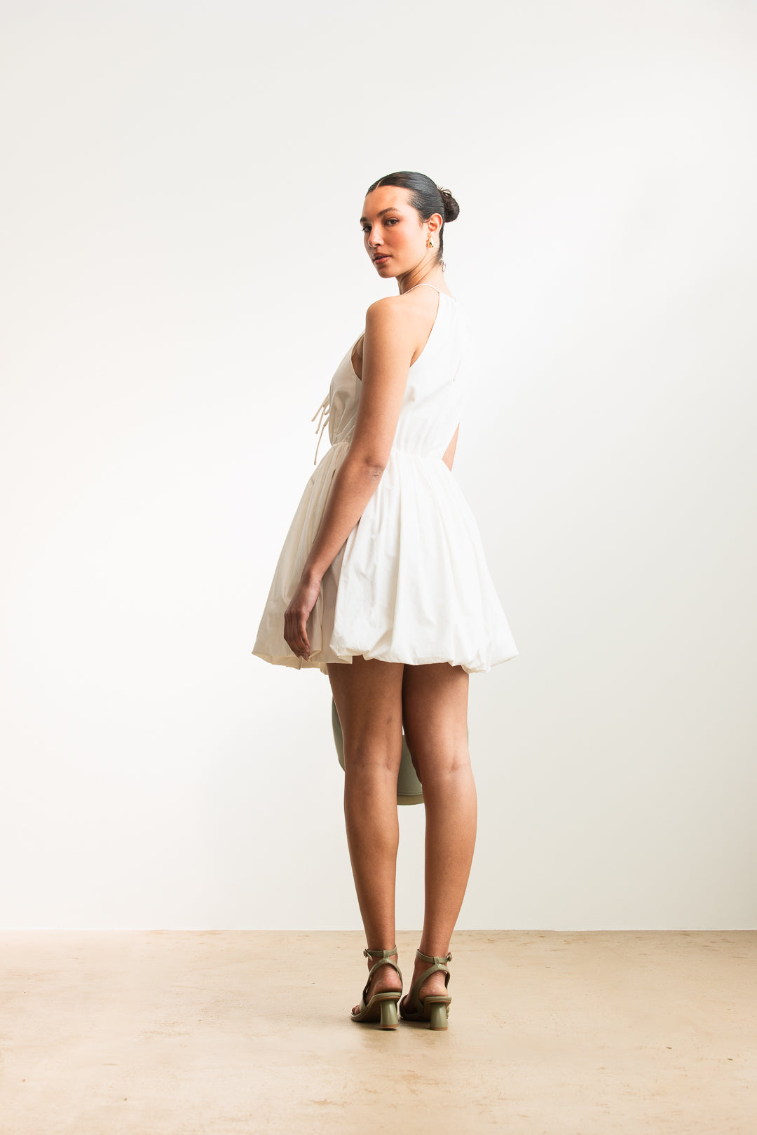 Make a statement in this vibrant mini dress, designed with a playful yet flattering silhouette. The halter neckline is elevated with lace-up detailing, adding a touch of modern edge, while the gathered waist cinches to create definition before flowing into a voluminous bubble hem. Effortlessly bold and feminine, this dress is perfect for warm-weather occasions, from daytime events to evening outings. Style it with strappy sandals for a chic finish or layer with minimal accessories to let the standout shape speak for itself.