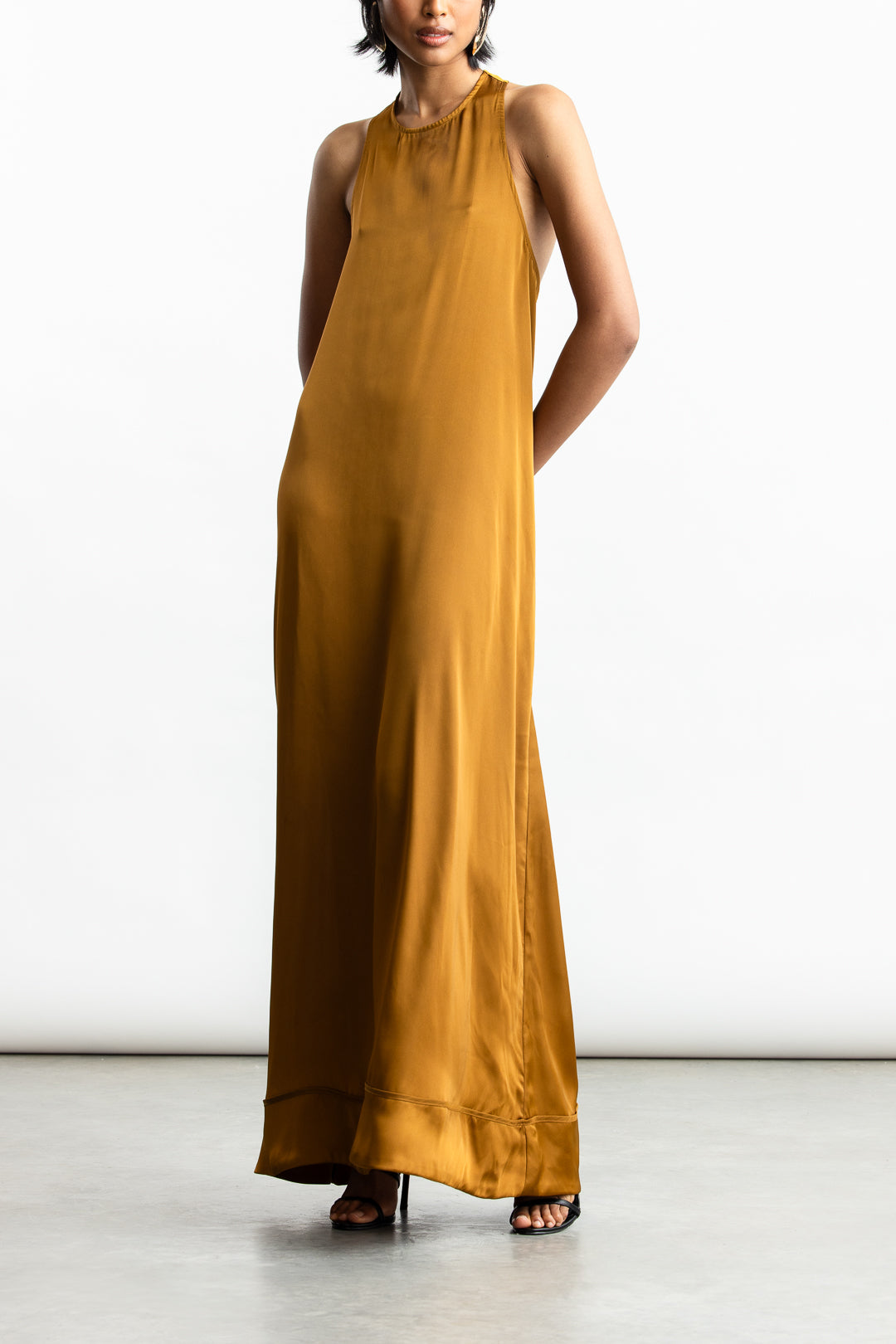 This sleek maxi dress offers a refined, minimalist aesthetic with a modern edge. Crafted from a smooth, fluid fabric, it skims the body with an effortless drape, creating a long, elongating silhouette. The high neckline adds a touch of sophistication, while the racerback design lends a contemporary twist. A subtle sheen enhances the hue, making it perfect for both daytime elegance and evening glamour. Style it with strappy heels and delicate jewellery for a polished occasion look, or pair it with flat sandals and a lightweight jacket for elevated everyday wear.