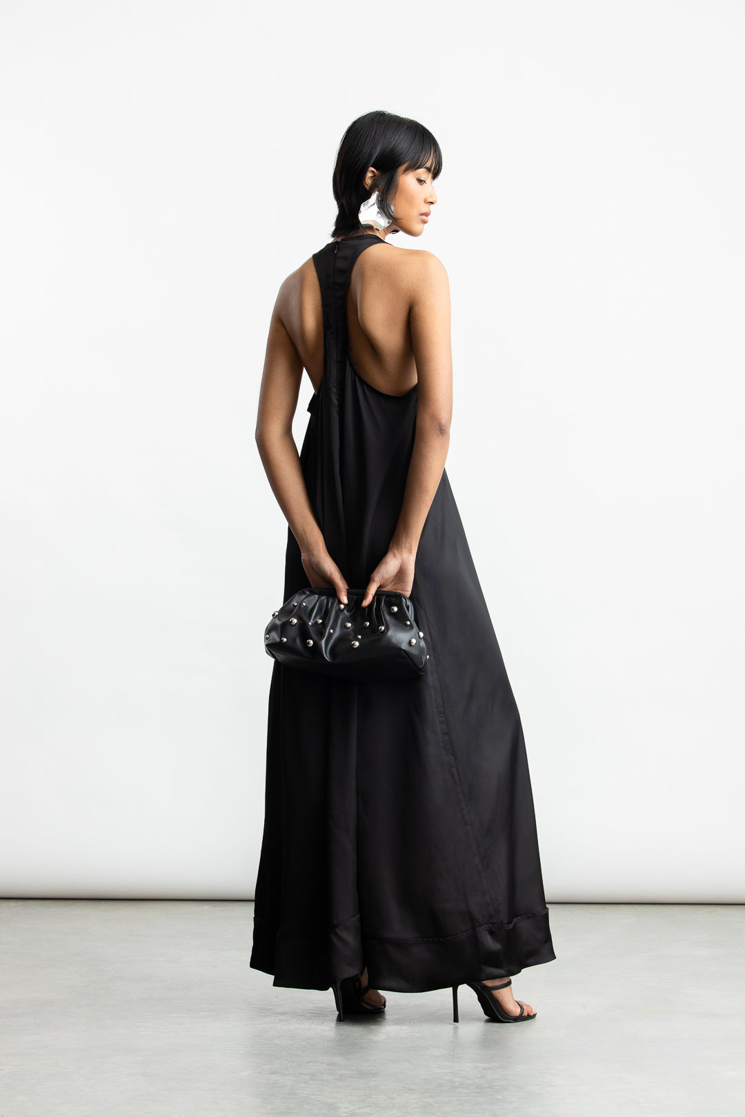 This sleek maxi dress offers a refined, minimalist aesthetic with a modern edge. Crafted from a smooth, fluid fabric, it skims the body with an effortless drape, creating a long, elongating silhouette. The high neckline adds a touch of sophistication, while the racerback design lends a contemporary twist. A subtle sheen enhances the hue, making it perfect for both daytime elegance and evening glamour. Style it with strappy heels and delicate jewellery for a polished occasion look, or pair it with flat sandals and a lightweight jacket for elevated everyday wear.