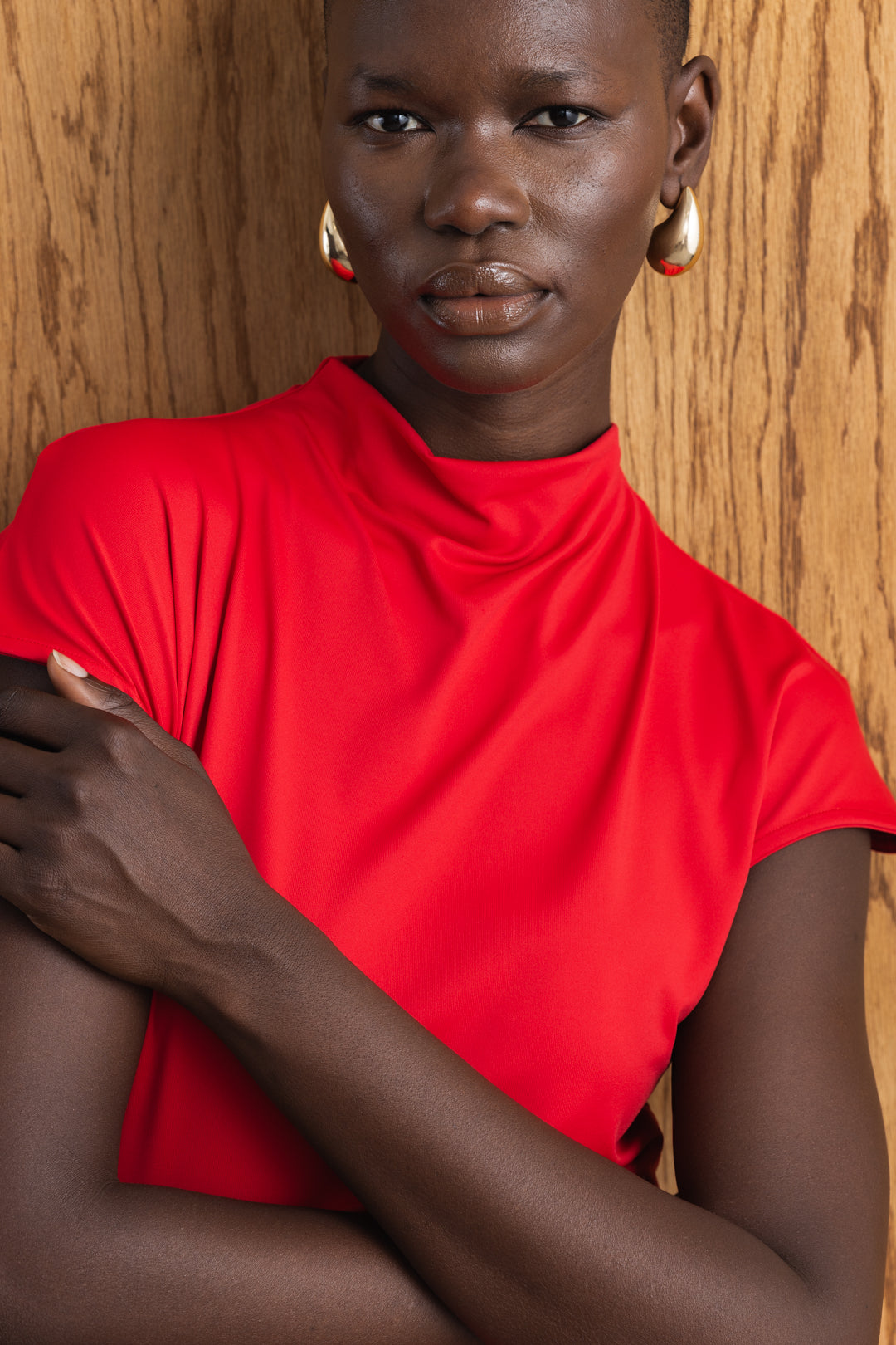 This midi dress is crafted from smooth polyamide, offering a sleek and body-skimming silhouette. Designed with a high neckline and capped sleeves, it features subtle shaping through the waist for a flattering fit. The streamlined construction and clean finish create a modern, minimal look.