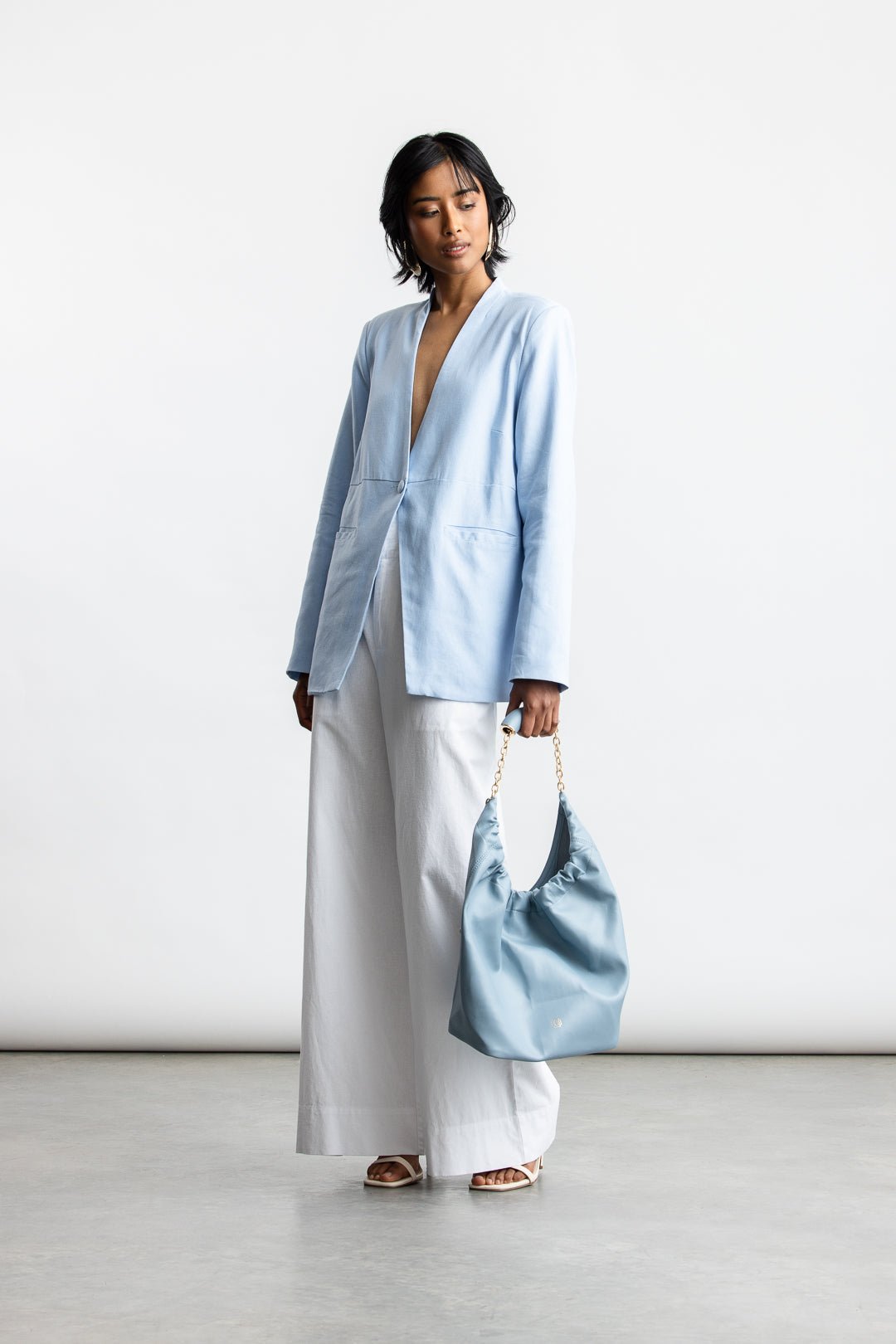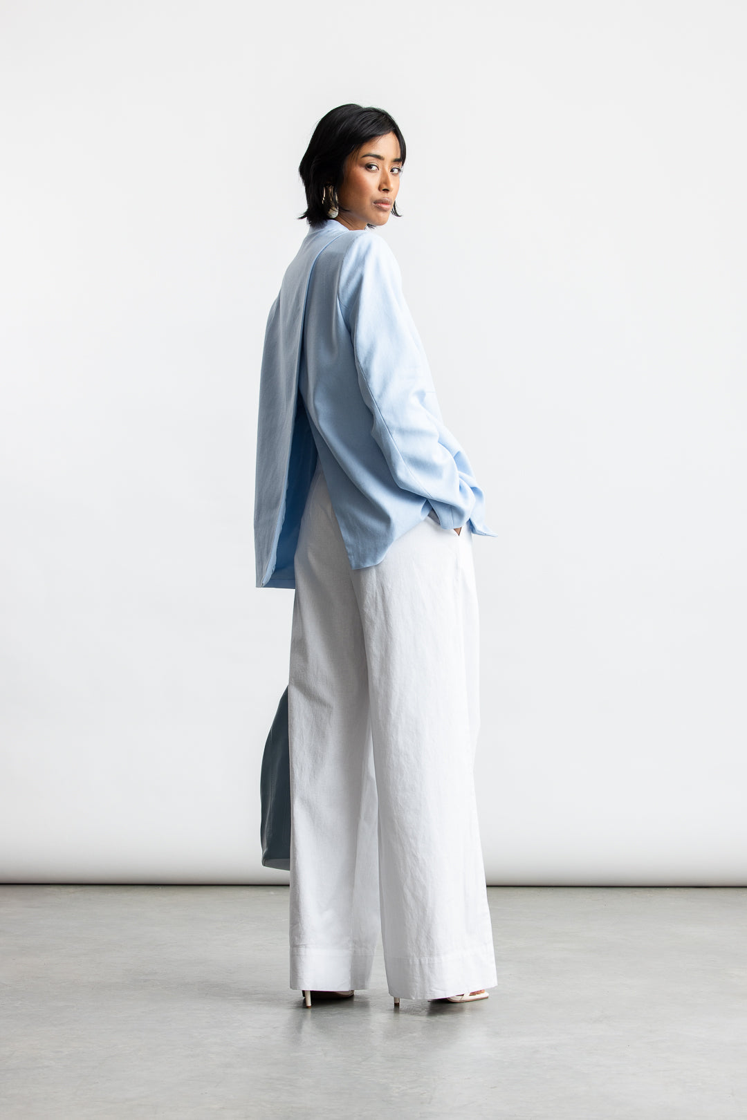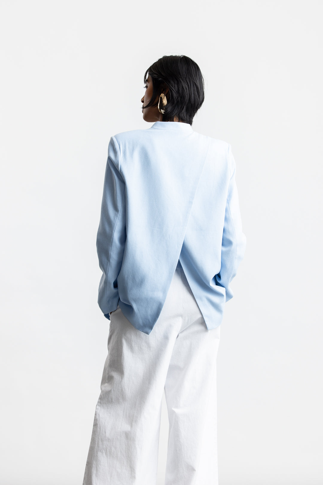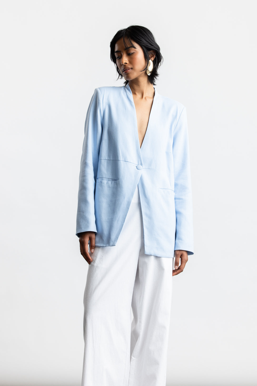 Minimal lines. Maximum impact. This collarless blazer redefines tailoring with a modern silhouette. Made from a breathable linen blend, it brings relaxed structure to any look, while the clean neckline and fluid drape add a touch of understated sophistication. Designed for styling versatility; layer it over a tank and tailored trousers for polished ease, or pair it with denim for an elevated casual look.