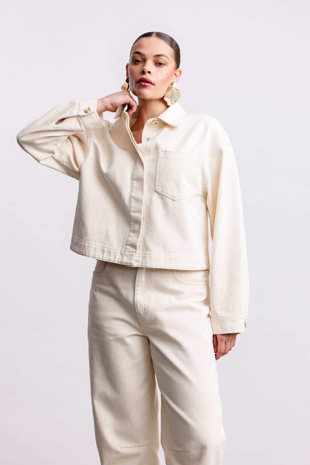 A classic denim shacket featuring a concealed button stand for a clean, streamlined look. Designed with a statement top button that adds a distinctive touch, enhancing the neckline. Crafted from durable denim, this shirt offers a structured yet comfortable fit, making it a versatile piece for various occasions.