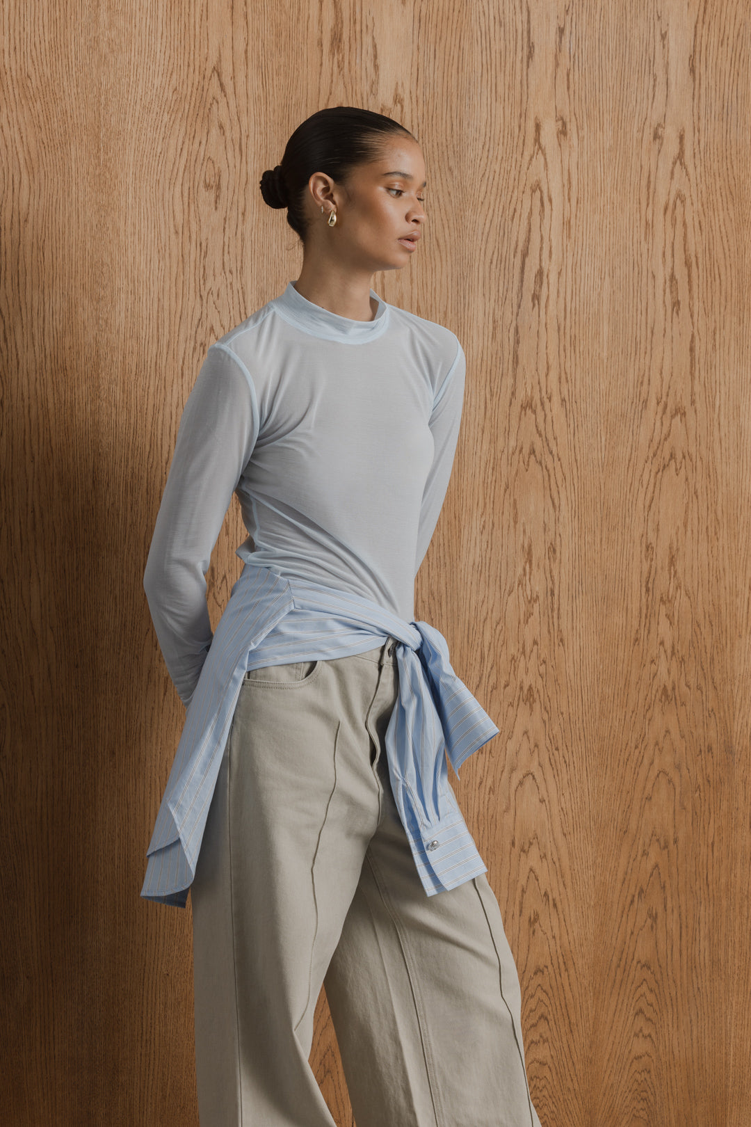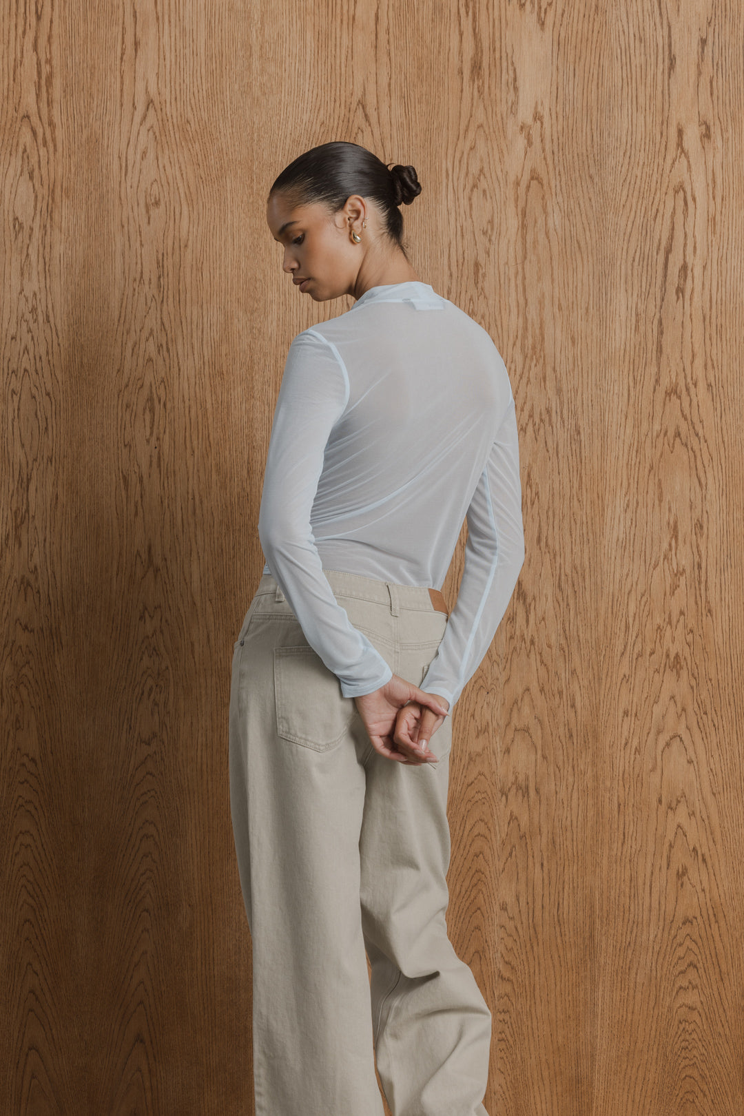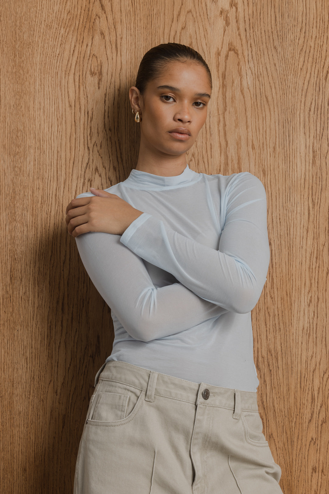 The high poloneck adds a sophisticated touch, balancing the sheer finish with a clean, streamlined shape. Long sleeves enhance the elegant profile, making it perfect for layering under tailoring, dresses, or styling on its own for a more statement feel.