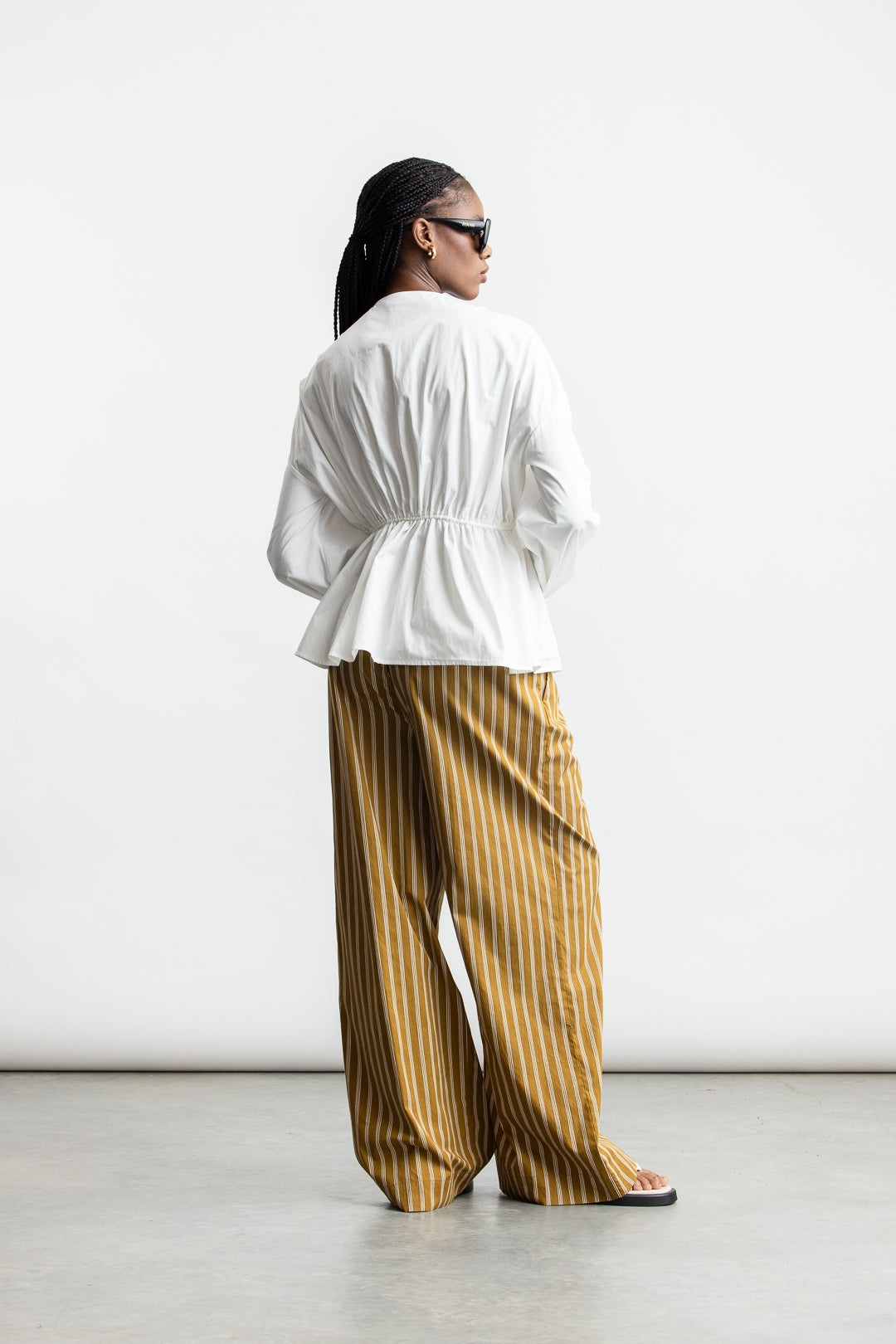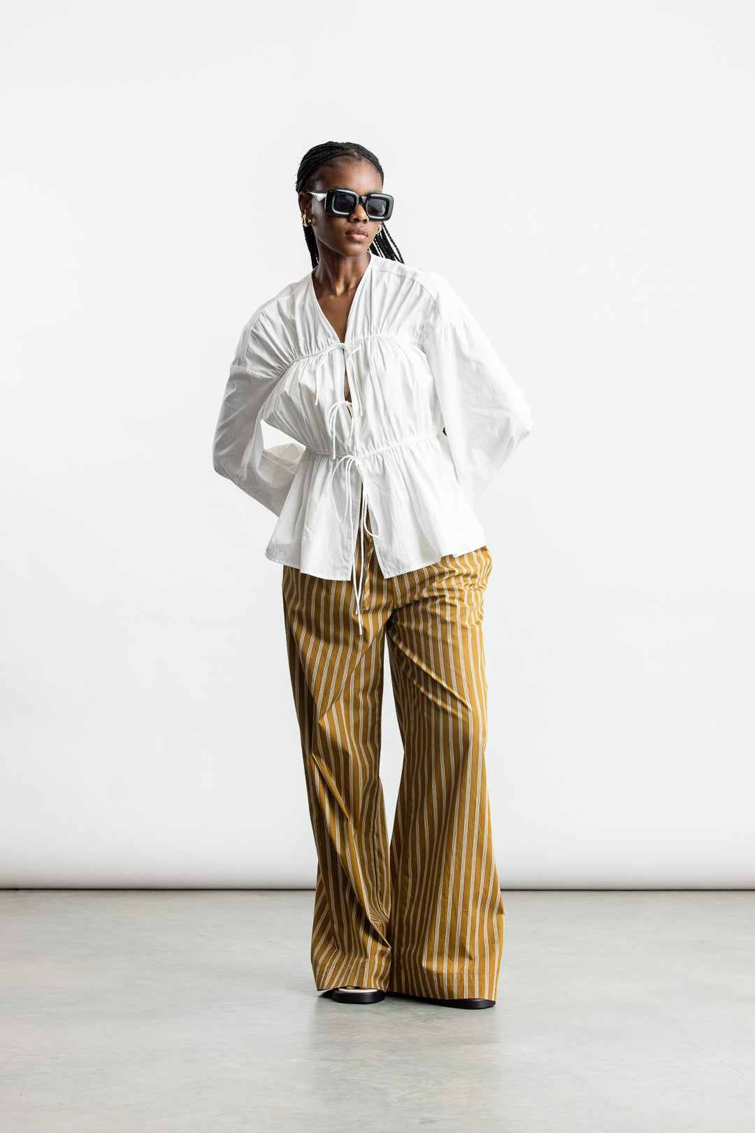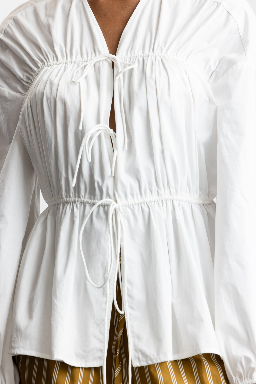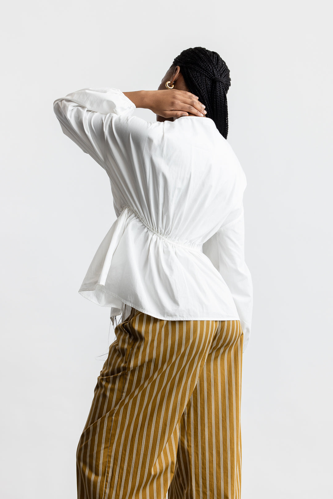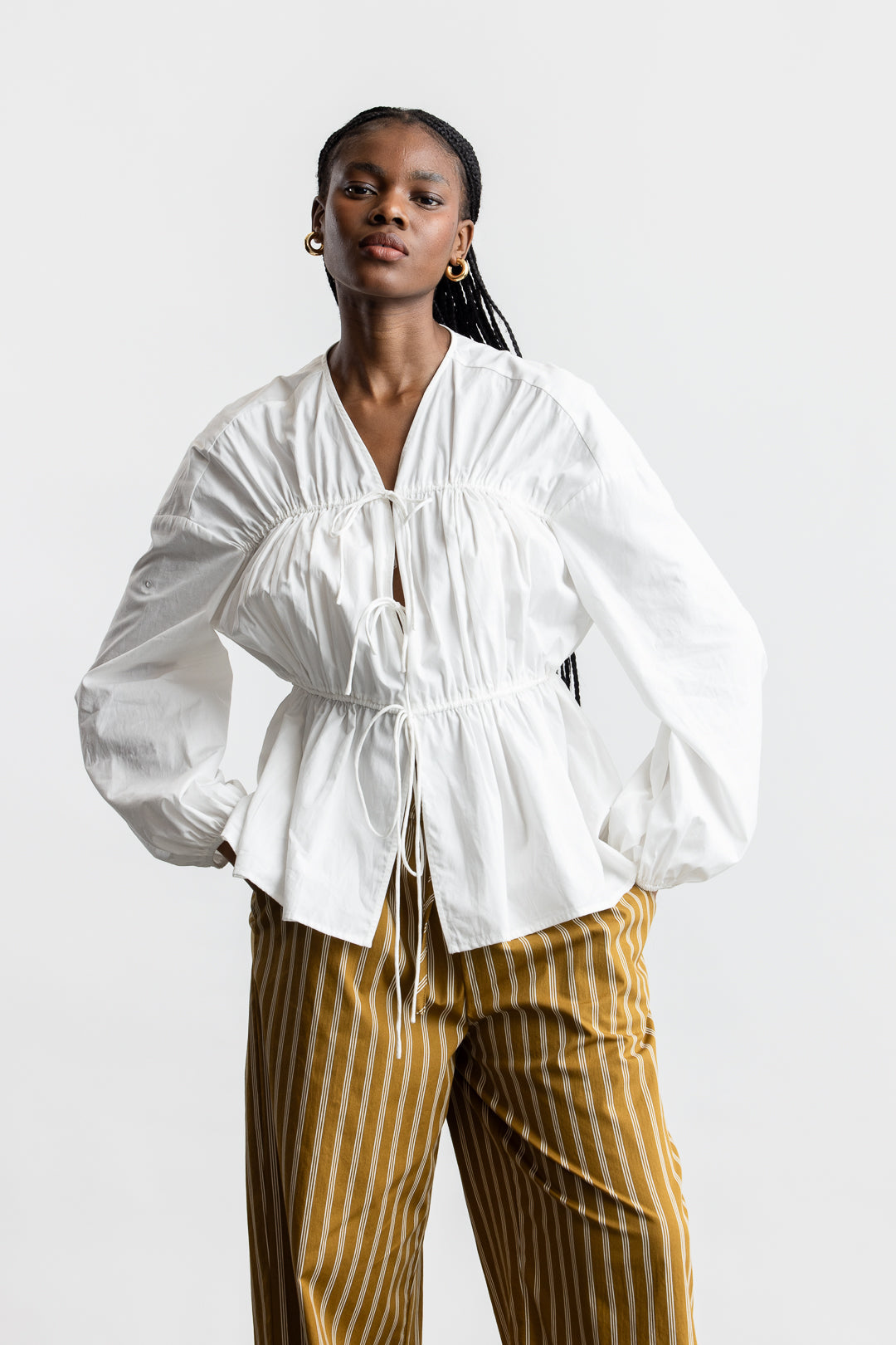 Our poplin front-tie blouse combines classic tailoring with a modern twist. It features three ties at the front, adding a touch of detail and versatility to the design. The long sleeves are finished with elasticated cuffs, creating a subtle gathered effect for a refined silhouette. Crafted from crisp poplin, this blouse is both stylish and comfortable, making it a perfect choice for a polished yet contemporary look.