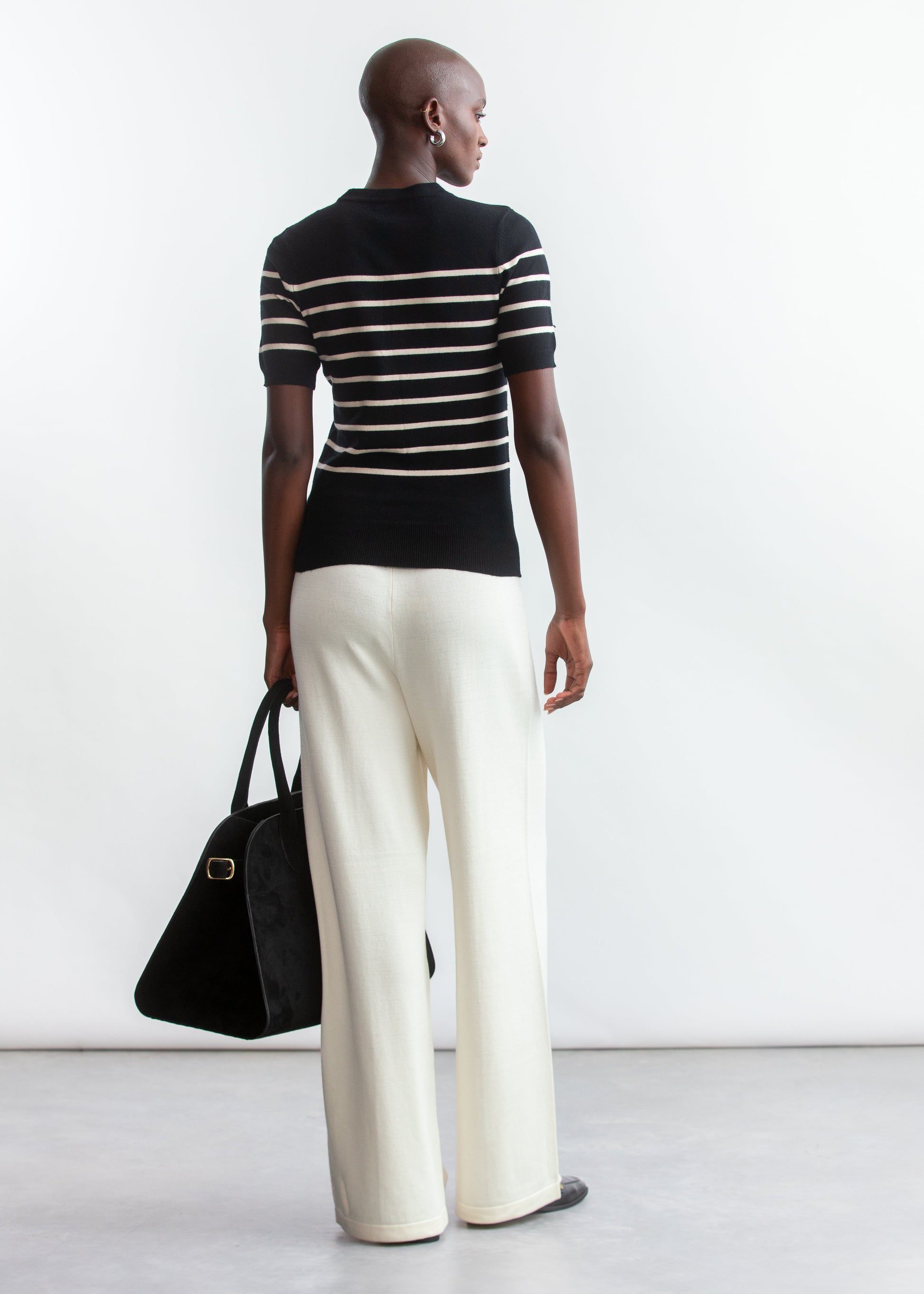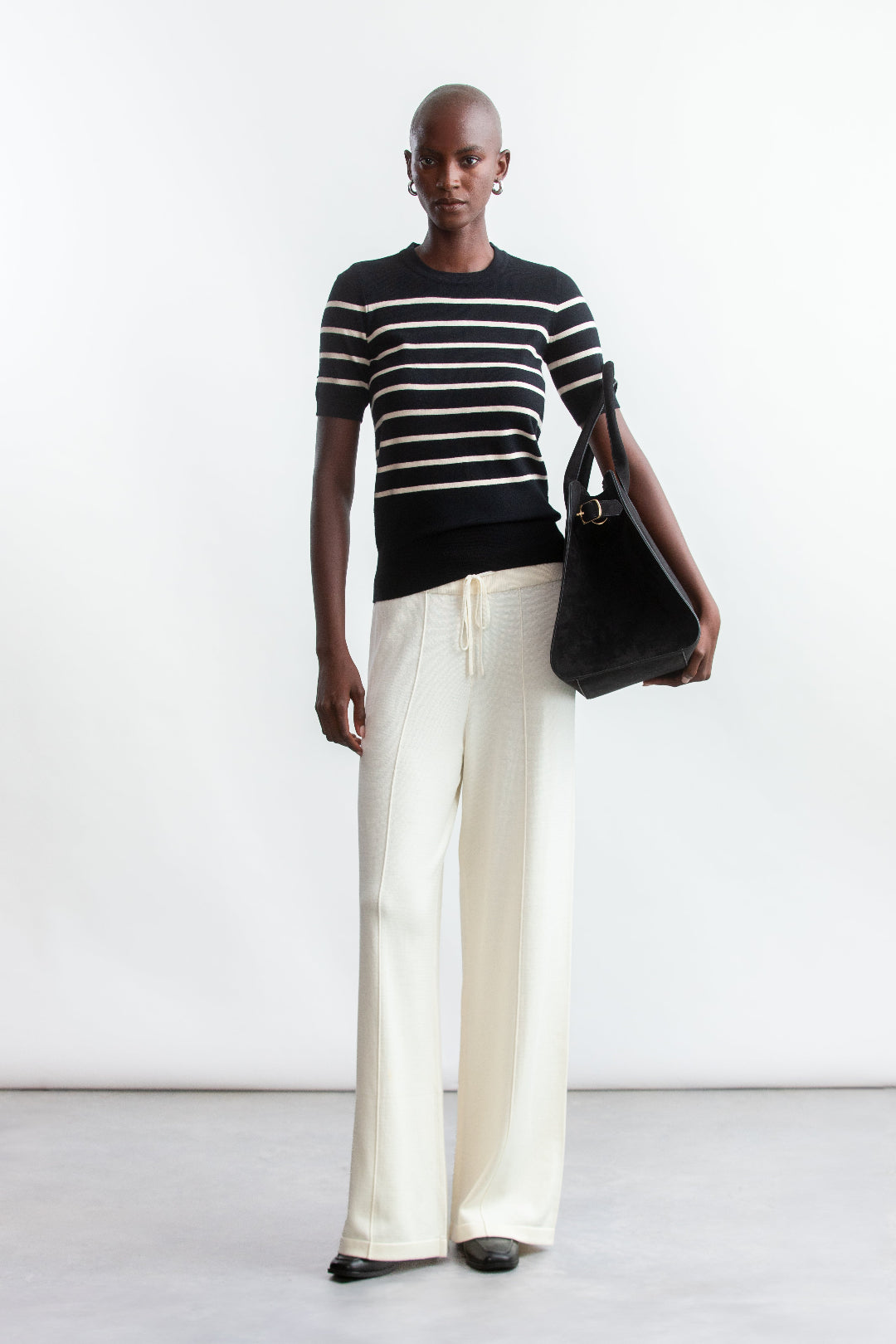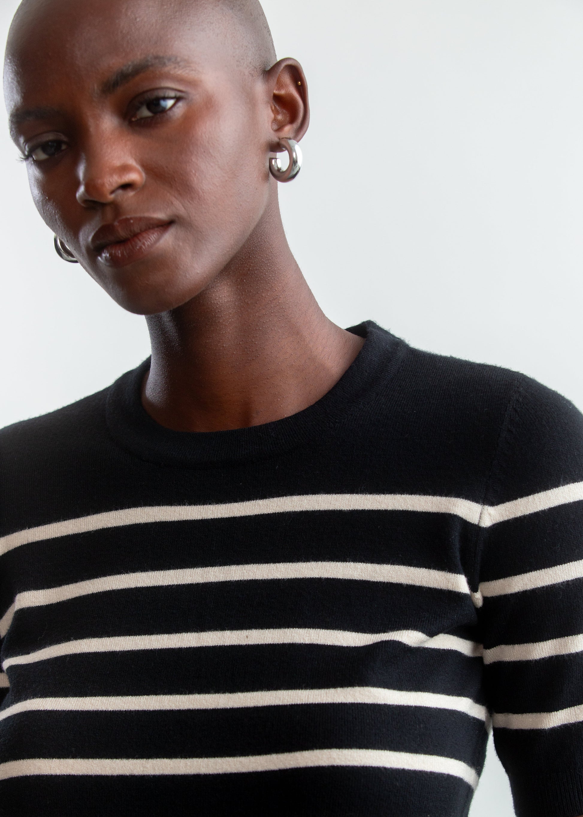 Our ‘ballerina’ sleeve knit top is beautifully ribbed along the edges creating a flattering and snug fit. The block stripe design adds a bold, elegant touch, creating a modern and refined aesthetic. The ballerina sleeves give the top a graceful, luxurious feel, making it suitable for both casual and semi-formal wear.