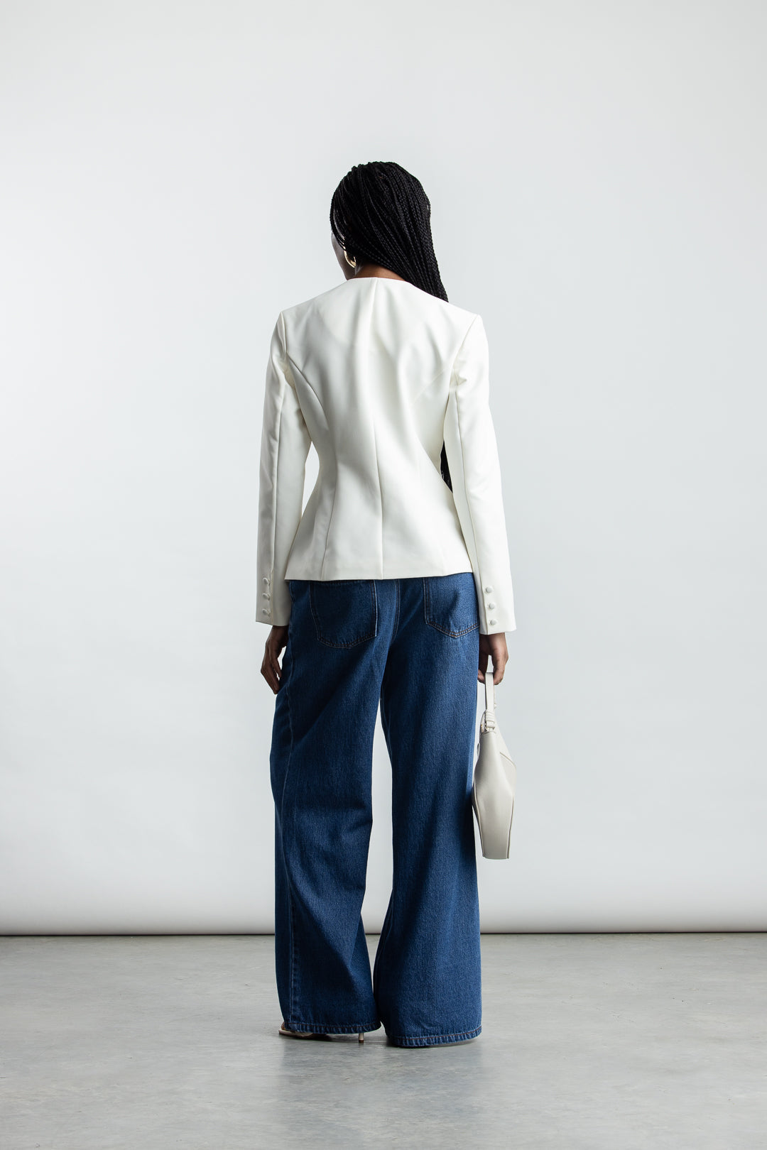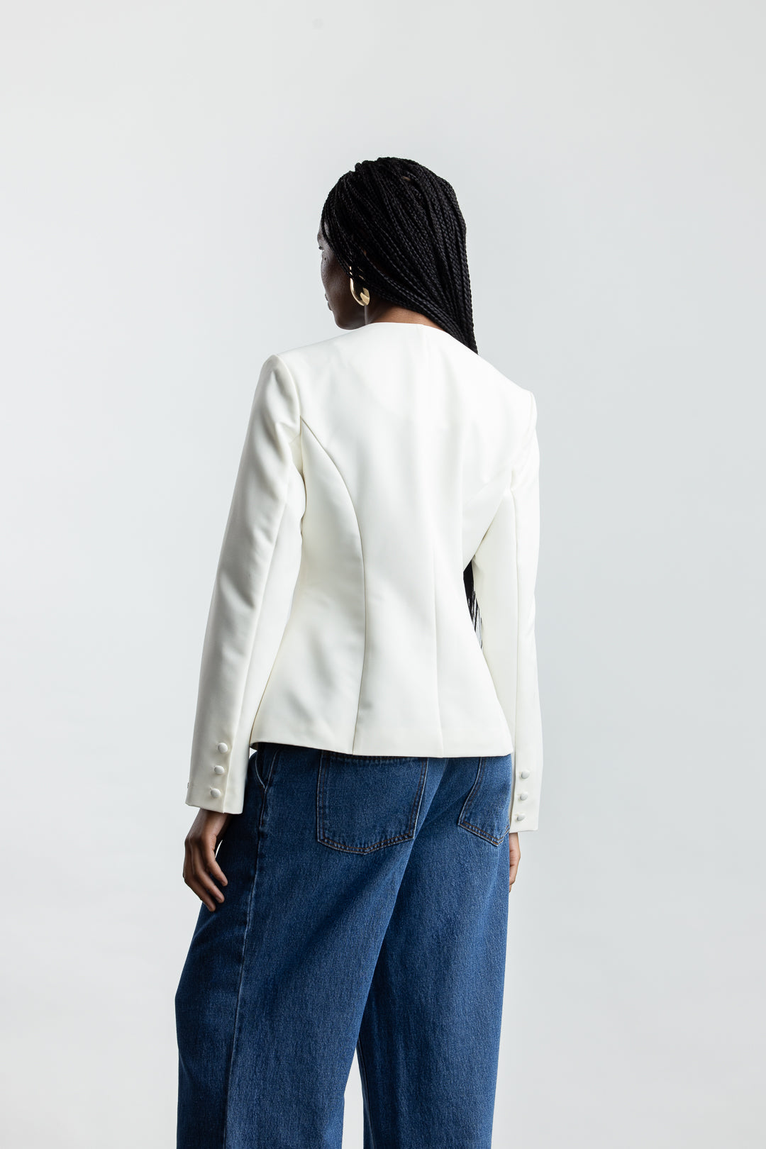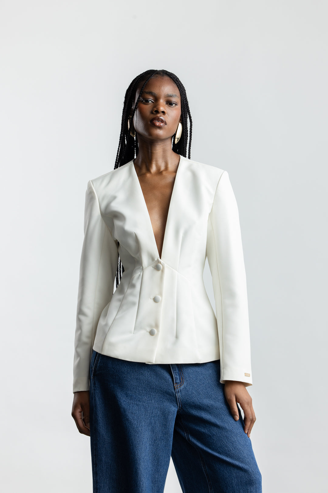 Minimalist tailoring with maximum impact. Meet Zuri, our collarless blazer features a deep plunge neckline, sculpted waist seams, and a sleek triple-button closure that defines the silhouette.