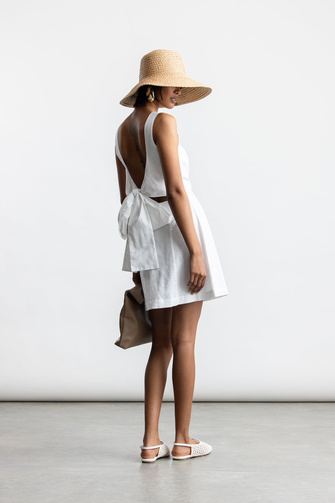 Elevate your look with this effortlessly chic mini dress. Designed with a structured square neckline and fitted bodice, it flatters the silhouette while offering a clean, modern edge. The open back is finished with a functional oversized bow, allowing you to adjust the fit while adding a touch of feminine charm and playful sophistication. Cut in a versatile mini length, this piece is perfect for both daytime outings and evening occasions. Pair it with sandals for a casual finish or dress it up with heels and statement accessories for a polished look. A must-have style that blends elegance with contemporary appeal.