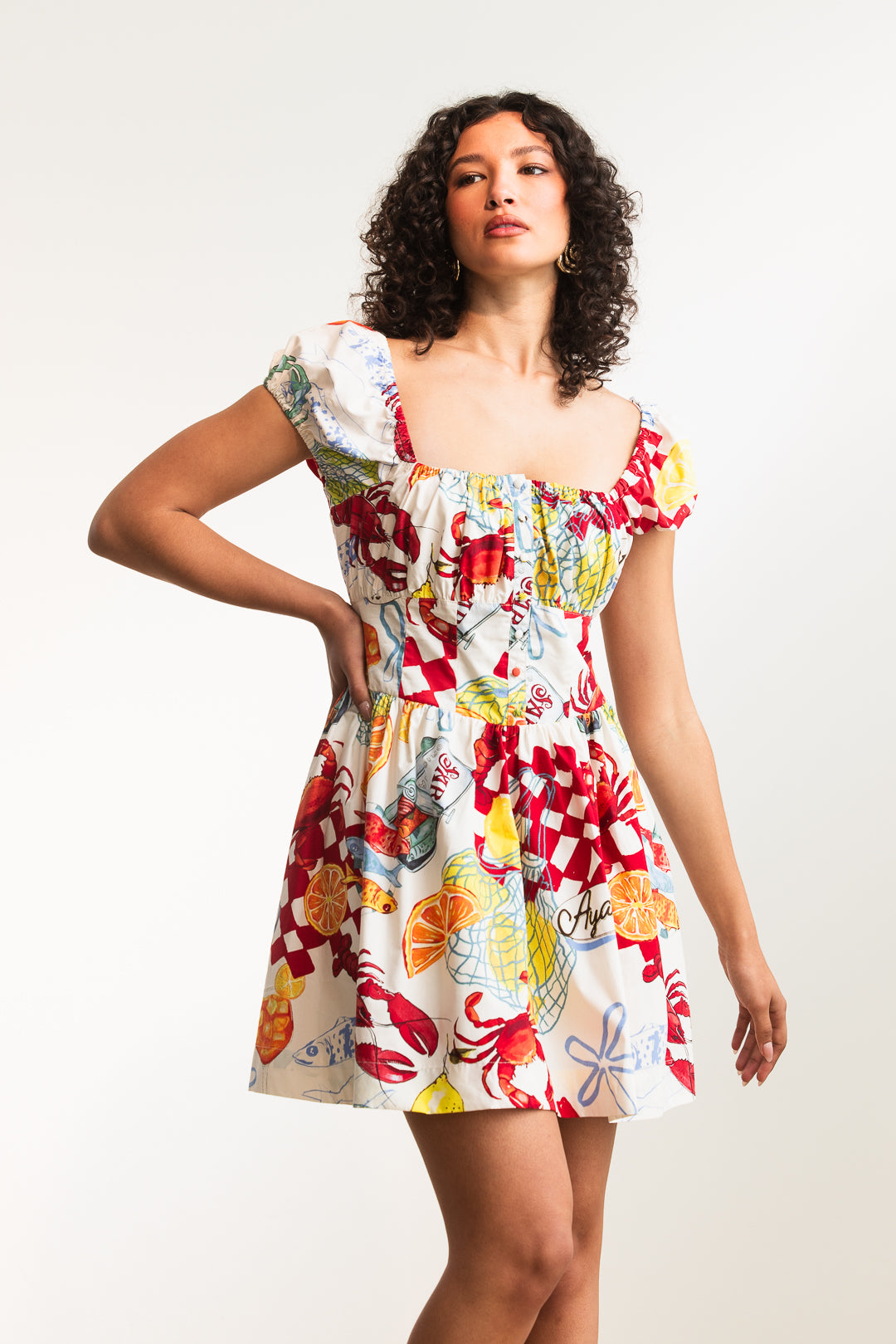 Romantic and feminine, this dress is designed to flatter while offering a touch of vintage-inspired charm. The square neckline frames the décolletage beautifully, complemented by softly ruched puff sleeves that add volume and elegance. A fitted bodice with button-down detail creates structure at the front, while the lace-up corset design at the back provides both adjustability and a delicate, eye-catching finish. The skirt flows gently into a flattering A-line silhouette, making it versatile for both daytime and evening occasions. Pair it with sandals for a sweet casual look or elevate it with heels and accessories for a dressed-up ensemble
