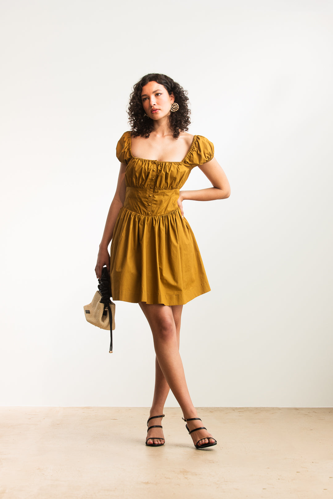 Romantic and feminine, this dress is designed to flatter while offering a touch of vintage-inspired charm. The square neckline frames the décolletage beautifully, complemented by softly ruched puff sleeves that add volume and elegance. A fitted bodice with button-down detail creates structure at the front, while the lace-up corset design at the back provides both adjustability and a delicate, eye-catching finish. The skirt flows gently into a flattering A-line silhouette, making it versatile for both daytime and evening occasions. Pair it with sandals for a sweet casual look or elevate it with heels and accessories for a dressed-up ensemble.
