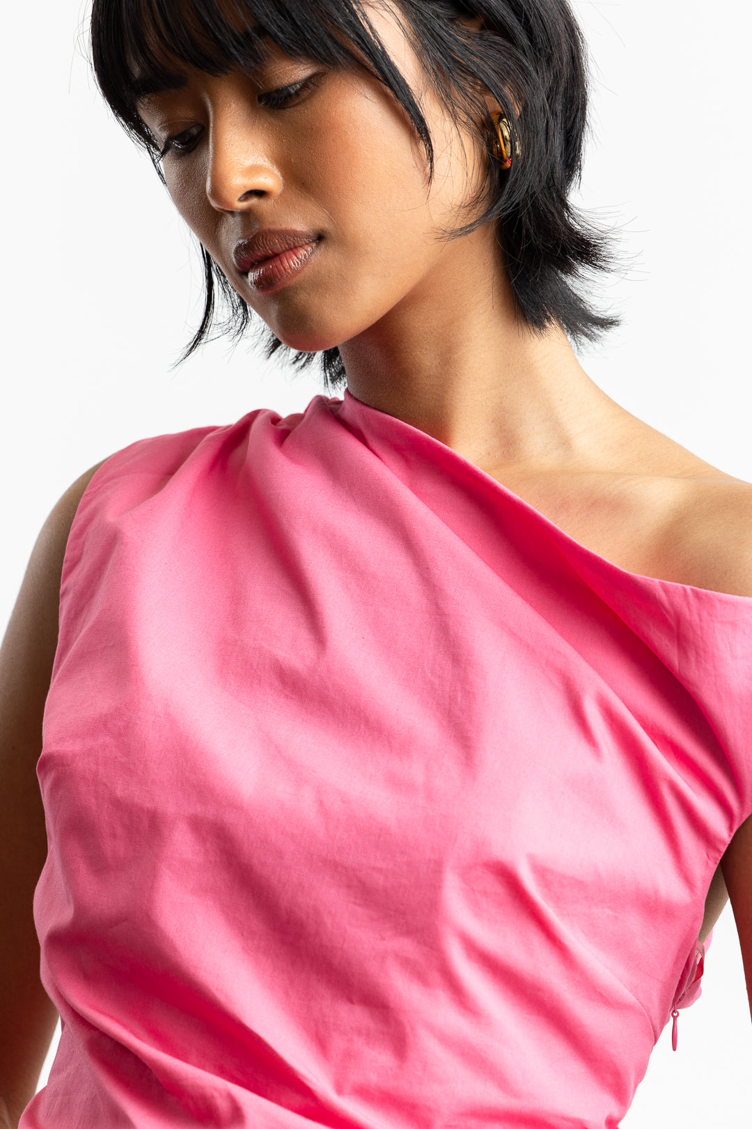 This mini dress brings a contemporary twist to classic minimalism with its asymmetric neckline. Designed with one shoulder subtly exposed, it creates an effortlessly modern silhouette. Soft draping through the bodice adds dimension and a flattering fit, while the straight hem keeps the look clean and refined. Perfect for both daytime outings and evening events, it can be styled simply with strappy heels and minimal jewellery for an understated yet striking ensemble.