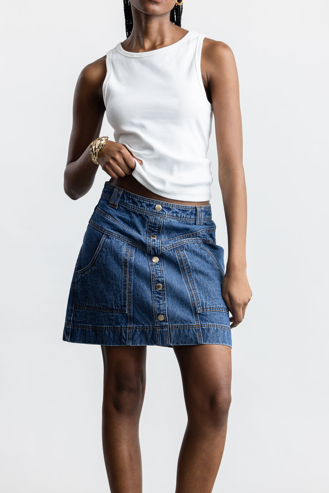 Iconic structure, reimagined for modern styling — the Masego Denim Skirt delivers timeless A-line shaping with a directional twist. Crafted in authentic mid-wash denim, it features a high-rise fit and sculpted panel seams that contour and flatter.
