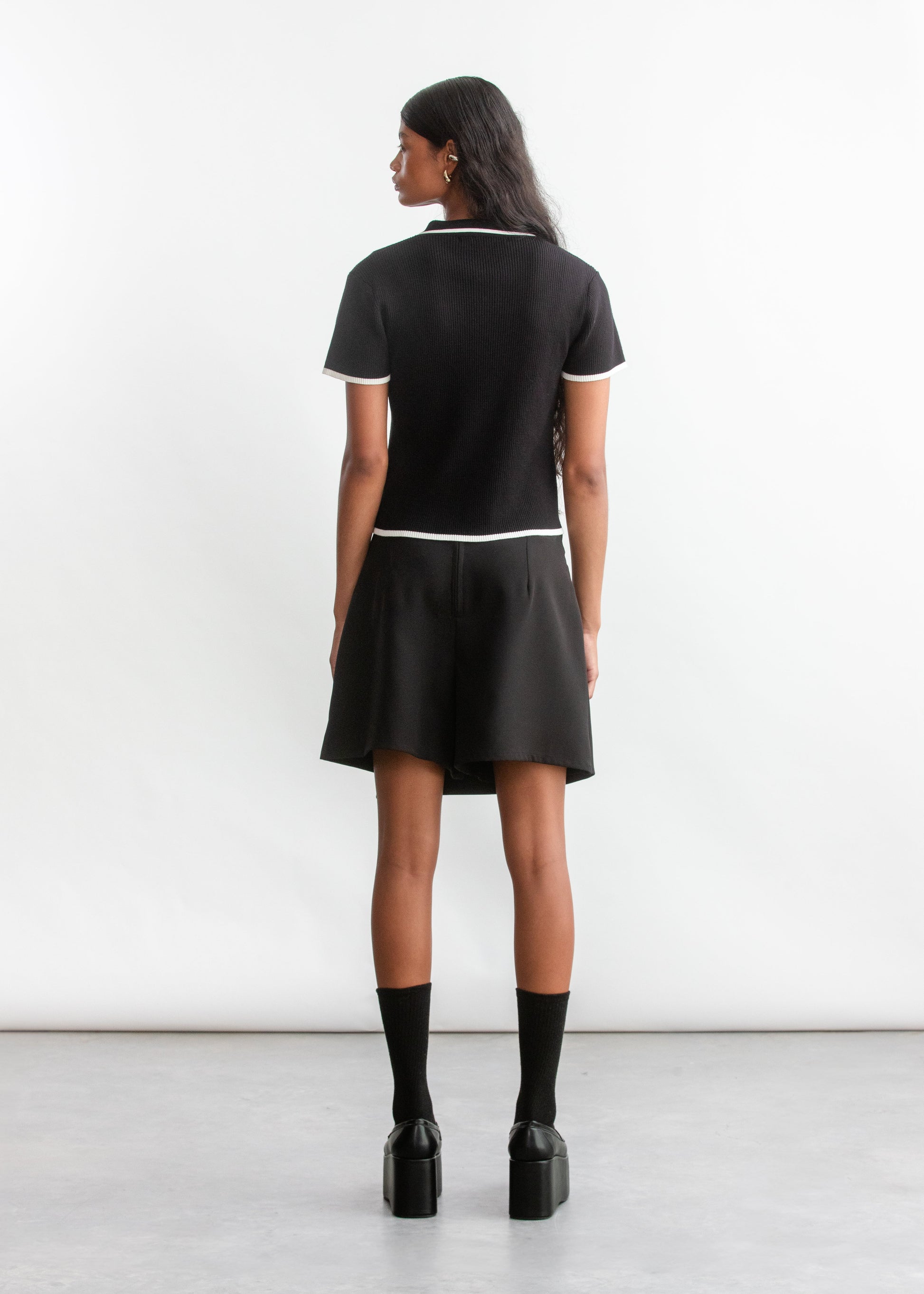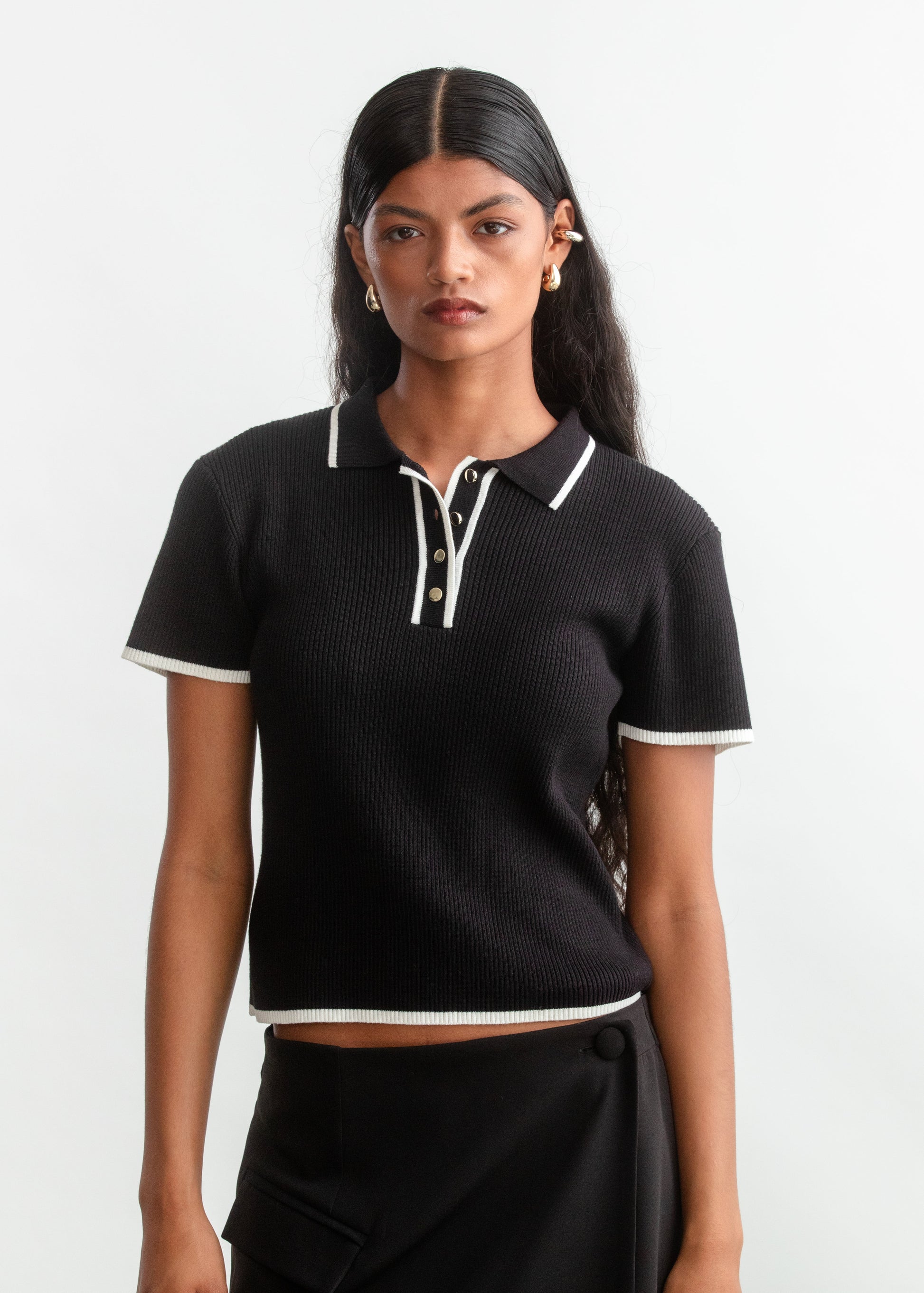 Our fine-gauge knit top featuring a classic Johnny collar for a polished look. The edges are accented with delicate white tipping, adding a touch of contrast and refinement. The center-front button-up closure enhances the design, making it versatile for both casual and dressier occasions.