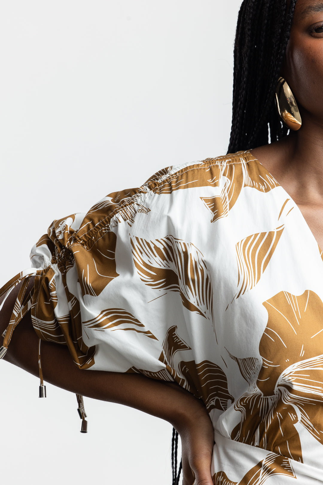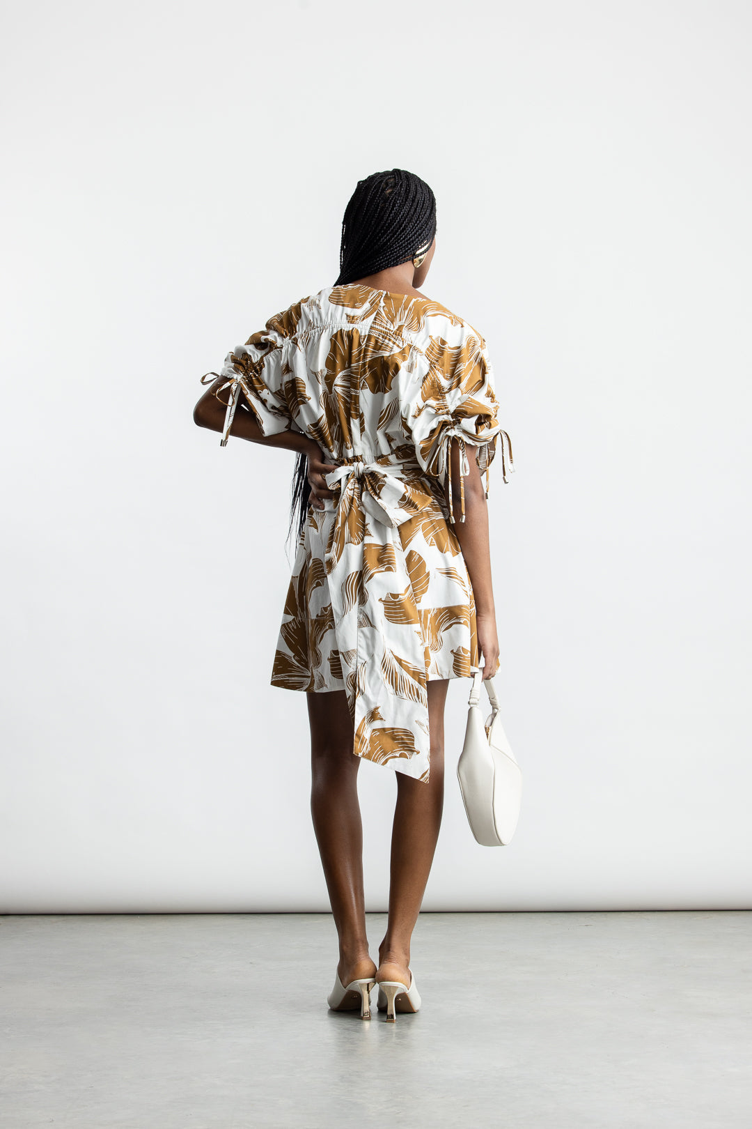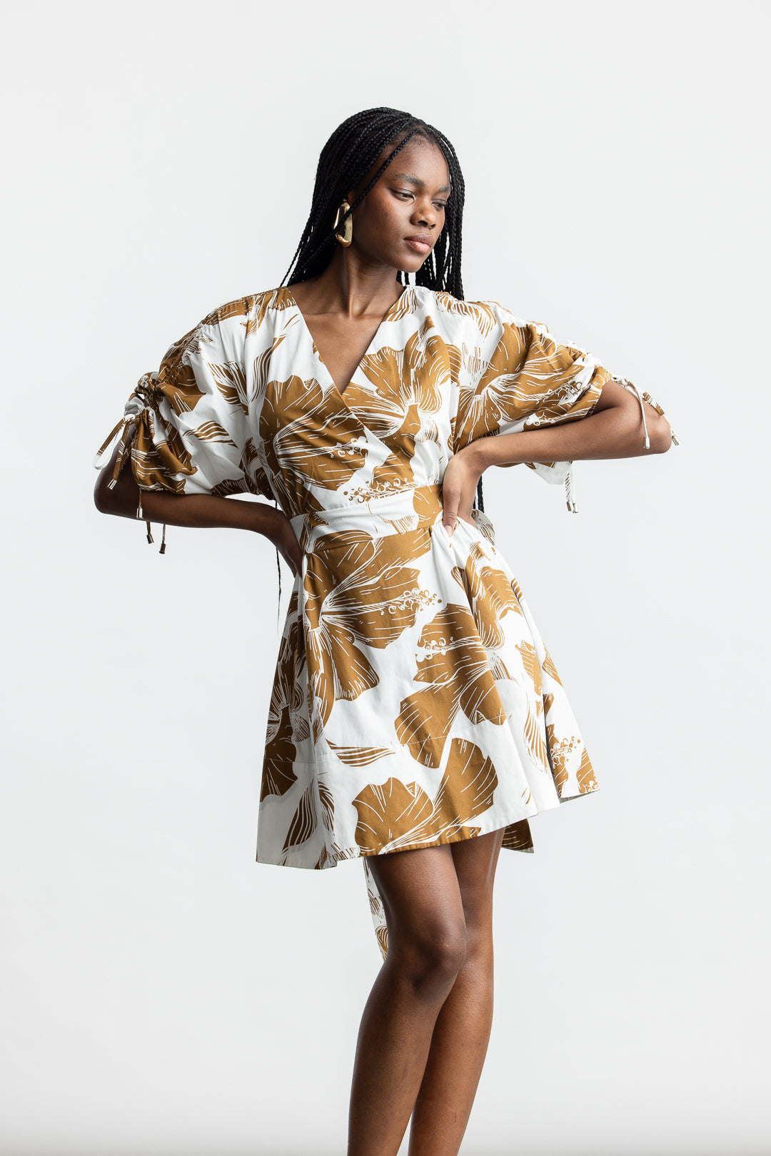 This wrap mini dress blends feminine charm with easy wearability. Designed with a flattering V-neckline and a softly structured bodice, it cinches at the waist with a self-tie belt that creates a custom fit. The short, voluminous sleeves feature adjustable drawstring ties for added shape and detail, while the flared skirt moves effortlessly with each step. Perfect for warm-weather outings, it pairs beautifully with sandals for daytime or can be elevated with heels and statement jewellery for a more polished occasion look.
