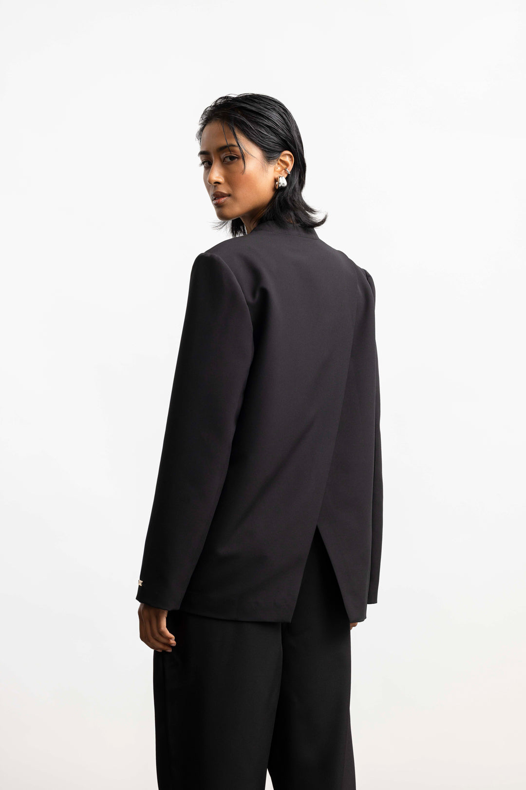 A study in precision and poise - Our Nozipho collarless blazer redefines tailoring with a sharp, modern edge. Cut in a structured, matte finish fabric, it features a deep V-neckline that frames the décolletage, a single sculptural metal button closure, and clean, uninterrupted lines that elongate the form.
