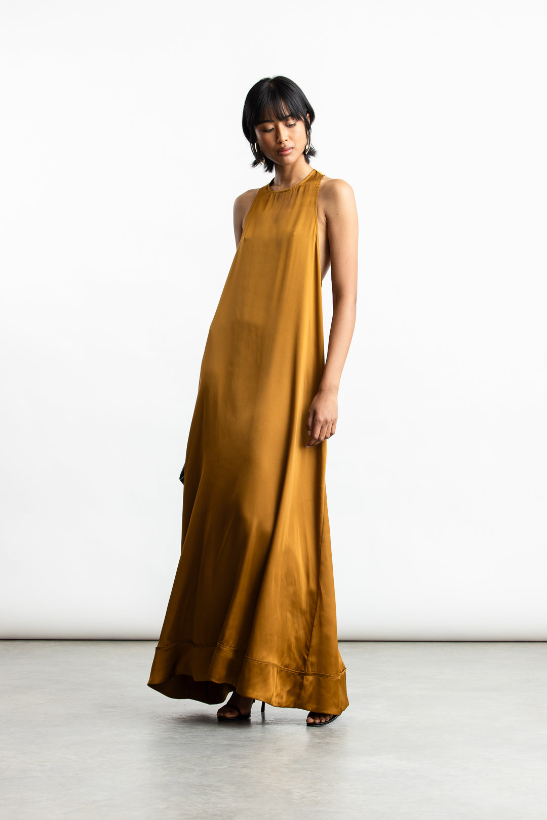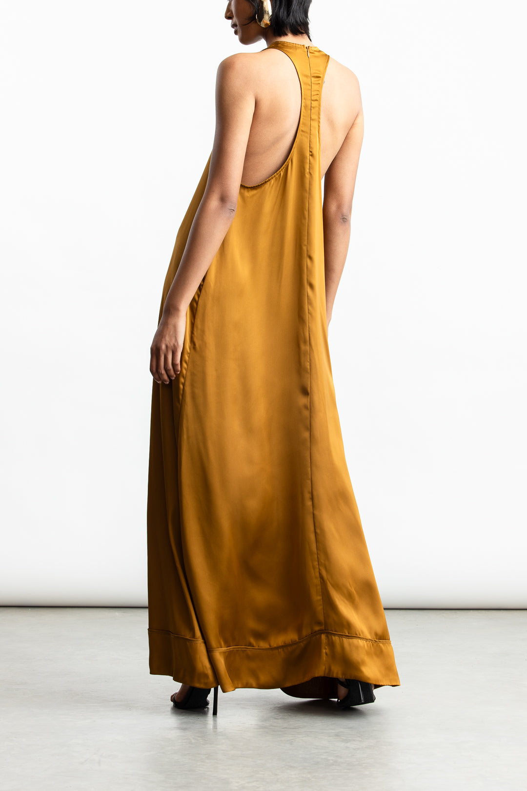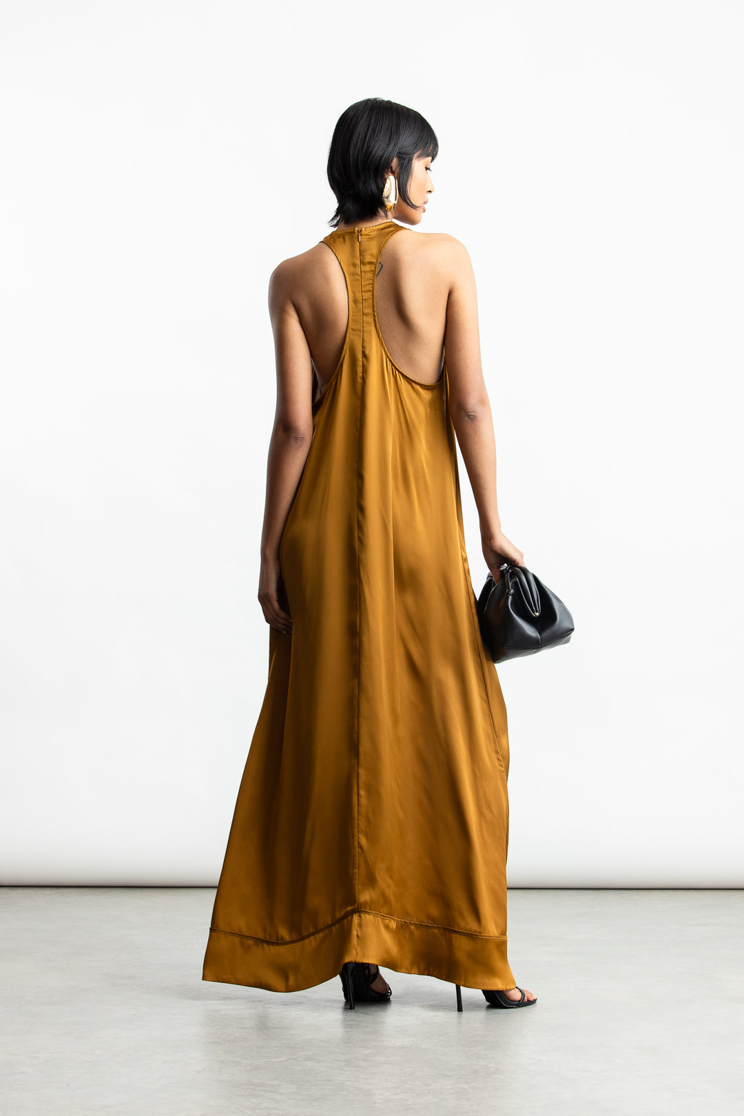 This sleek maxi dress offers a refined, minimalist aesthetic with a modern edge. Crafted from a smooth, fluid fabric, it skims the body with an effortless drape, creating a long, elongating silhouette. The high neckline adds a touch of sophistication, while the racerback design lends a contemporary twist. A subtle sheen enhances the hue, making it perfect for both daytime elegance and evening glamour. Style it with strappy heels and delicate jewellery for a polished occasion look, or pair it with flat sandals and a lightweight jacket for elevated everyday wear.