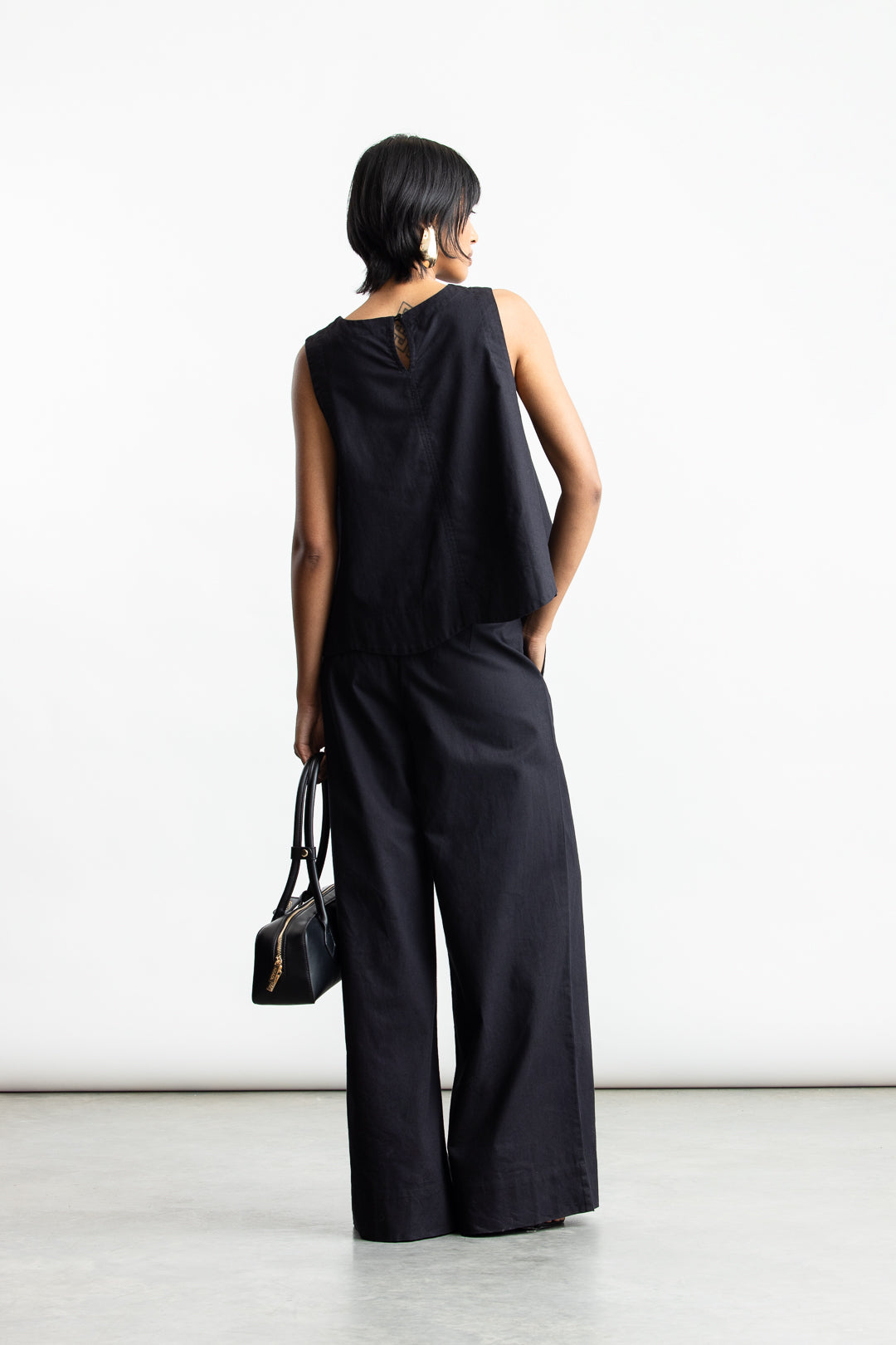 Meet sculptural elegance in these high-waisted, wide-leg pants. Designed with a grown-on waistband and tailored with front and double back darts, they offer a clean, elongated silhouette. Side entry pockets add discreet functionality, while the structured shape brings a refined, edge to modern tailoring.