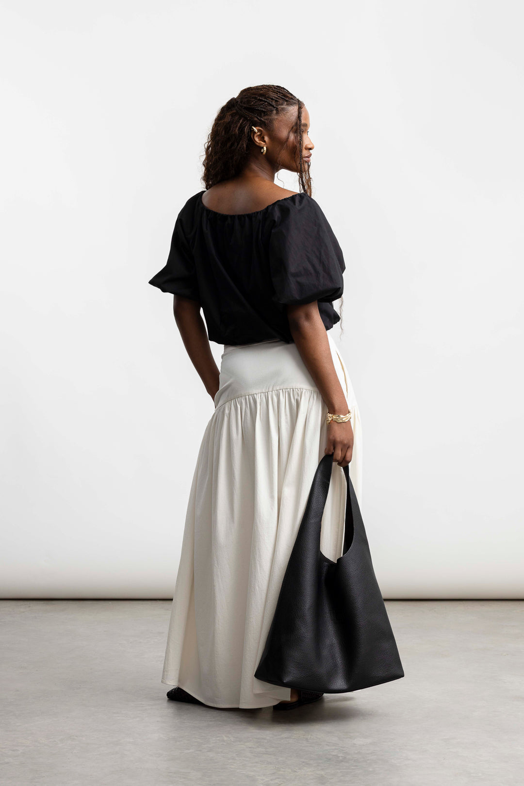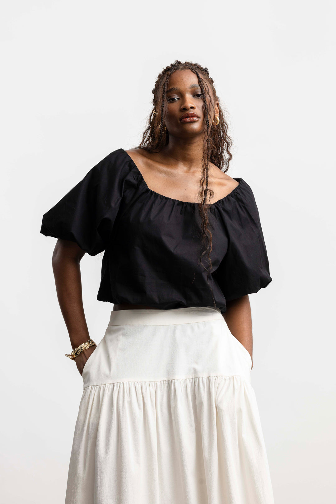Crafted from 100% cotton poplin, this puff sleeve top brings volume, structure, and femininity into perfect balance. Designed with an elasticated neckline, it can be styled on or off the shoulder to suit your mood. Statement puff sleeves and a soft bubble hem create a playful, voluminous silhouette, while the breathable cotton keeps it light and comfortable. With its relaxed yet fashion-forward shape, this top is a standout piece that pairs effortlessly with both casual denim and dressier bottoms. A versatile addition to your wardrobe with an elevated edge.