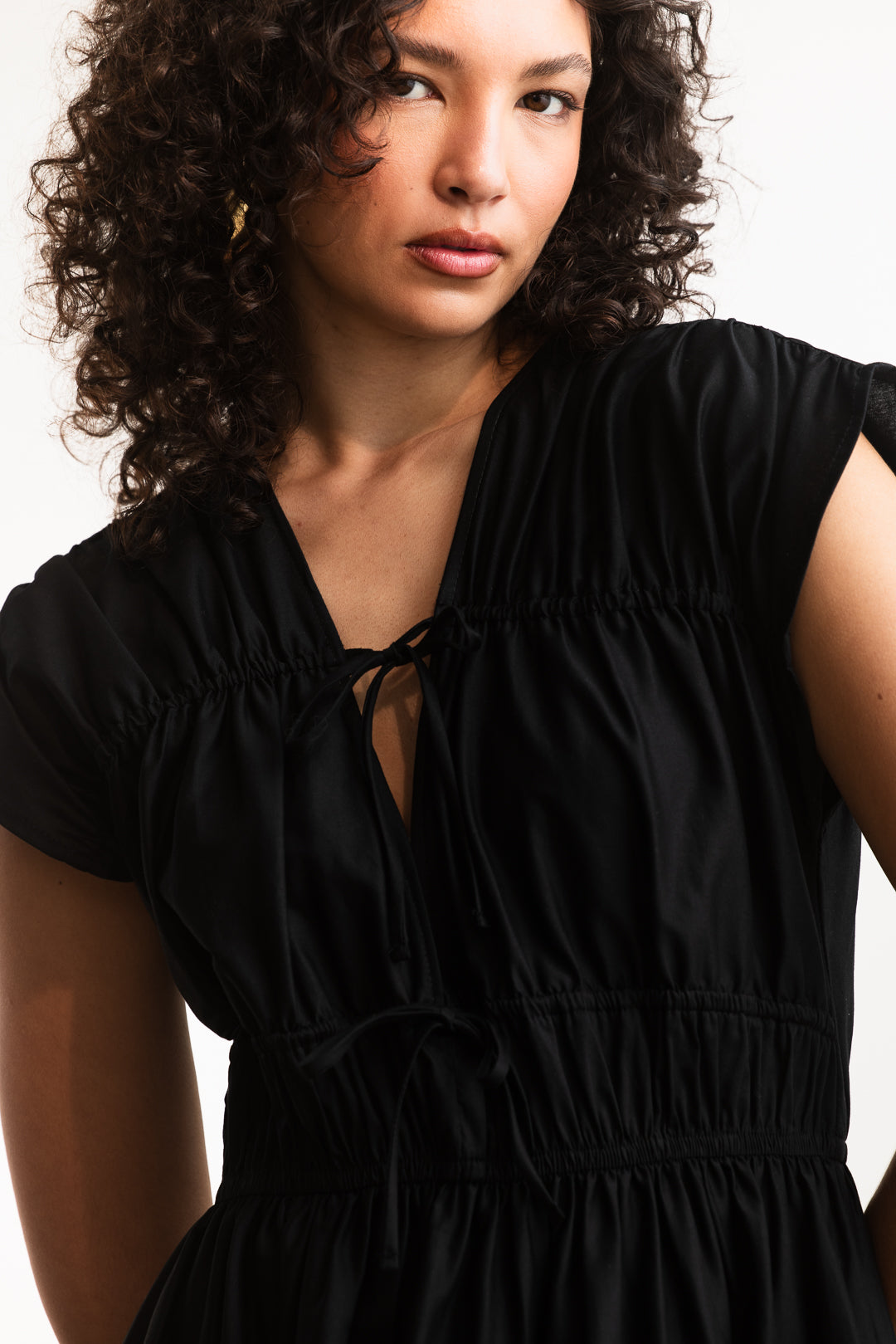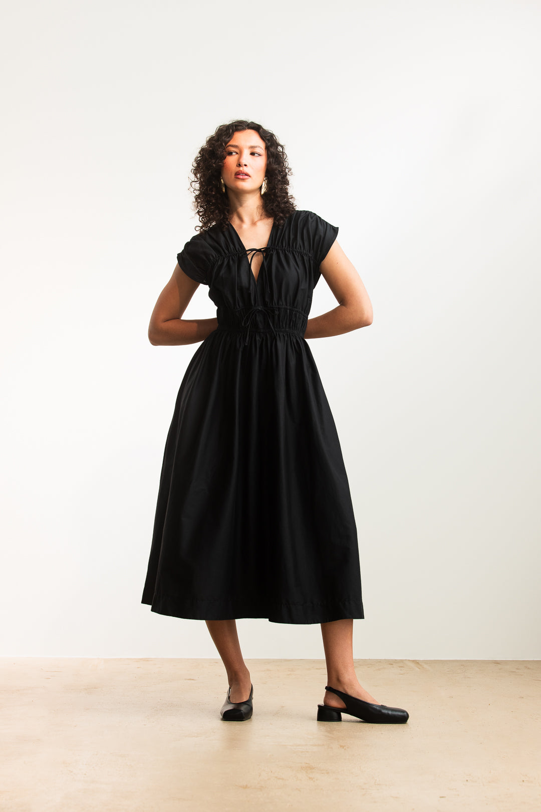 Our cap-sleeve midi dress features an elasticated bodice and waist for a shaped silhouette. The front is detailed with tie closures, allowing for an adjustable fit and subtle gathering. The dress falls into a softly flared A-line skirt, offering ease of movement. Designed with a wide neckline and a clean back finish, this style combines structure with comfort.