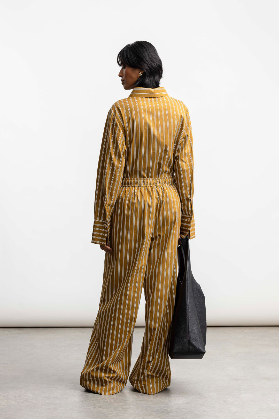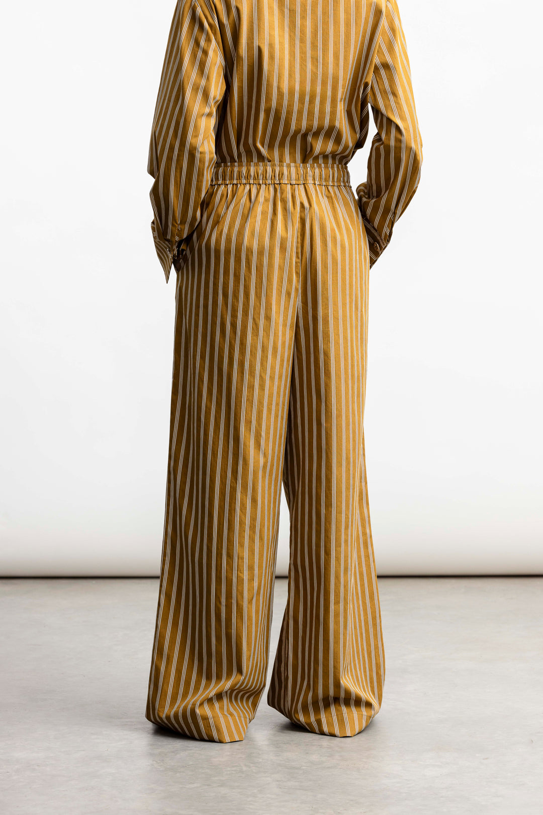 The ochre base with vertical stripes elongates the frame, while the wide hem adds a directional finish. Style with our matching shirt or contrast with clean basics.