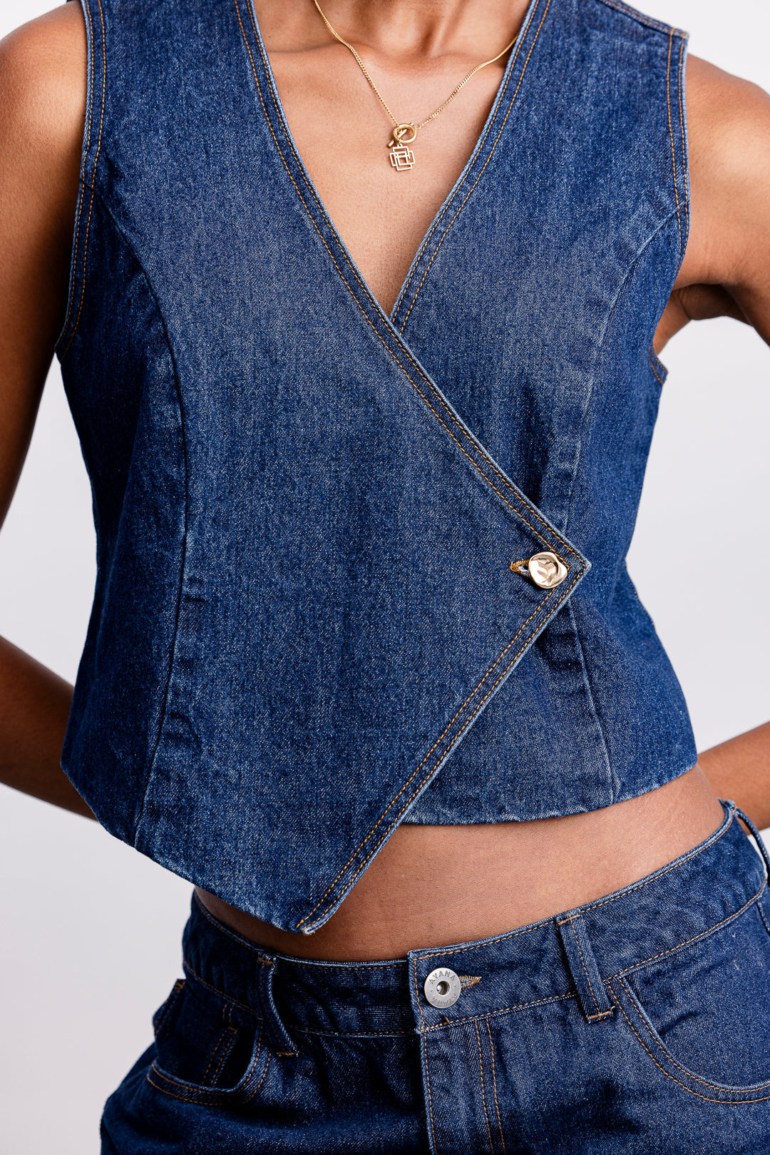 This denim waistcoat features an edgy asymmetrical front that adds a modern twist to a classic design. Gold organic shaped buttons create a sleek, seamless look, while the fully lined branded interior ensures comfort and a polished finish. Perfect for elevating any ensemble, it balances bold design with refined craftsmanship.