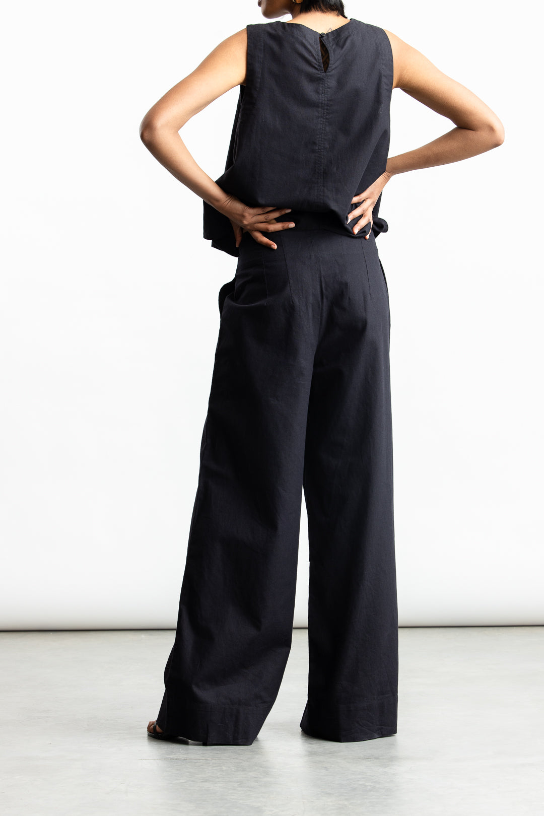 Meet sculptural elegance in these high-waisted, wide-leg pants. Designed with a grown-on waistband and tailored with front and double back darts, they offer a clean, elongated silhouette. Side entry pockets add discreet functionality, while the structured shape brings a refined, edge to modern tailoring.