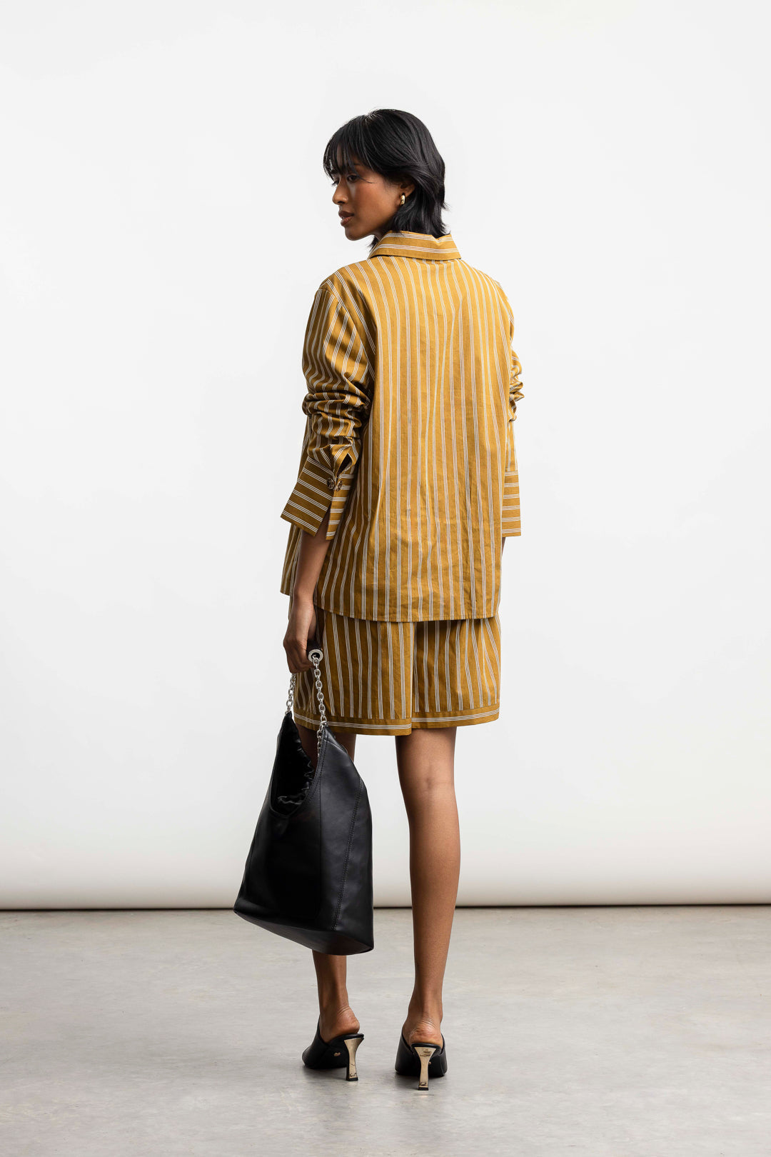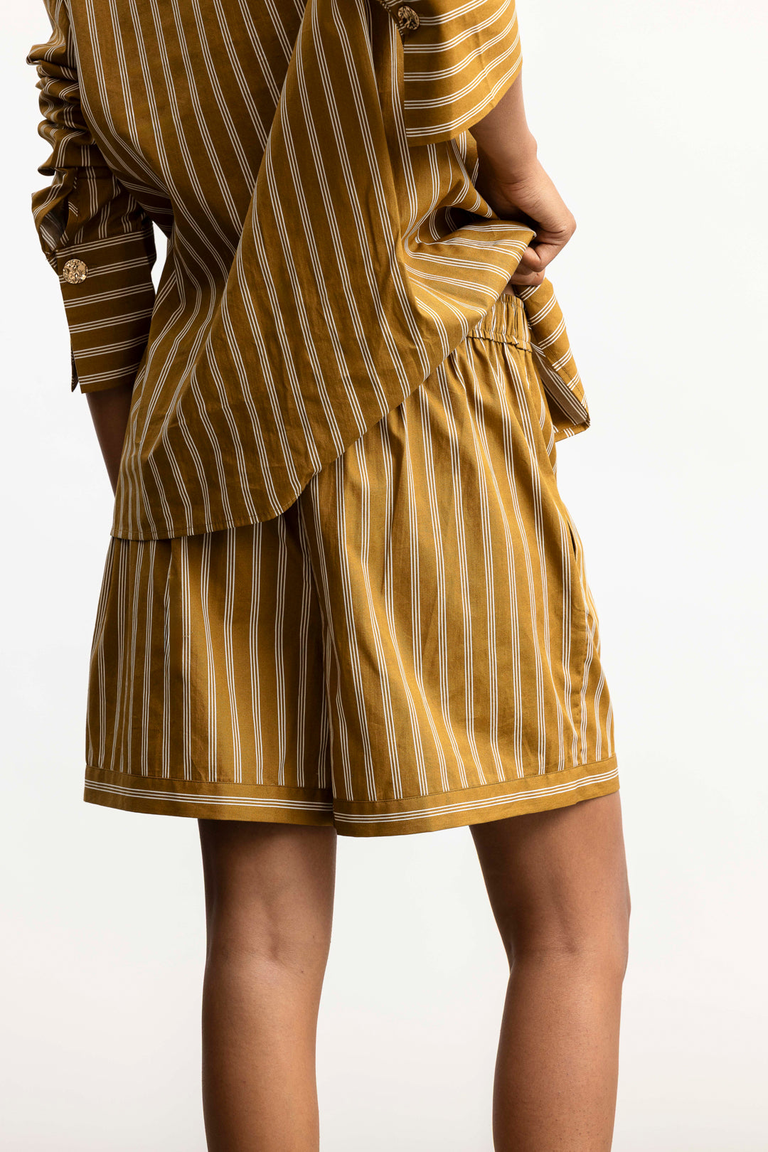Vertical stripes elongate the form, while the wide contrast hem adds a crisp tailored finish. Pair it with the coordinating shirt for a statement co-ord moment, or keep it simple with a tucked-in tank and sandals.