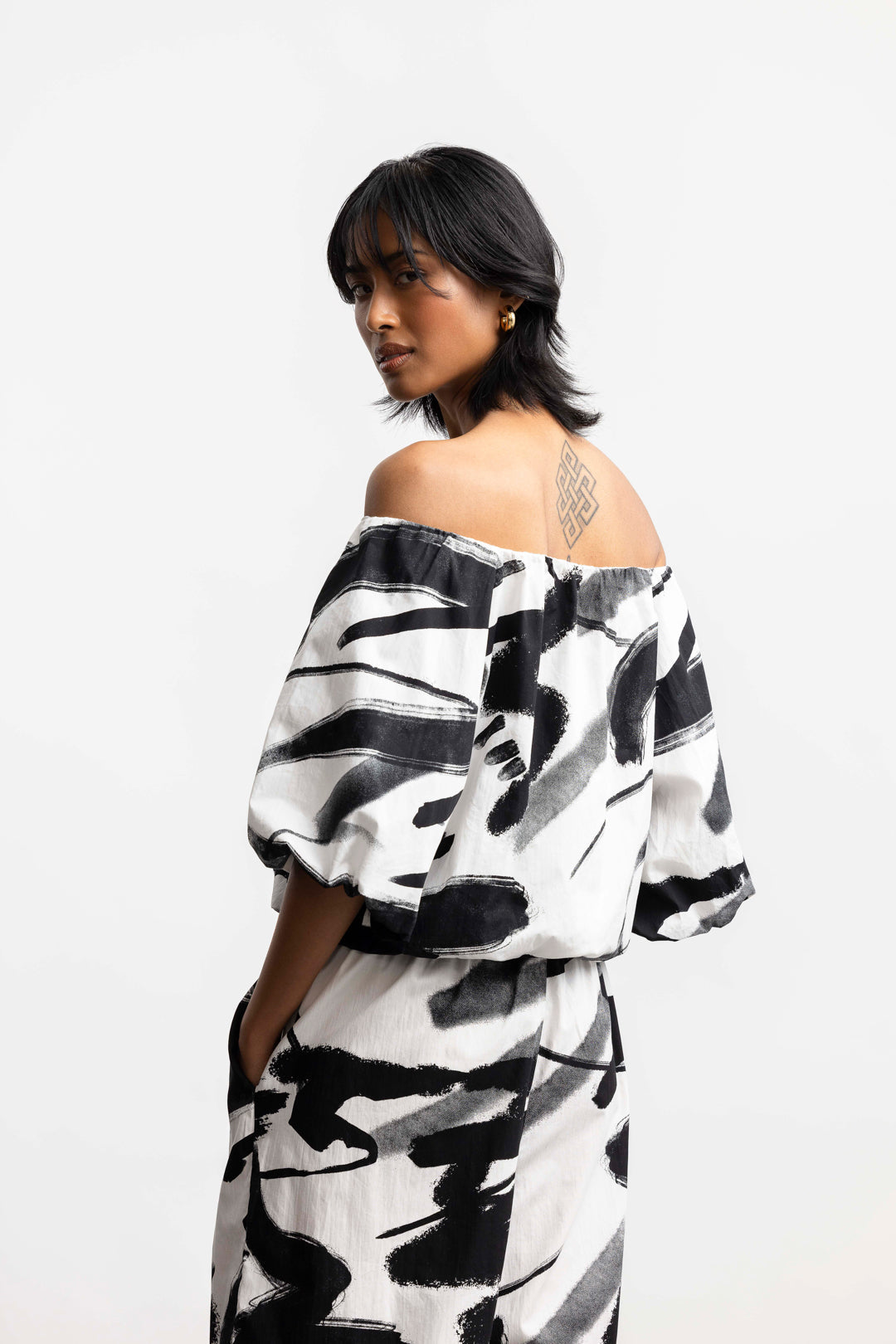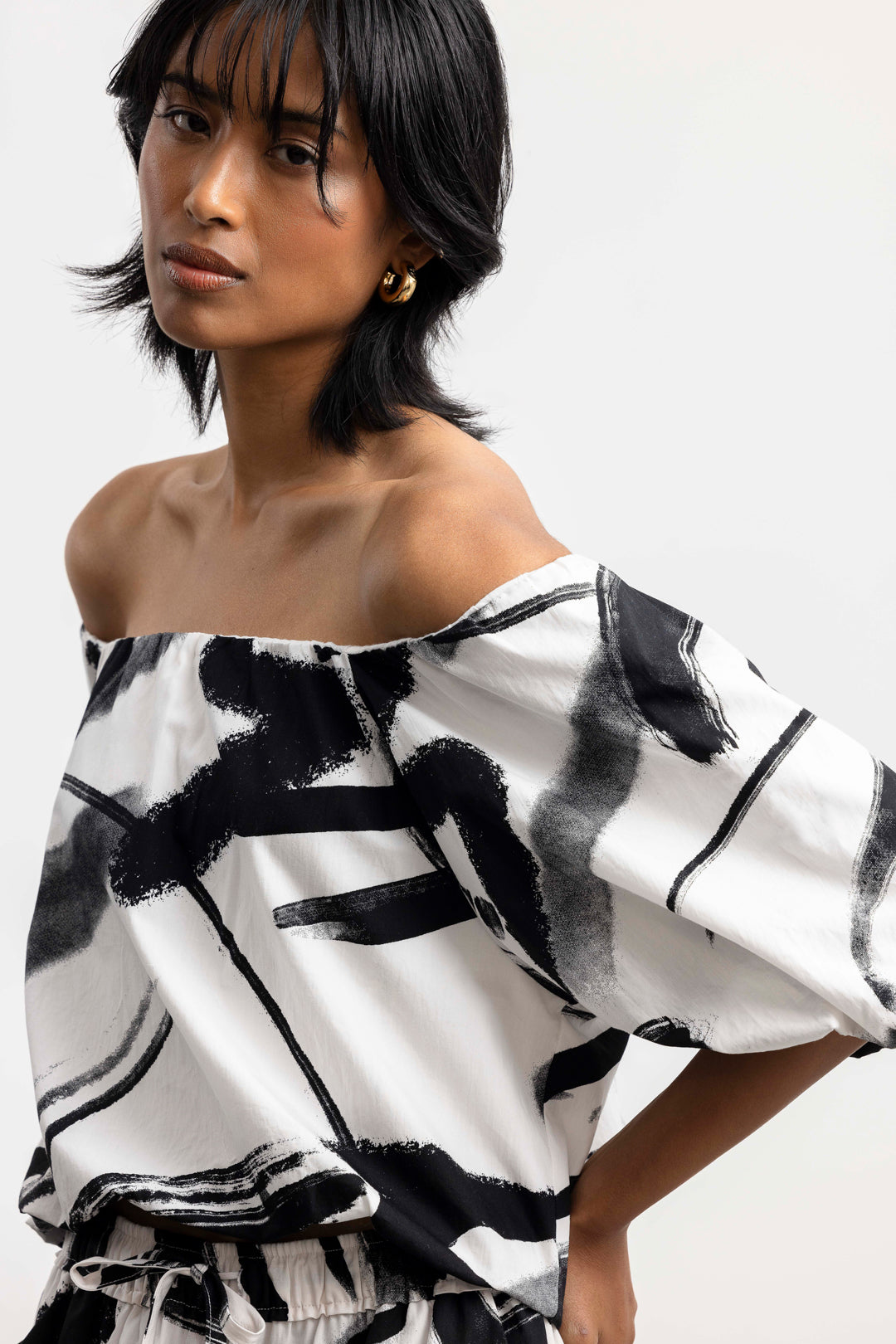 Crafted from 100% cotton poplin, this puff sleeve top brings volume, structure, and femininity into perfect balance. Designed with an elasticated neckline, it can be styled on or off the shoulder to suit your mood. Statement puff sleeves and a soft bubble hem create a playful, voluminous silhouette, while the breathable cotton keeps it light and comfortable. With its relaxed yet fashion-forward shape, this top is a standout piece that pairs effortlessly with both casual denim and dressier bottoms. A versatile addition to your wardrobe with an elevated edge.