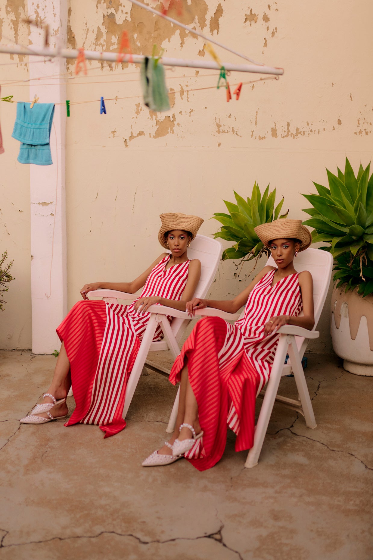 Bold and contemporary, this striped maxi dress is designed to make a statement. Featuring slim adjustable straps and a flattering V-neckline, it balances elegance with ease. The play on directional stripes creates a striking visual effect, with vertical panels elongating the silhouette and diagonal accents adding modern edge. A soft drape detail at the skirt enhances movement, while the asymmetric hemline gives the piece a unique finish. Perfect for summer occasions, resort wear, or evening events, this dress pairs effortlessly with minimal accessories and strappy sandals for a polished look.