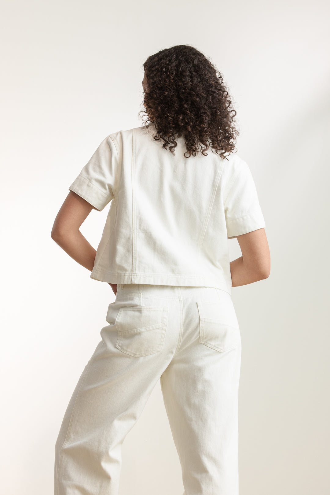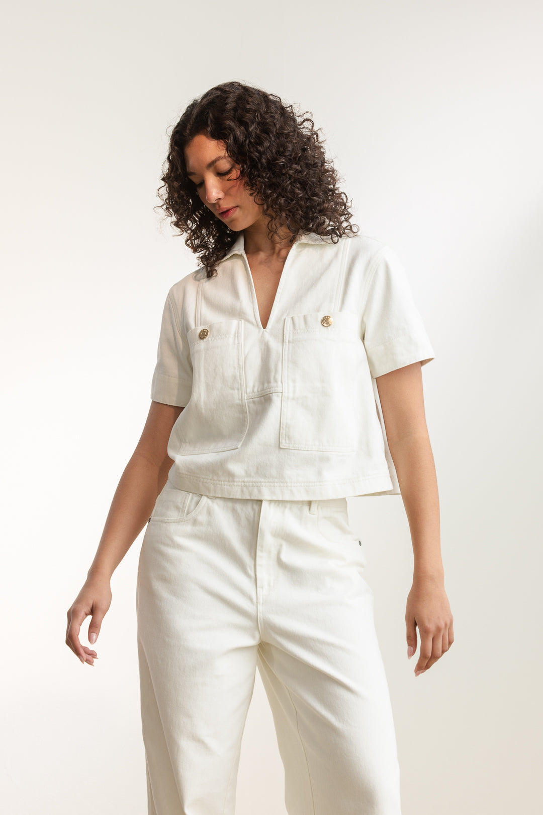 This denim pop over top offers a contemporary take on workwear-inspired style. Cut from sturdy indigo denim, it features a relaxed, boxy silhouette with a deep V-neckline framed by a structured collar. Statement contrast stitching highlights the construction lines, while two oversized front patch pockets with metal button details add both function and visual interest. The wide, sleeves enhance its easy, laid-back feel, making it perfect for layering over trousers or pairing with matching denim for a coordinated look.