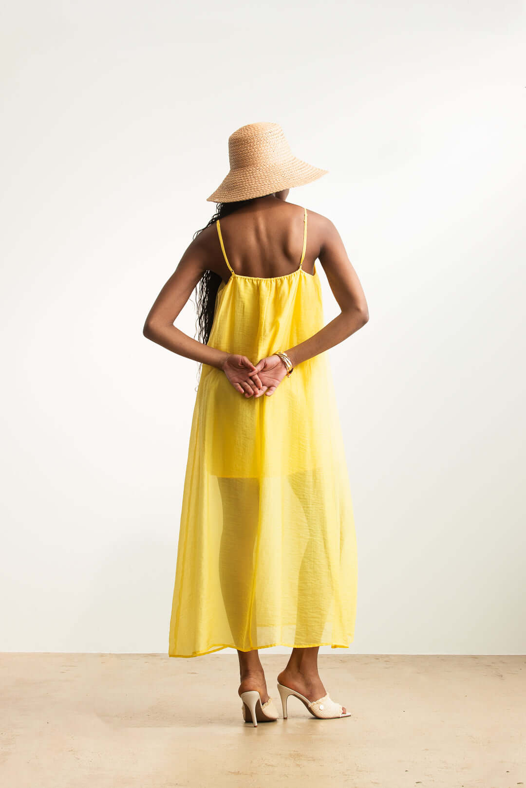 This effortlessly chic long strappy dress, crafted from a lightweight semi-sheer fabric, features a relaxed, boxy silhouette that drapes beautifully over the body. The dress is lined for ease and modesty, while the adjustable straps offer a customizable fit. Perfect for warm days or layered looks, this versatile piece balances minimalism with an understated elegance.