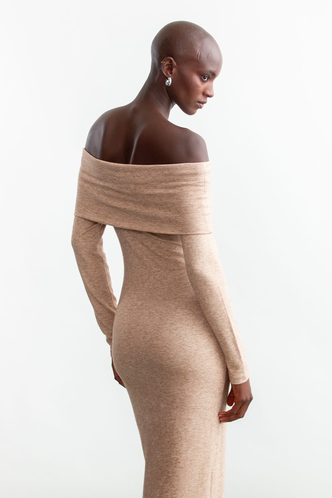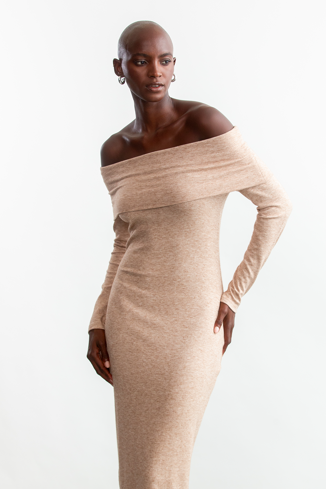 This long-sleeve, off-the-shoulder maxi knit dress is a striking, body-hugging design crafted in a cut-and-sew fabrication. The off-the-shoulder neckline adds a touch of elegance and allure, while the sleek, fitted silhouette contours the body beautifully. Perfect for making a statement, this dress combines modern sophistication with a bold, confident style