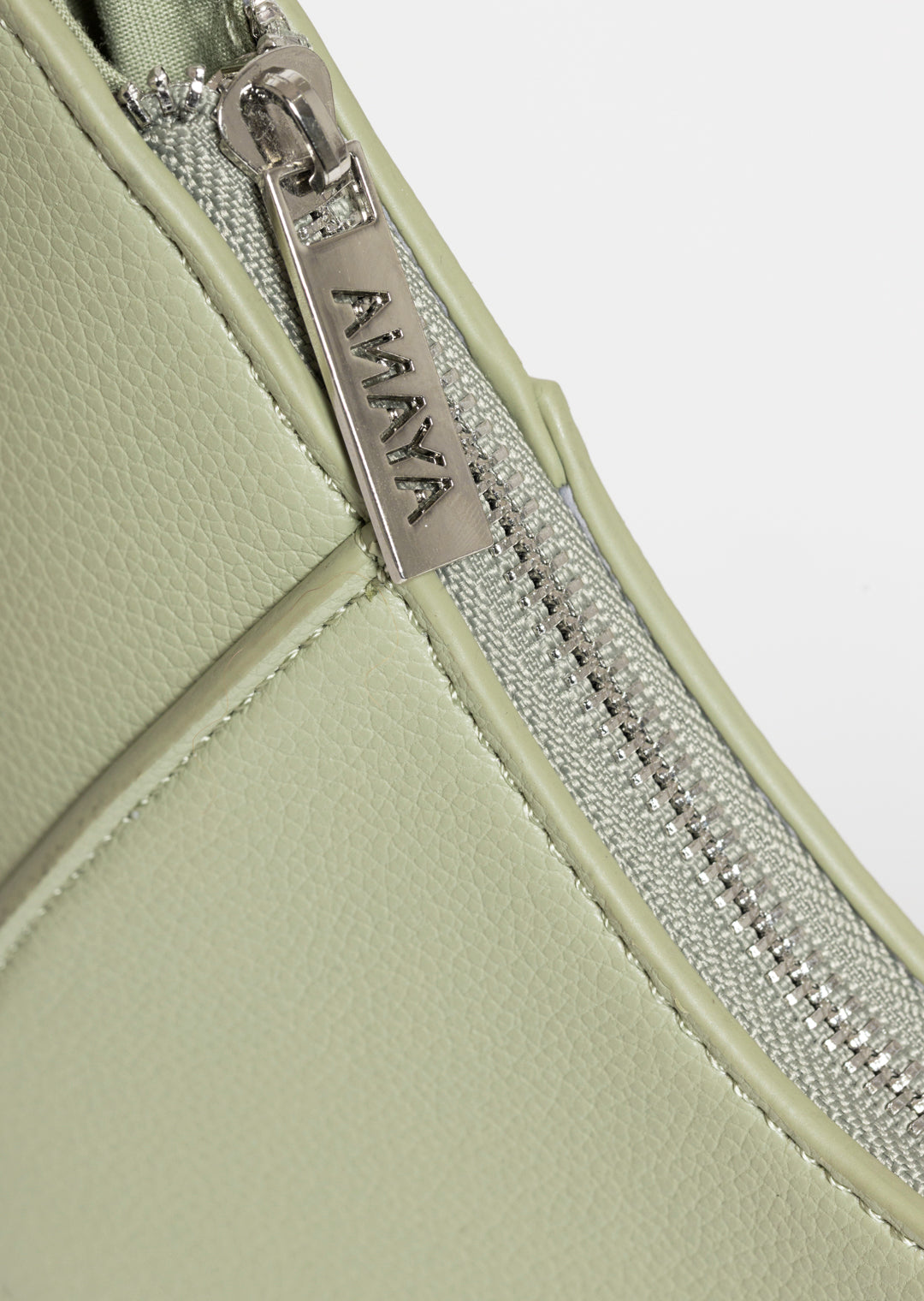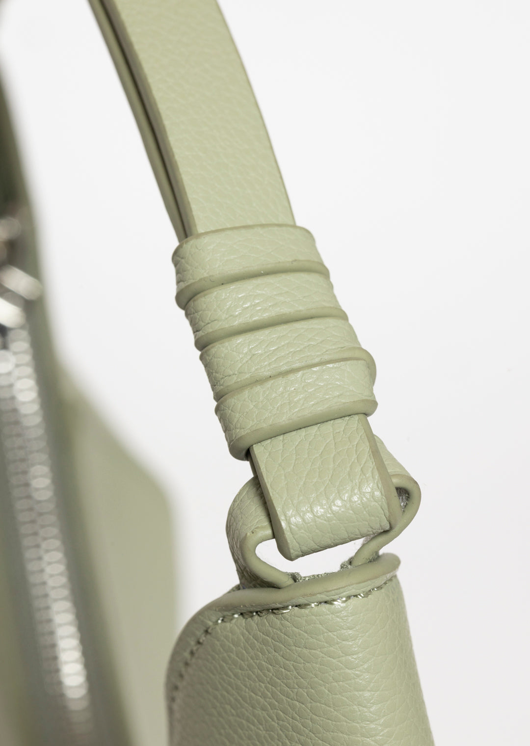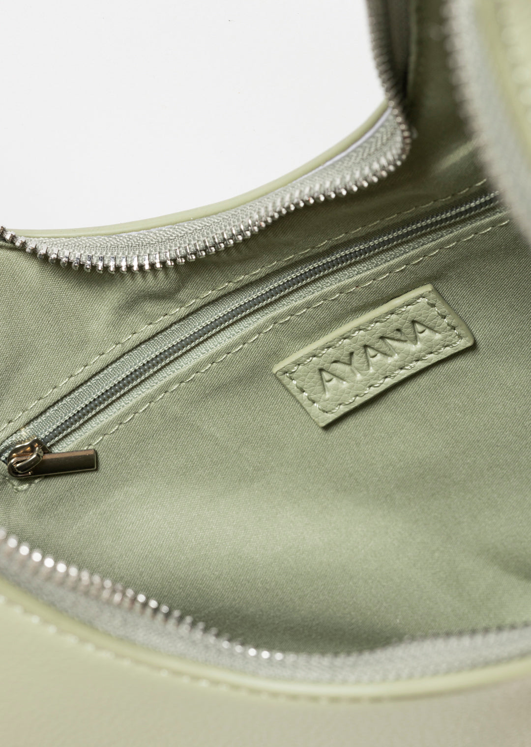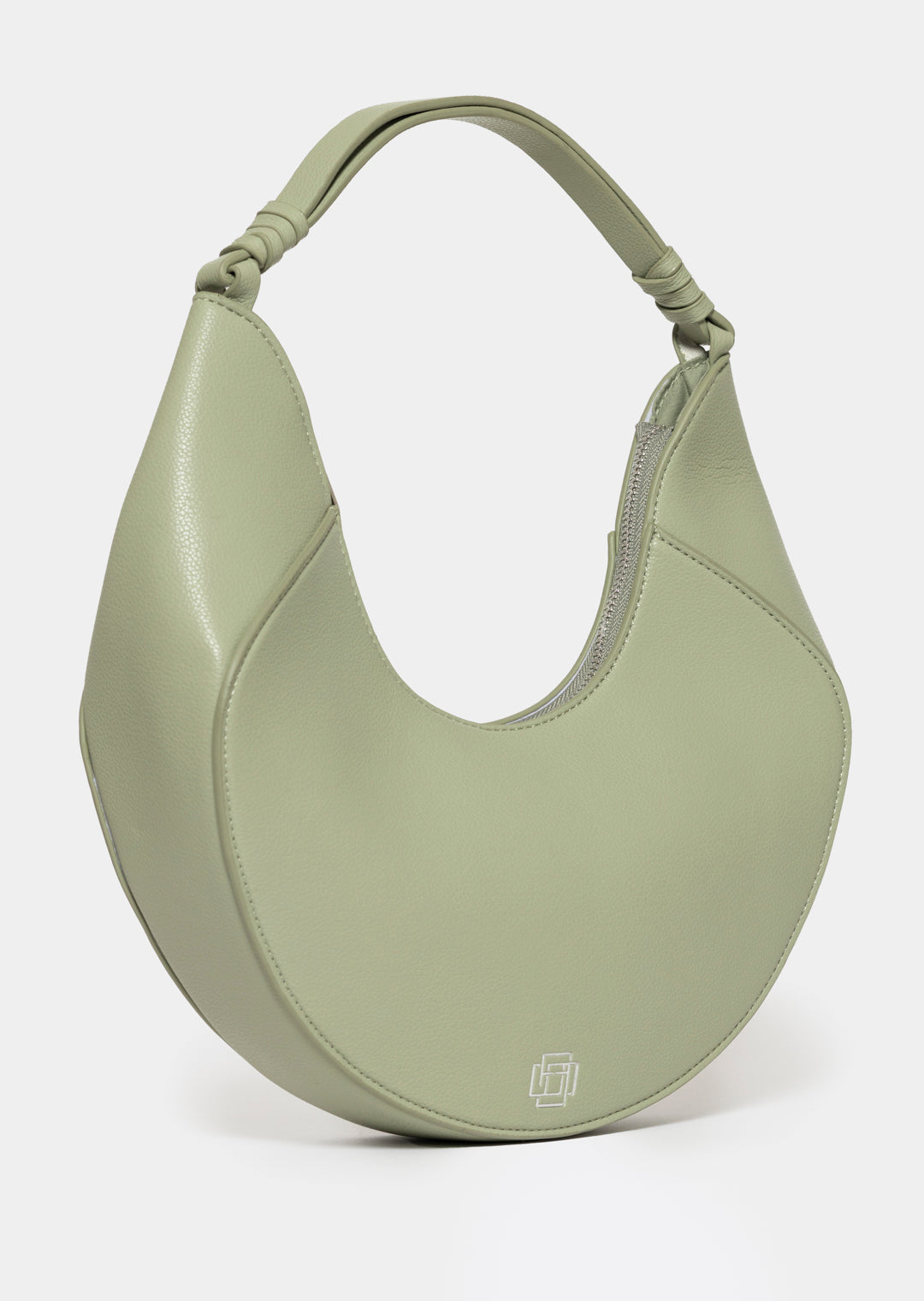 A modern statement piece defined by its sculptural round silhouette and meticulous panel lines accentuated with topstitching. The design features a gleaming gold zip with a branded puller, complemented by subtle gold embossed branding on the front. Inside, a spacious lined interior offers practical elegance, complete with a pocket adorned with a branded patch label.