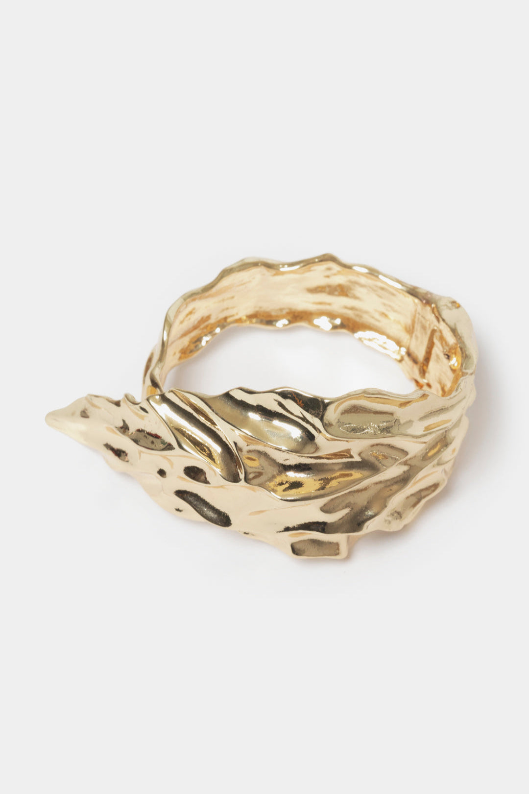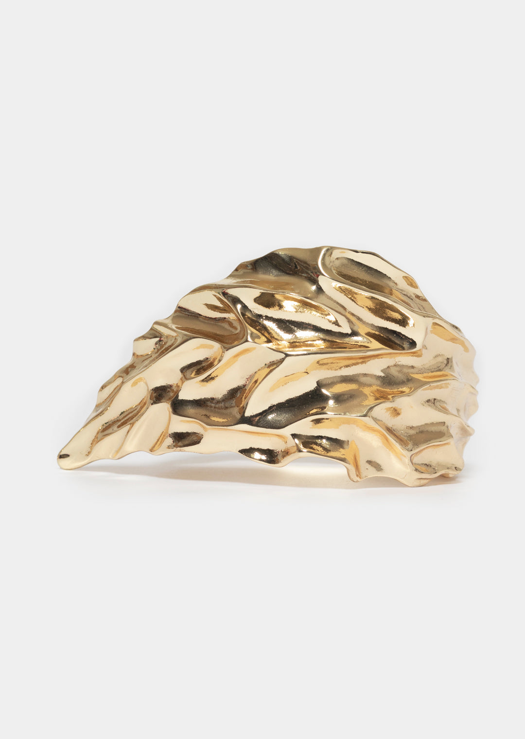 This chunky gold cuff features sculptural folded leaf contours, exuding organic elegance and modern edge. Designed with an open silhouette for adjustable comfort, it’s a striking accessory that commands attention.