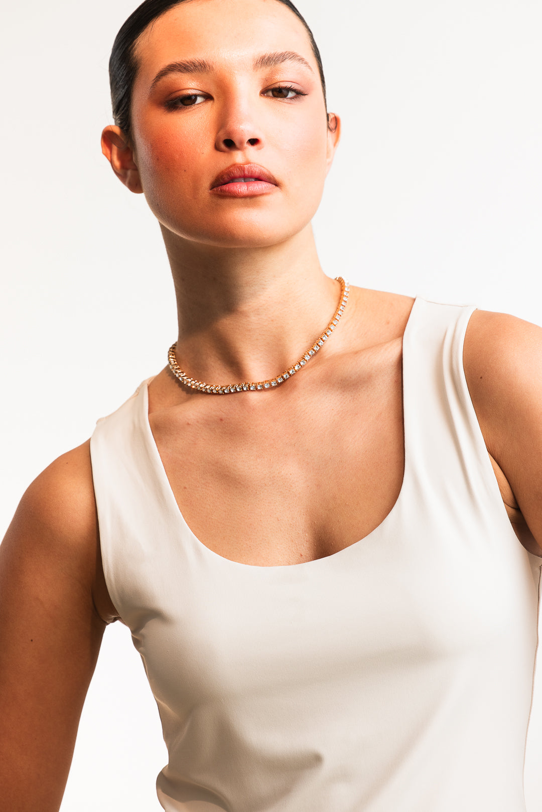 A true everyday essential, this tank top is designed with a flattering scoop neckline and a sleek, body-skimming fit. Crafted from a soft, stretch fabric, it offers both comfort and versatility, making it perfect for layering or wearing on its own. The clean silhouette makes it easy to pair with everything from tailored trousers to casual denim or summer skirts. A timeless staple that blends simplicity and ease, this tank is the ultimate go-to piece for effortless dressing.