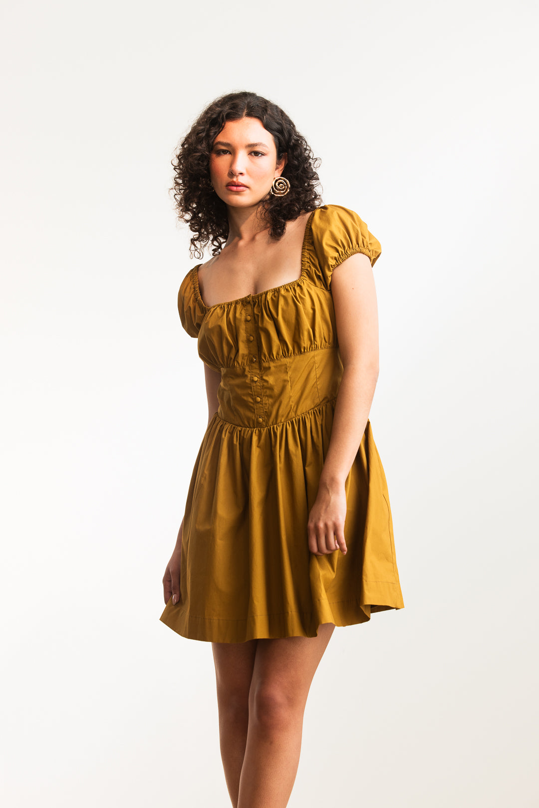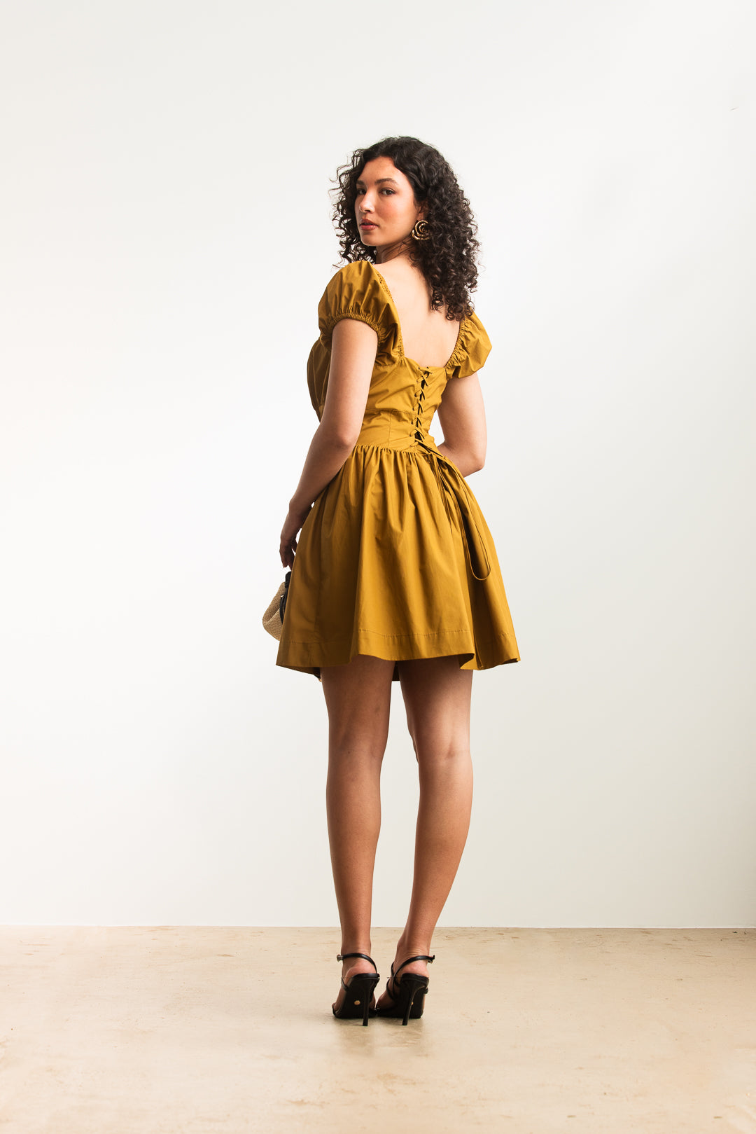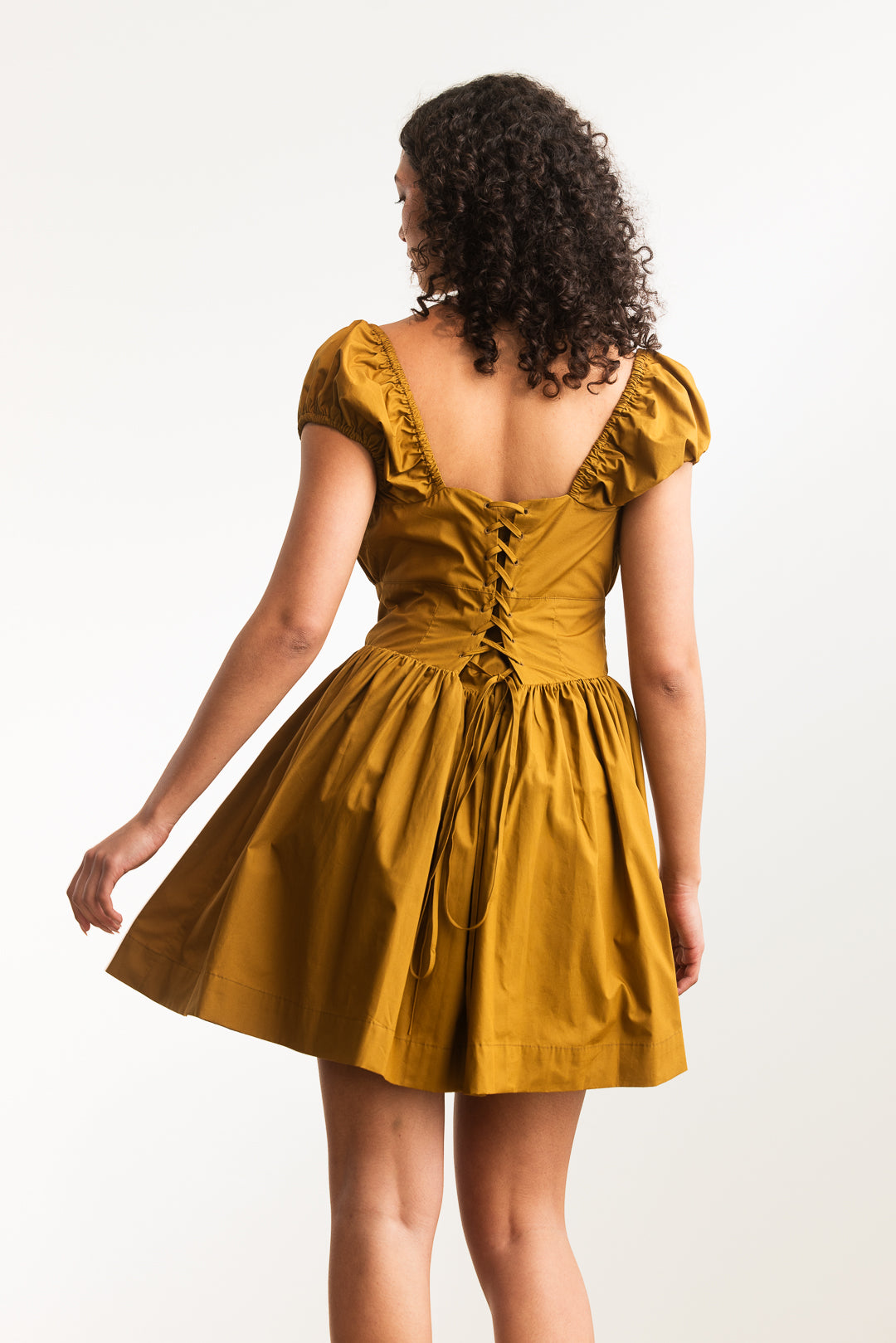 Romantic and feminine, this dress is designed to flatter while offering a touch of vintage-inspired charm. The square neckline frames the décolletage beautifully, complemented by softly ruched puff sleeves that add volume and elegance. A fitted bodice with button-down detail creates structure at the front, while the lace-up corset design at the back provides both adjustability and a delicate, eye-catching finish. The skirt flows gently into a flattering A-line silhouette, making it versatile for both daytime and evening occasions. Pair it with sandals for a sweet casual look or elevate it with heels and accessories for a dressed-up ensemble.