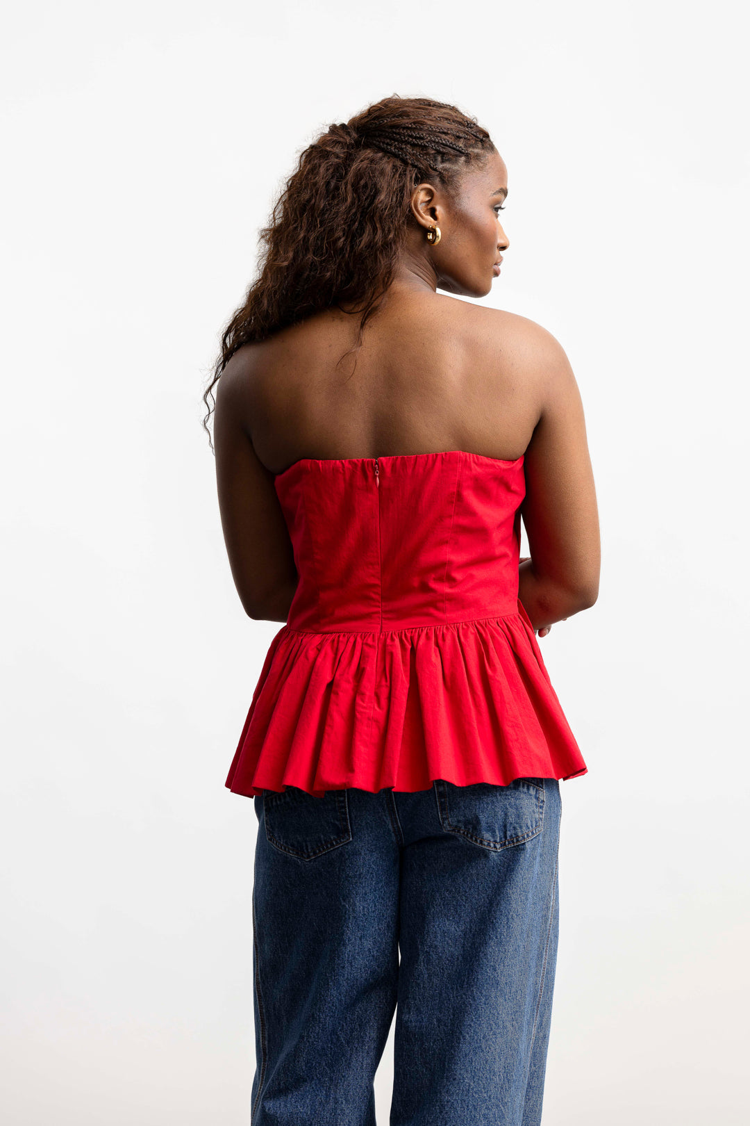 This strapless top makes a bold statement with its sculptural silhouette and considered detailing. Crafted from a structured fabric, it features delicate vertical pleating through the bodice that creates texture and shape, before flaring into a voluminous peplum hem for added drama. Designed to highlight the shoulders and collarbone, it’s a striking piece that transitions seamlessly from day to night. Pair it with denim for an effortlessly chic daytime look, or style with tailored trousers and heels for a polished evening ensemble.