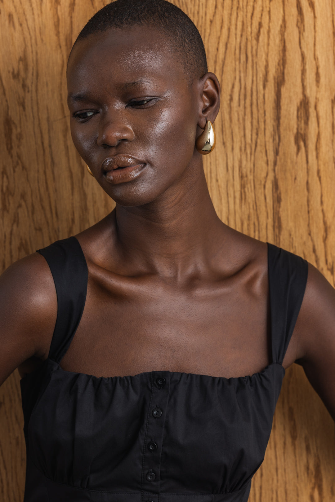 This midi dress features a softly structured bodice with wide shoulder straps and a flattering gathered skirt for added volume. Designed with a fitted waist, it is finished with a corset-style lace-up back that allows the waist to be cinched for an adjustable fit. The front maintains a clean, button-through finish, while the overall silhouette balances structure with softness. An effortless style suitable for both day and evening wear.
