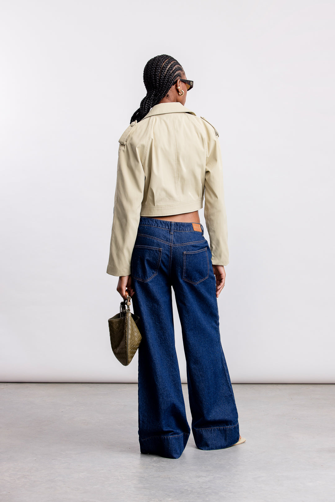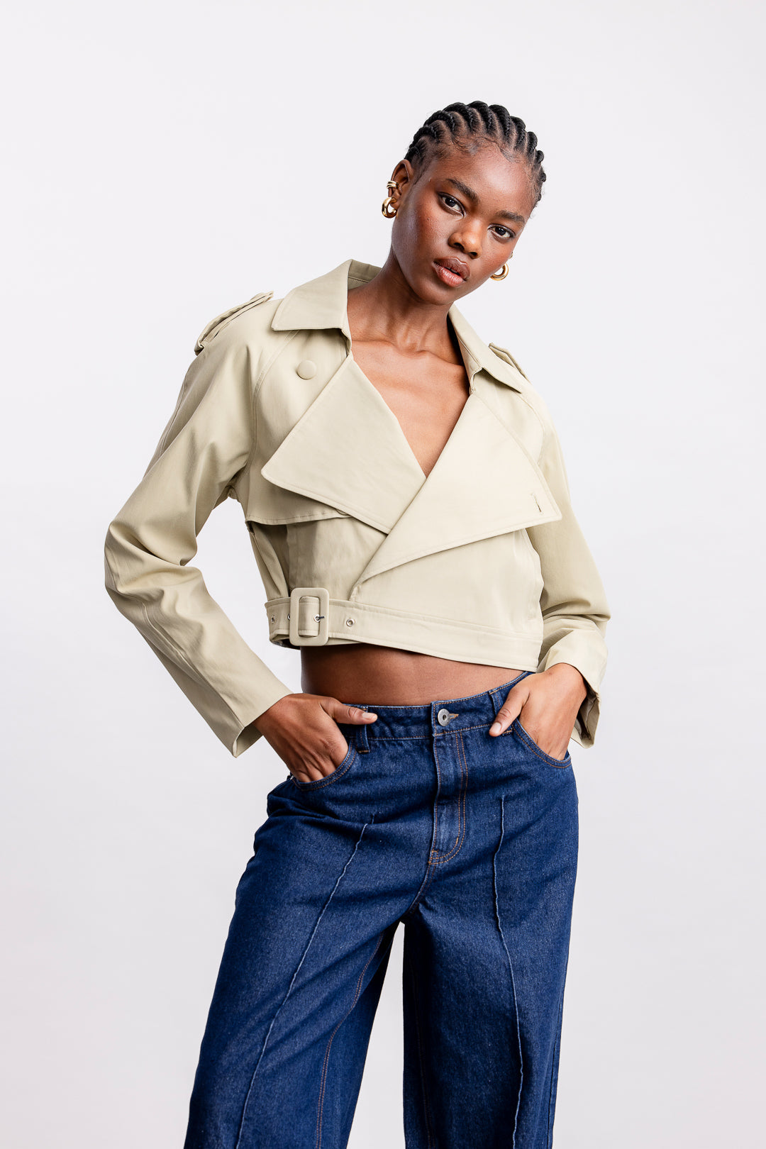 This cropped trench coat offers a fresh, modern update to a timeless outerwear staple. Designed with a shortened silhouette, it maintains the classic trench elements while introducing a contemporary edge. The standout feature is the belt detail at the hem, adding a unique, cinched finish that enhances the shape and creates a refined, tailored look. Crafted for both style and versatility, this piece is ideal for transitional weather and pairs effortlessly with high-waisted bottoms or layered over dresses for a balanced, fashion-forward ensemble.