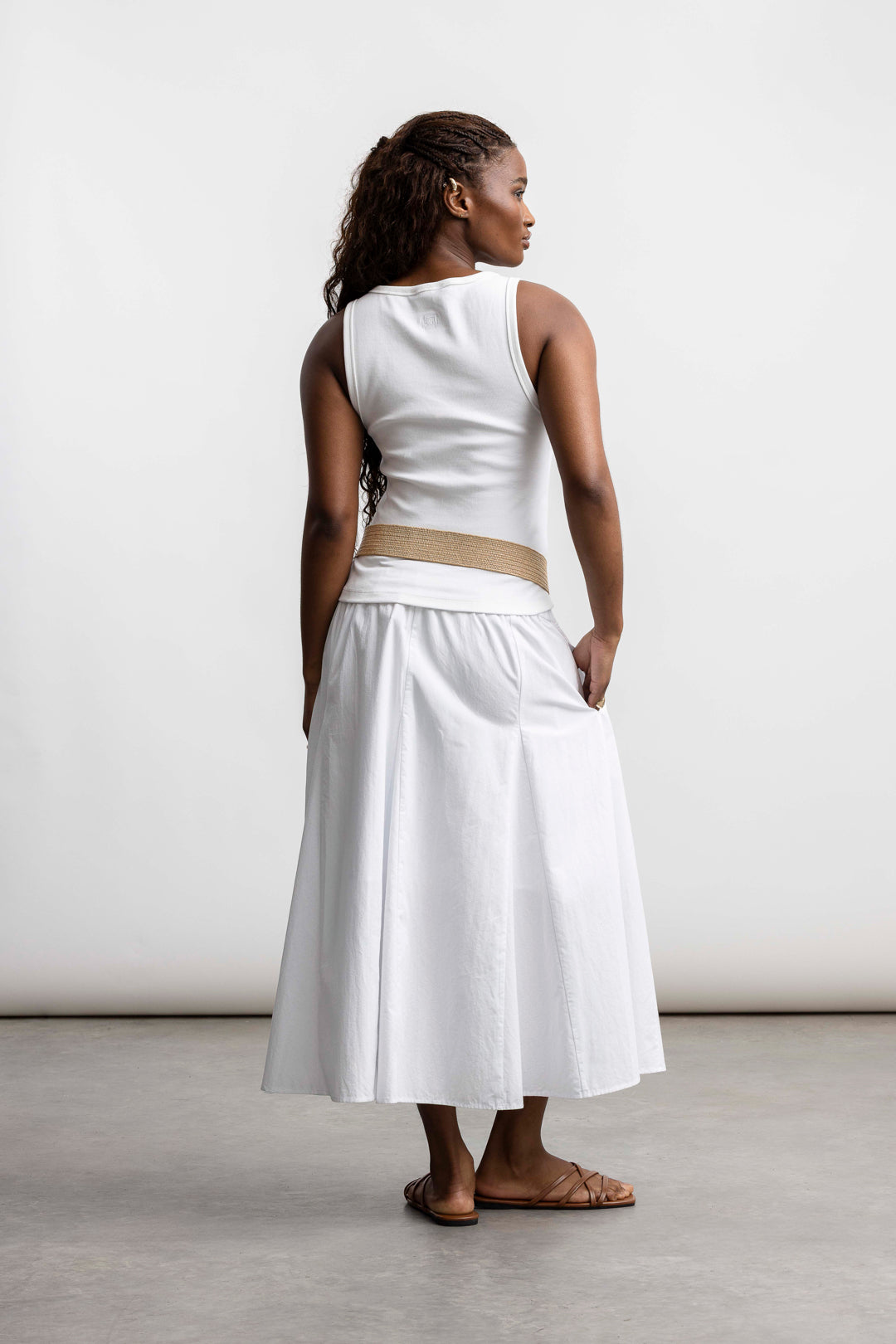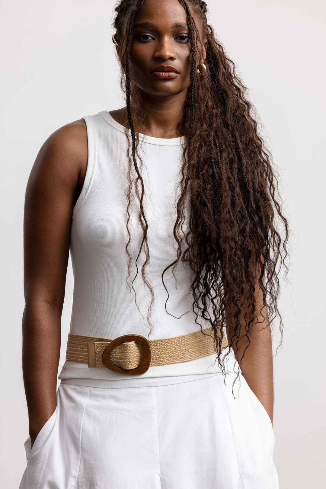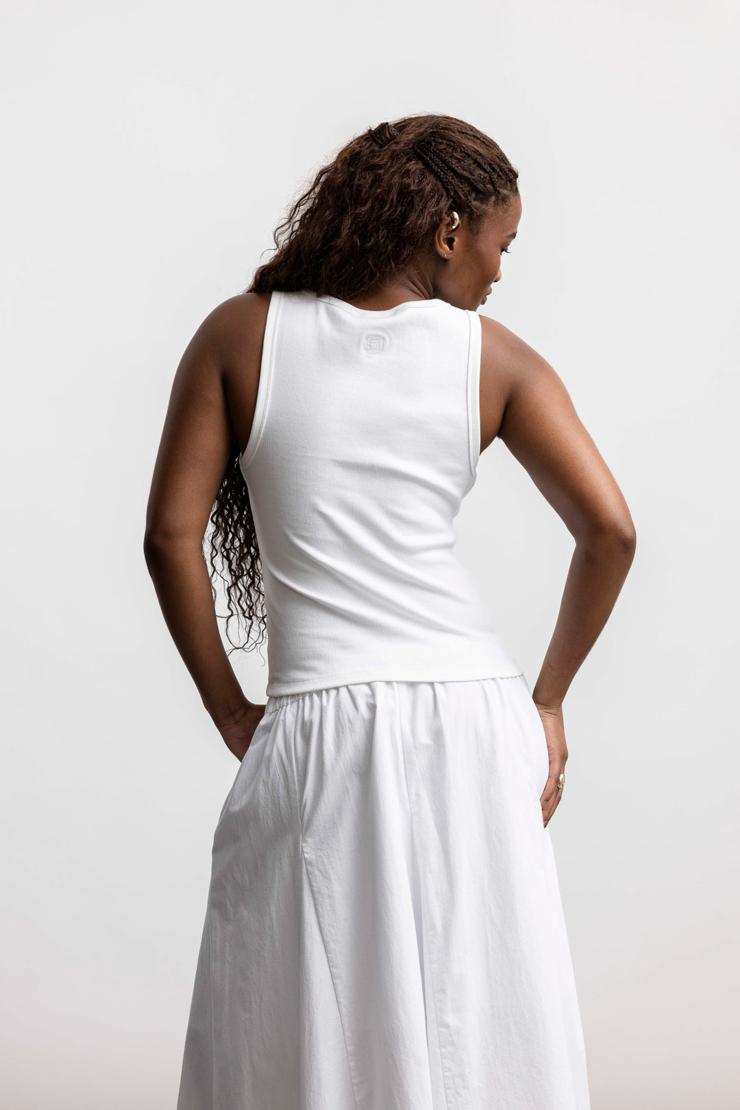 A wardrobe essential with a modern twist — this ribbed vest combines comfort and versatility in one sleek silhouette. Crafted from a soft, stretchy rib-knit fabric, it contours to the body for a flattering, close fit. Featuring a classic scoop neckline and wide shoulder straps, it’s perfect for layering or wearing solo. A subtle tonal embroidery at the center back adds an elevated, considered touch. Dress it up with tailored trousers or keep it casual with your favorite denim. A timeless piece designed for effortless everyday styling.